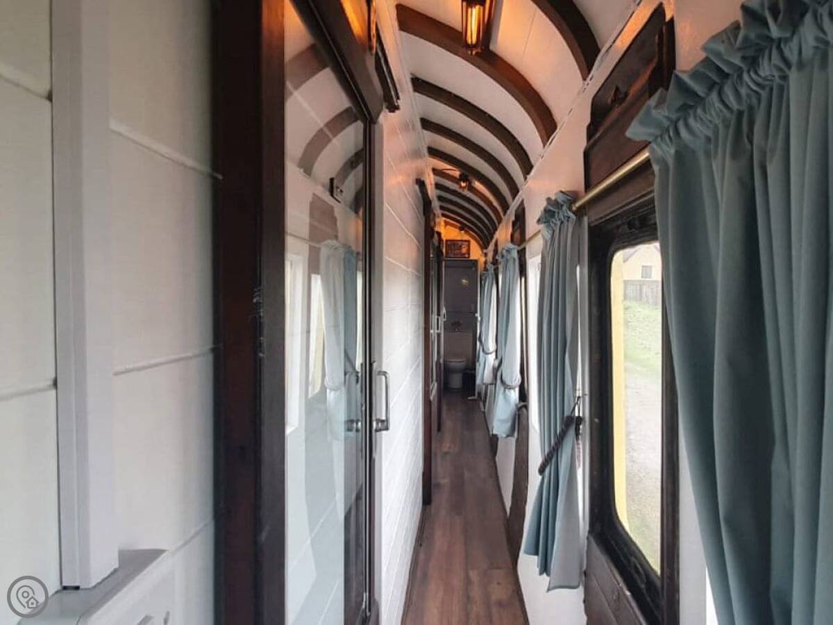 The layout is exactly what you'd expect from a railway carriage. It's one long space. You come in at one end into the living and dining area, then there's the kitchen, then the bedrooms down the hallway, with the bathroom at the far end. The hallway is narrow. It's a railway carriage.