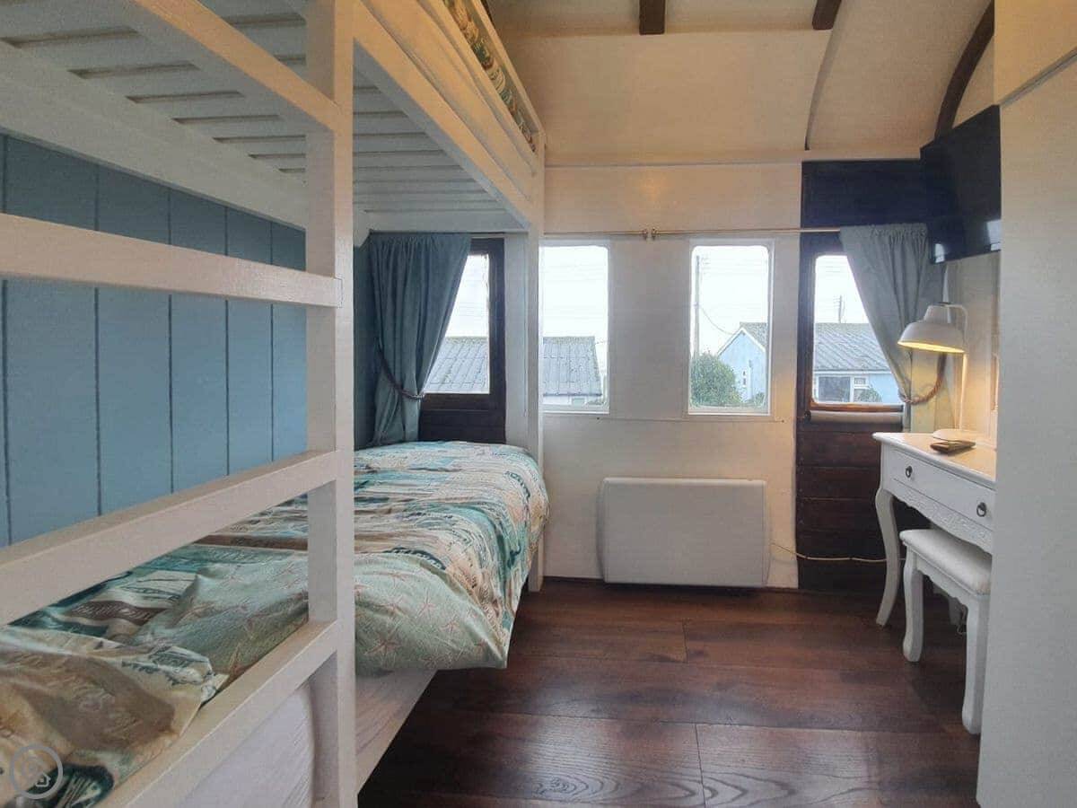 It sleeps six. There are three bedrooms. One is a small double, and the other two have bunk beds. They all look out over the track and the sea. There's one bathroom with a shower. It's got a 4 Star rating. We restored it properly in 2020, so everything works.