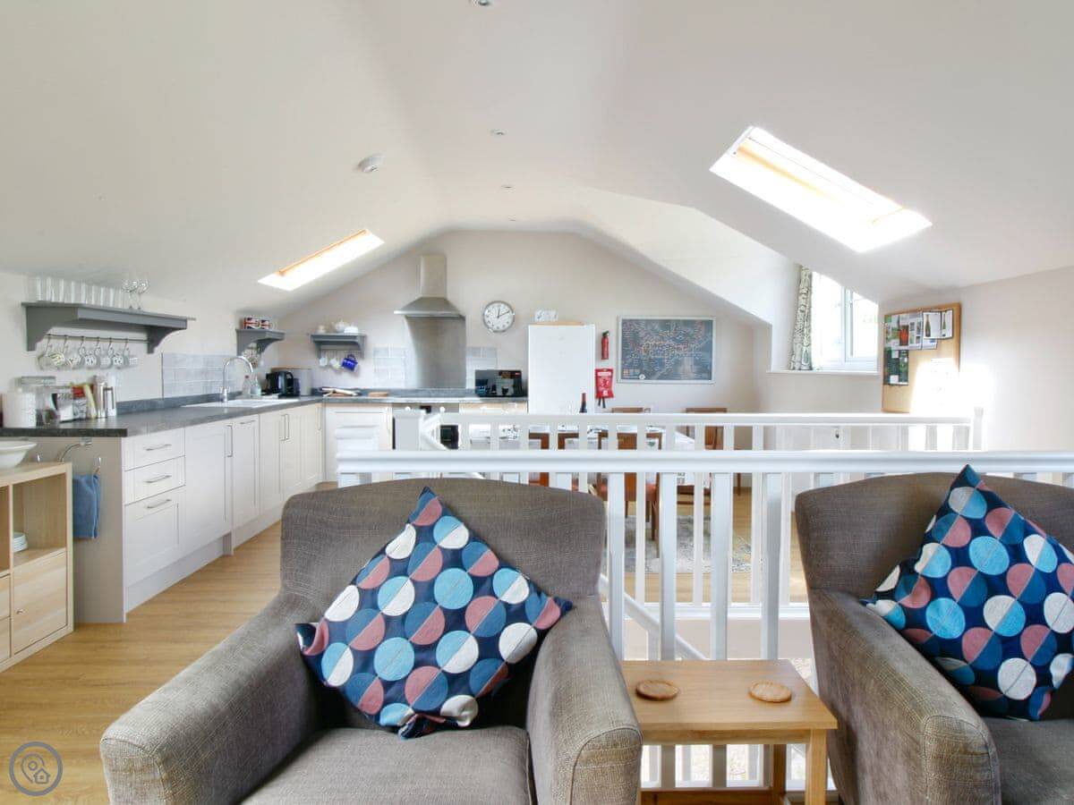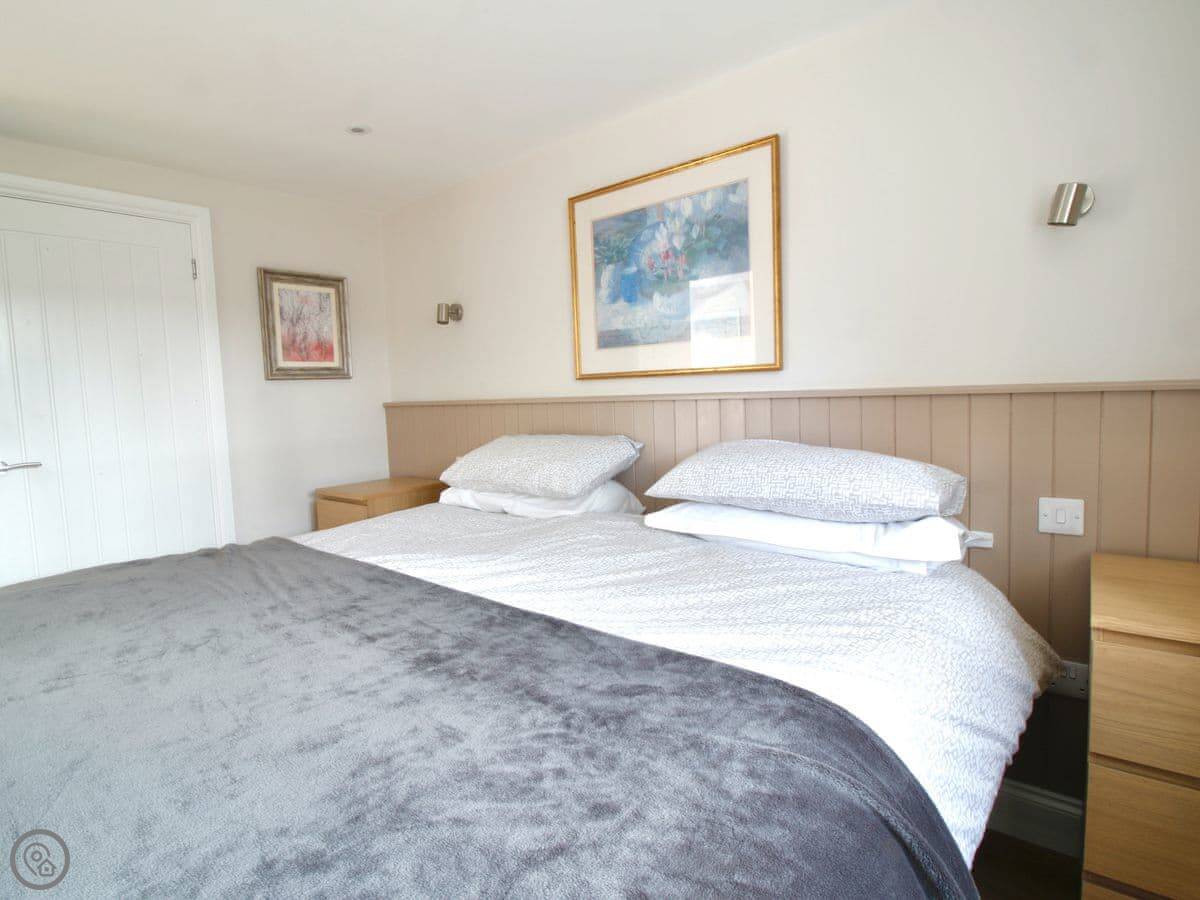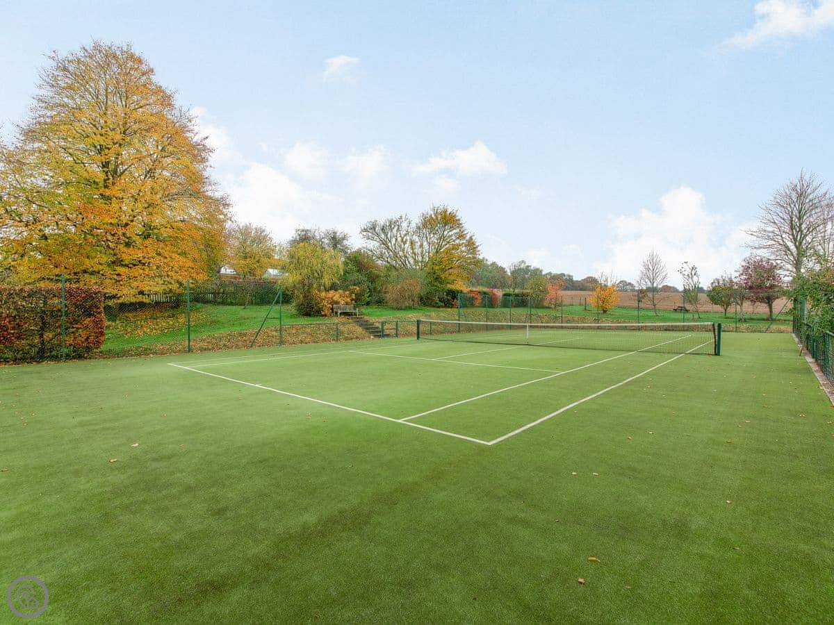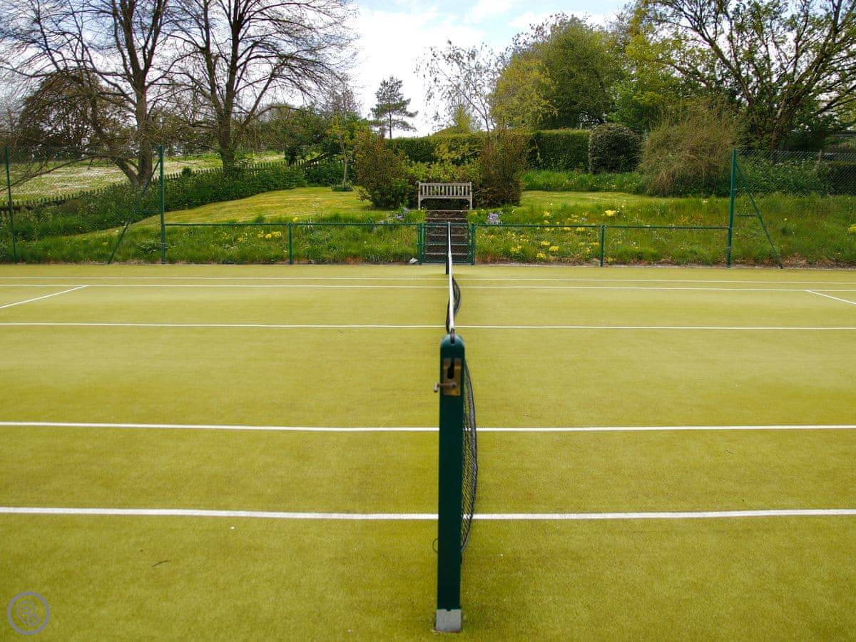 The living room and dining room are on the first floor and feature gorgeous views across the surrounding fields. Skylights and large windows make everything bright and airy. The two double bedrooms are downstairs, both with their own bathrooms. The second bedroom has a zip and link, providing options for groups. There is plenty of parking space outside, in front of the barn. There is also a woodshed for storing bikes, and an outside tap for cleaning dogs, wellies or other outdoor bits and bobs. The back garden has a patio with outside furniture for relaxing in the rural environs, and being fully enclosed is ideal for dogs or children. Best of all, perhaps, there is an Astroturf tennis court on site, so bring your racquets and book a time with the owners.