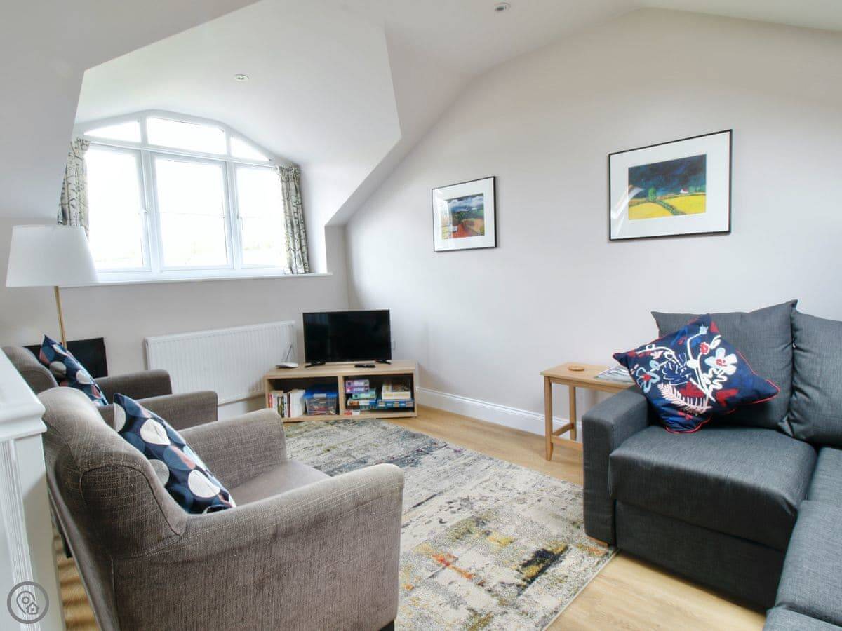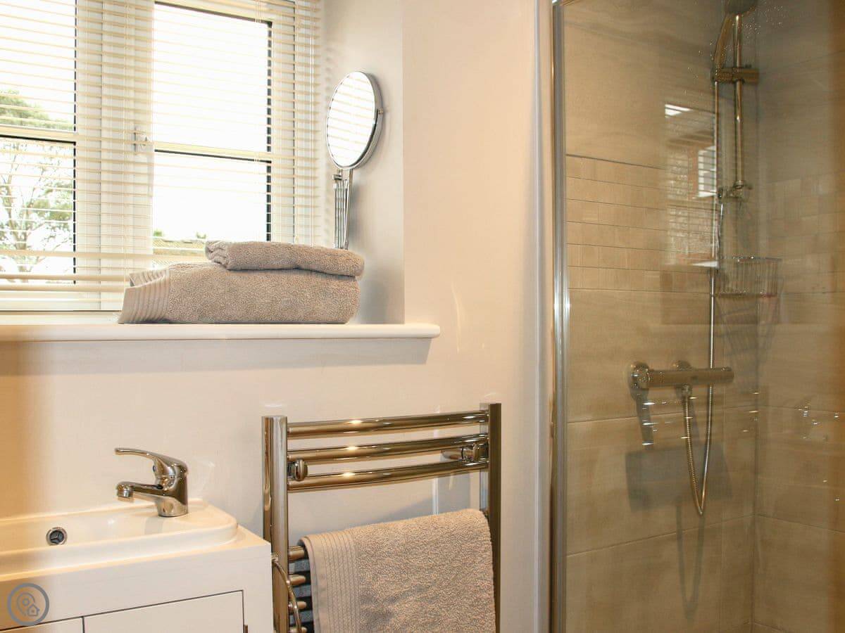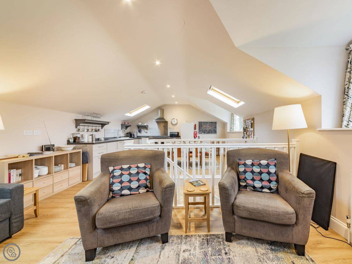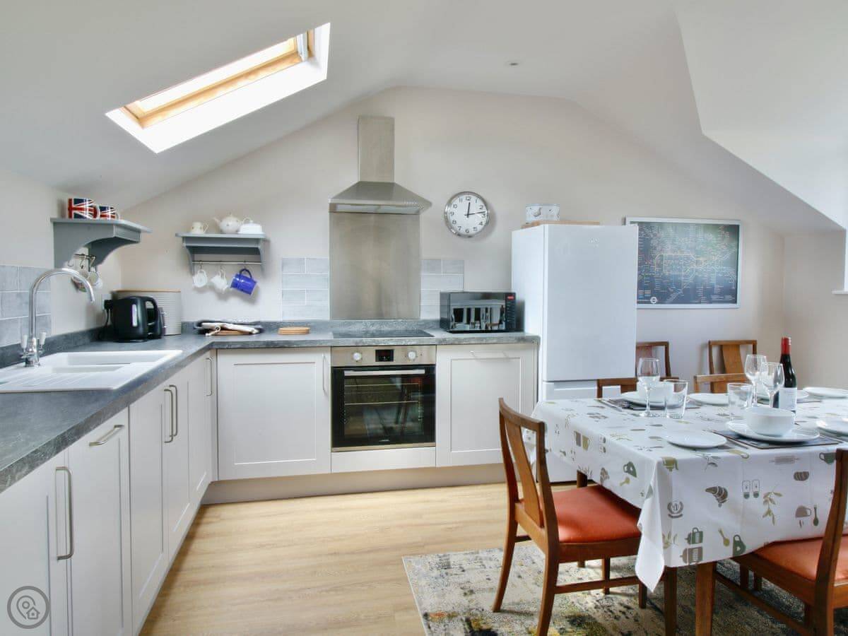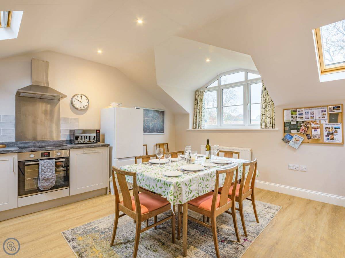 The living room and dining room are on the first floor and feature gorgeous views across the surrounding fields. Skylights and large windows make everything bright and airy. The two double bedrooms are downstairs, both with their own bathrooms. The second bedroom has a zip and link, providing options for groups. There is plenty of parking space outside, in front of the barn. There is also a woodshed for storing bikes, and an outside tap for cleaning dogs, wellies or other outdoor bits and bobs. The back garden has a patio with outside furniture for relaxing in the rural environs, and being fully enclosed is ideal for dogs or children. Best of all, perhaps, there is an Astroturf tennis court on site, so bring your racquets and book a time with the owners.