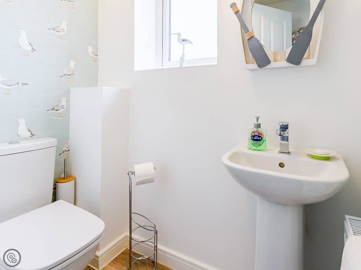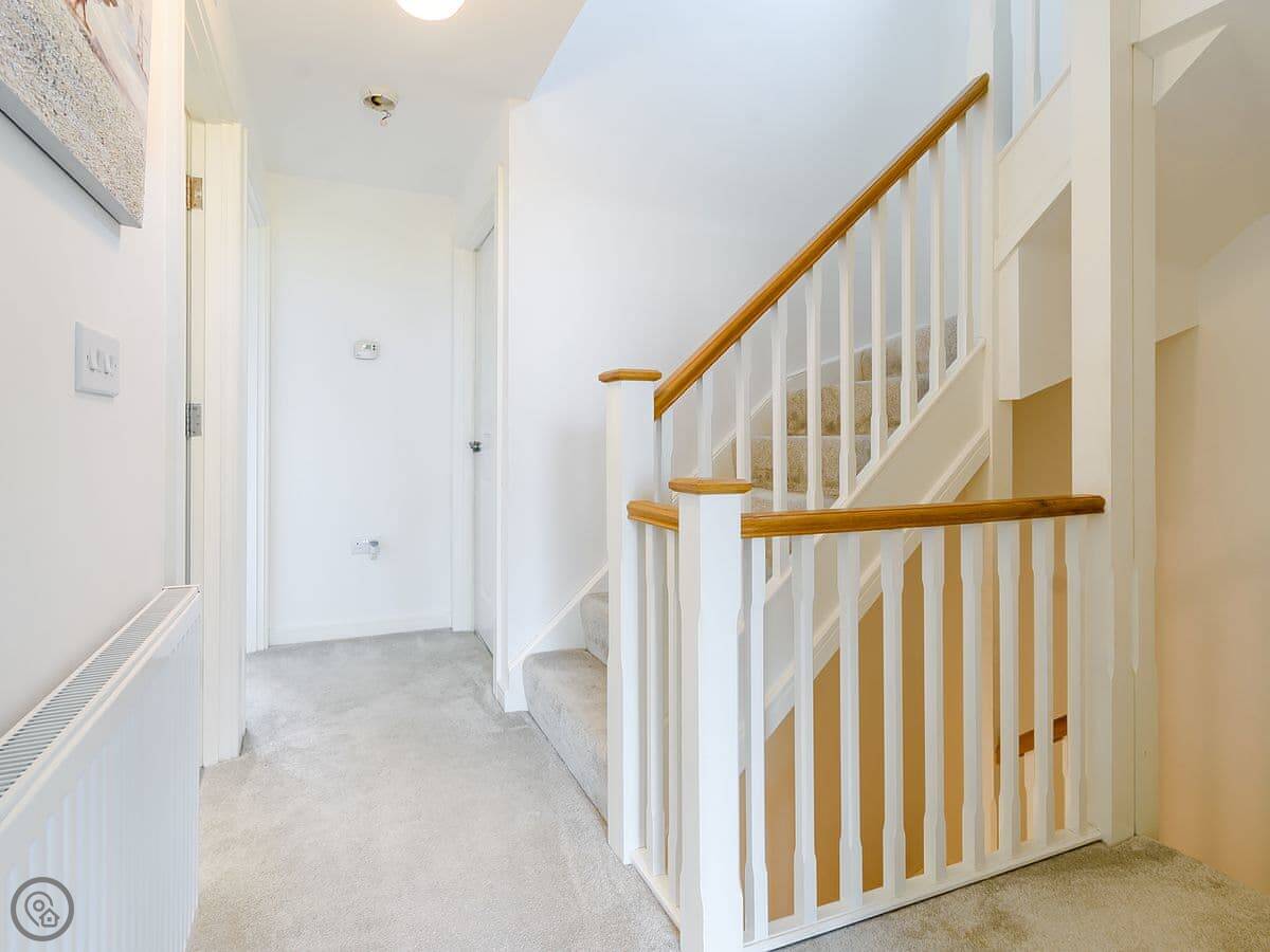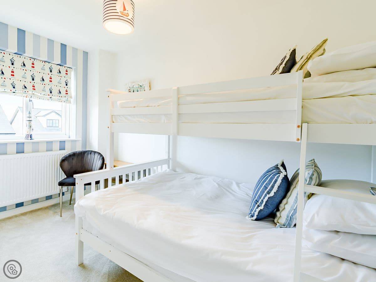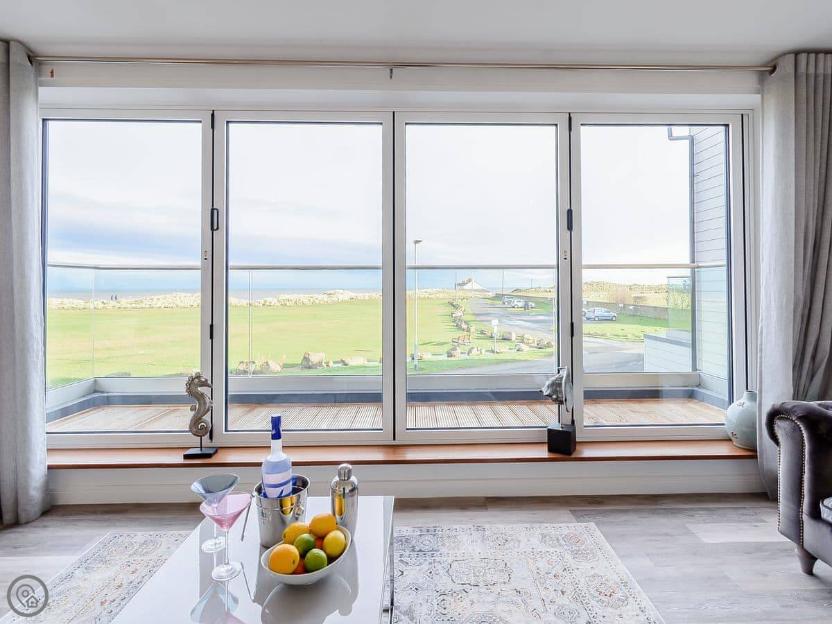 The layout is over three floors. The main living room is on the first floor, with doors to a small balcony. Good views from there over the sand dunes and out to sea. There’s also a snug room off the kitchen downstairs if people want to spread out.