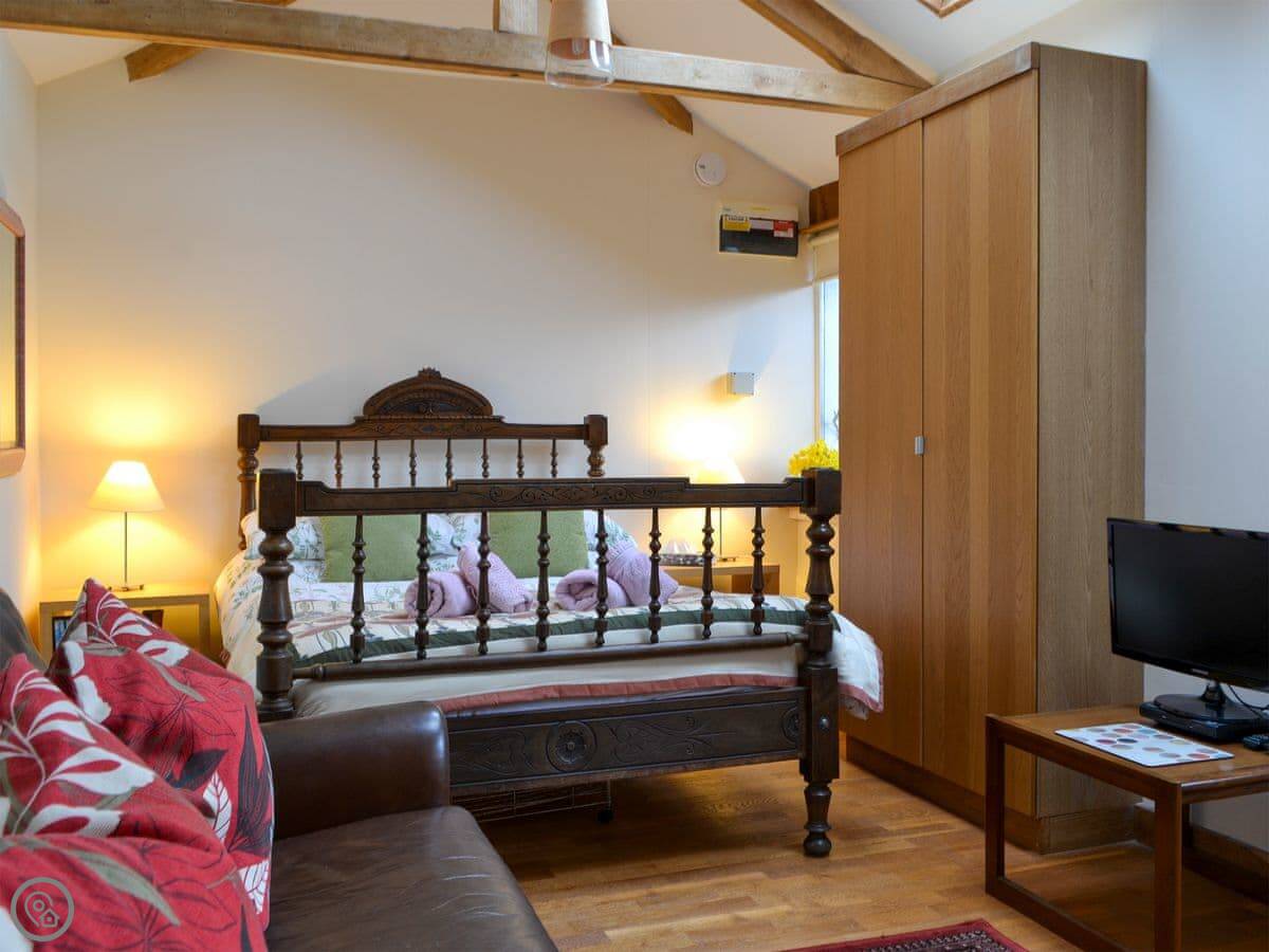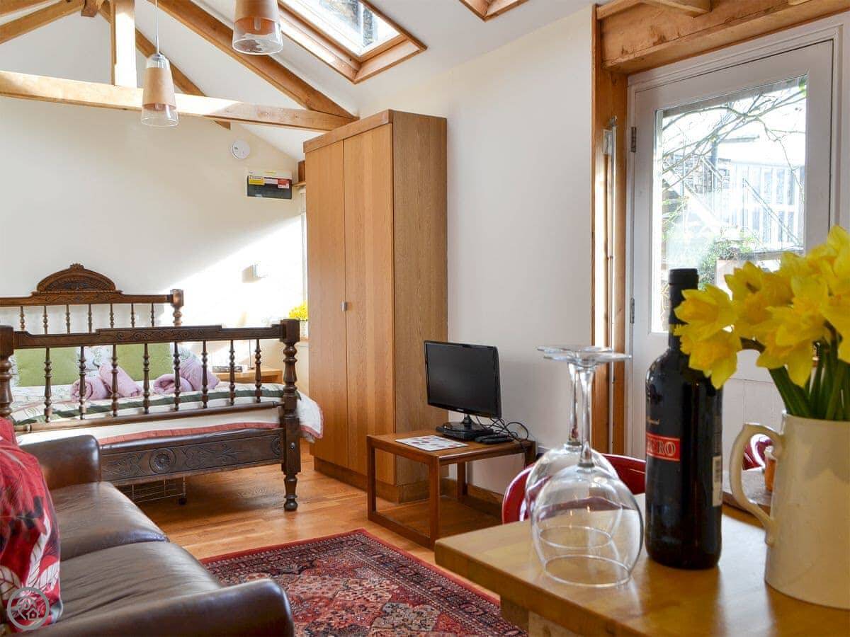The living space is all open plan. The bed is in the same room as the sofa. There are three steps down to the kitchen area from the living space. The ceiling has Velux windows, so it's bright inside. The shower is a good size. Parking is right outside the front door.