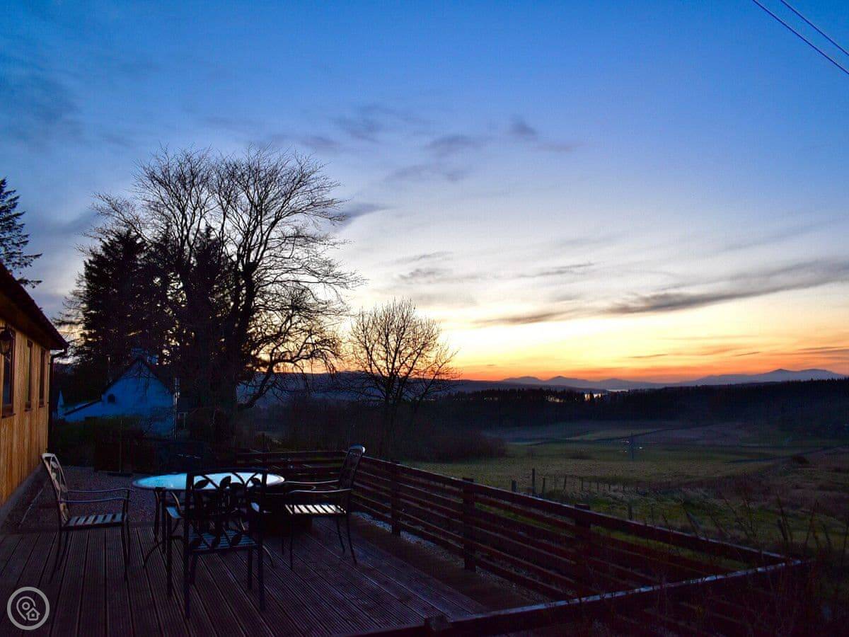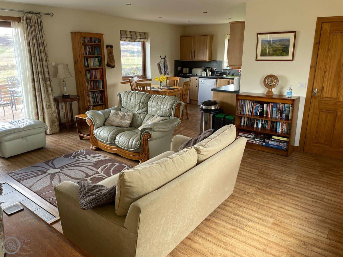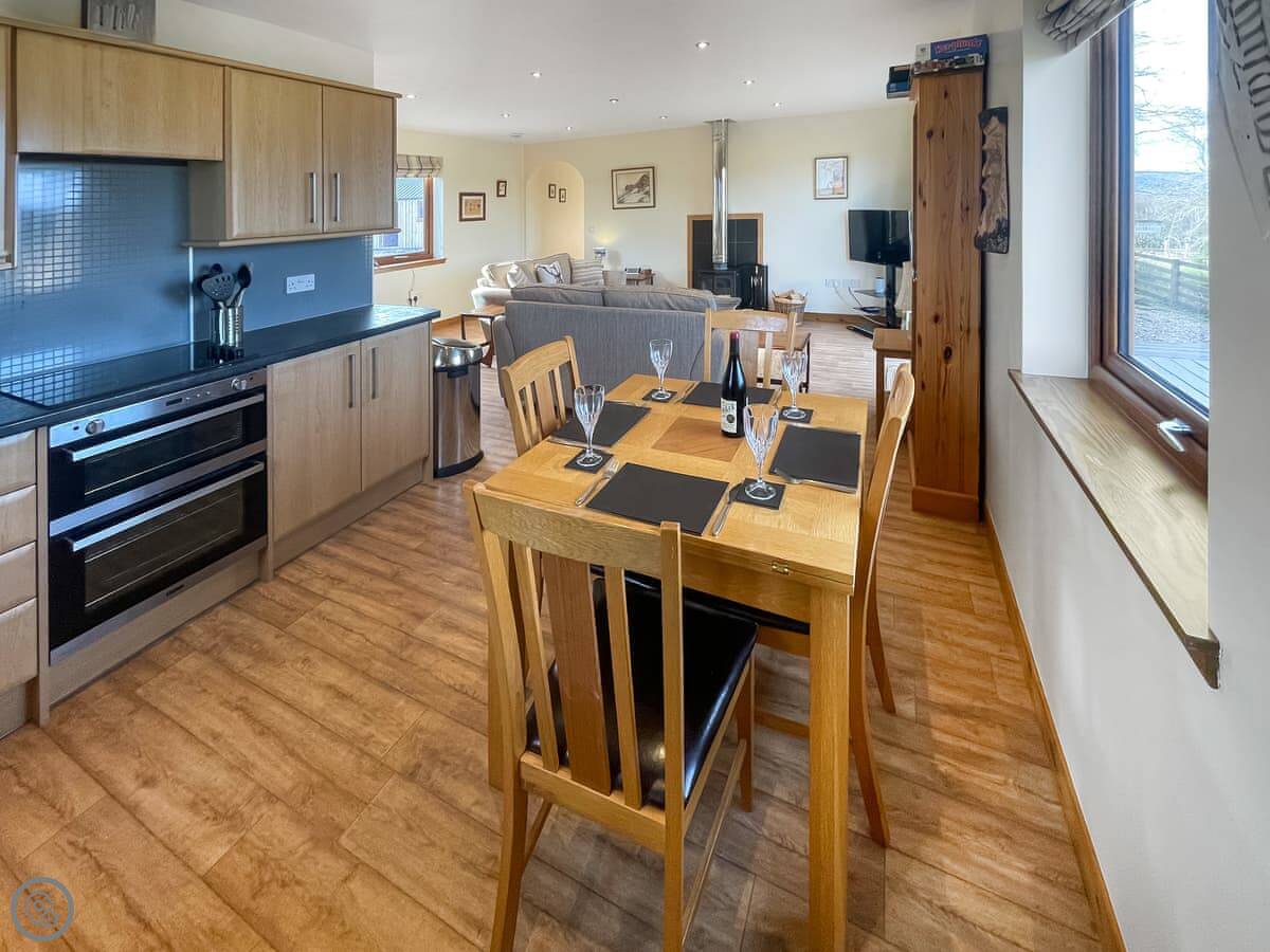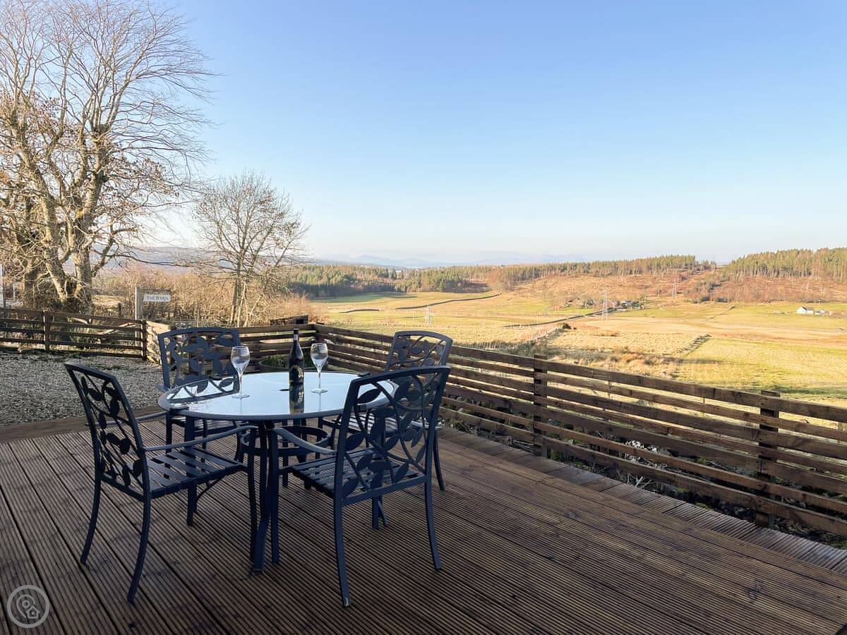 The main room is big and open plan with windows on three sides. The view's just over fields. There's a wood burner. The decking outside goes straight off that room. There's an enclosed garden beyond that for dogs.