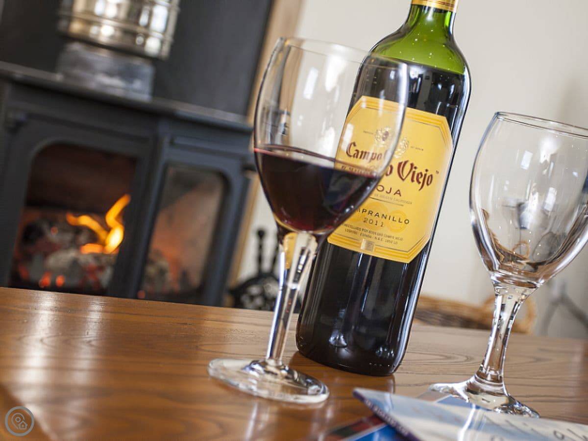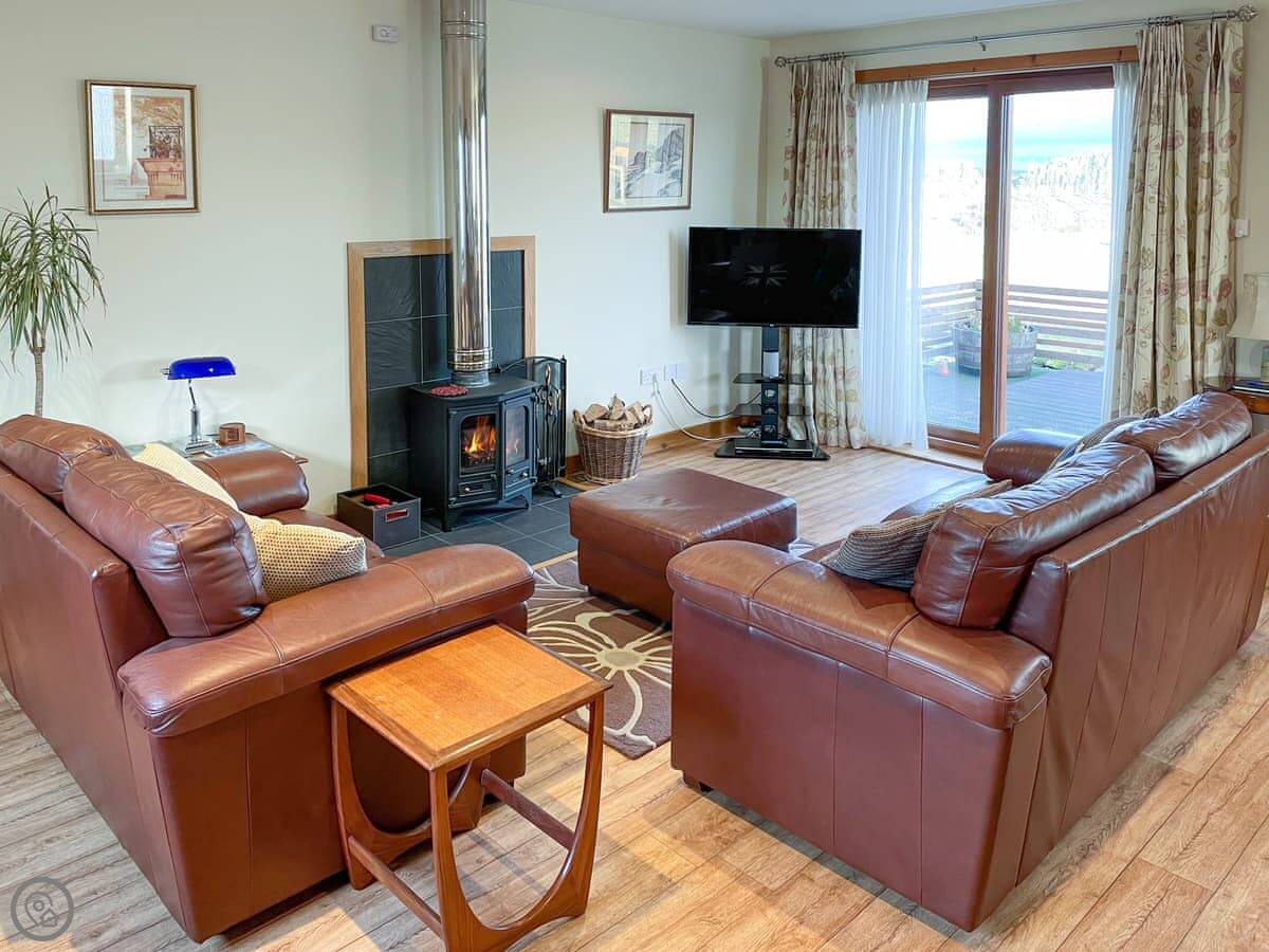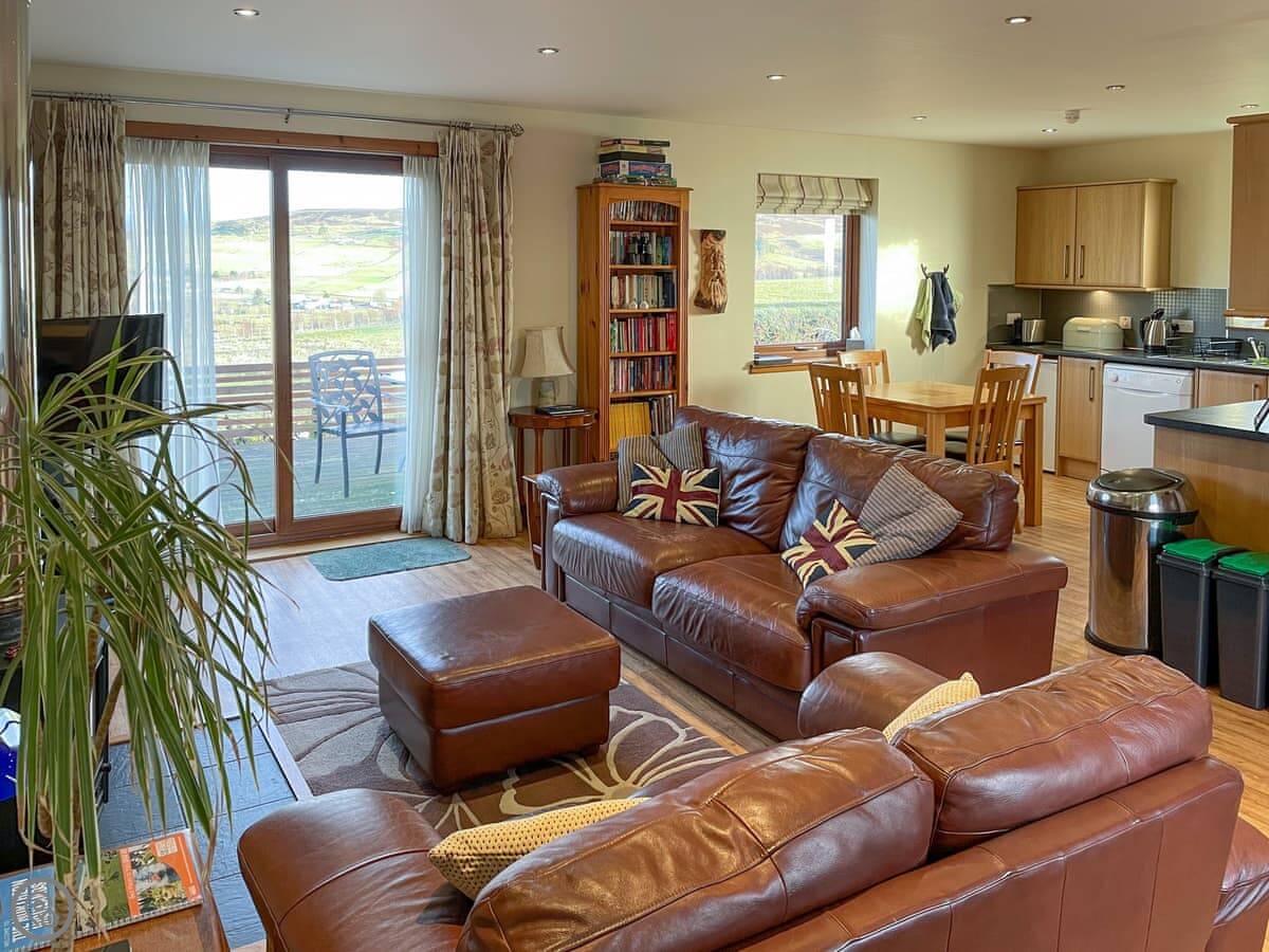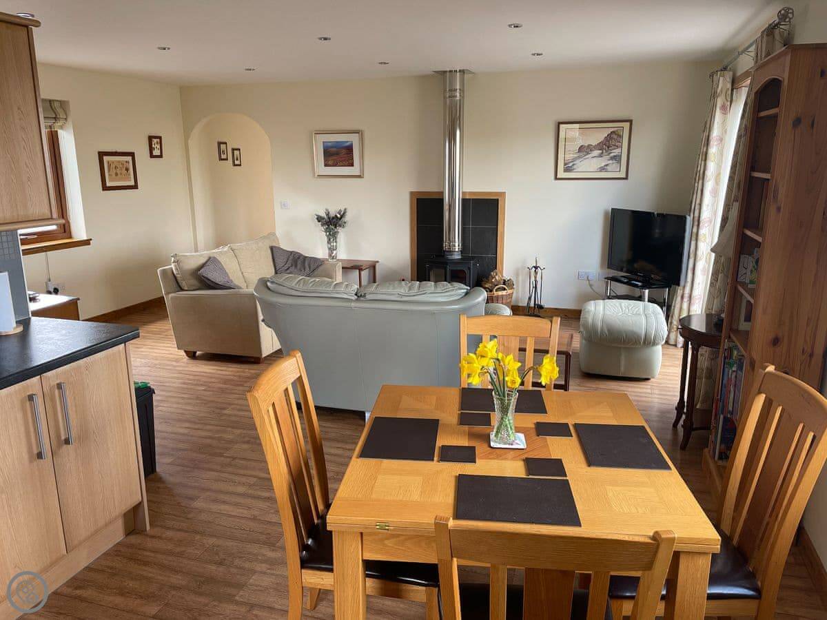 The main room is big and open plan with windows on three sides. The view's just over fields. There's a wood burner. The decking outside goes straight off that room. There's an enclosed garden beyond that for dogs.