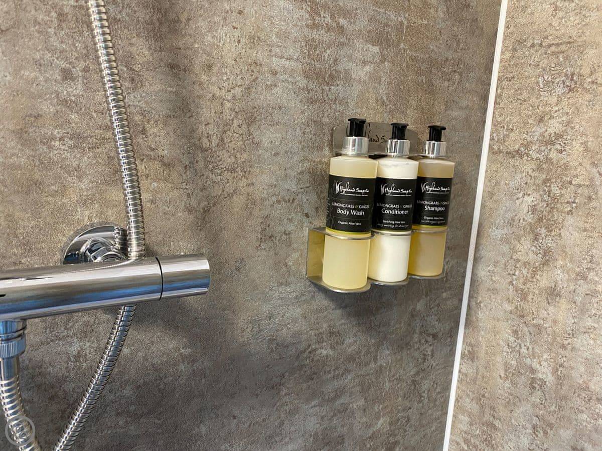 It sleeps four but it's really best for a couple. There's one open-plan room with a double bed at one end and a sofa bed. One bathroom with a shower. It's got a 4 Star rating. It's well insulated with underfloor heating, so it's warm.