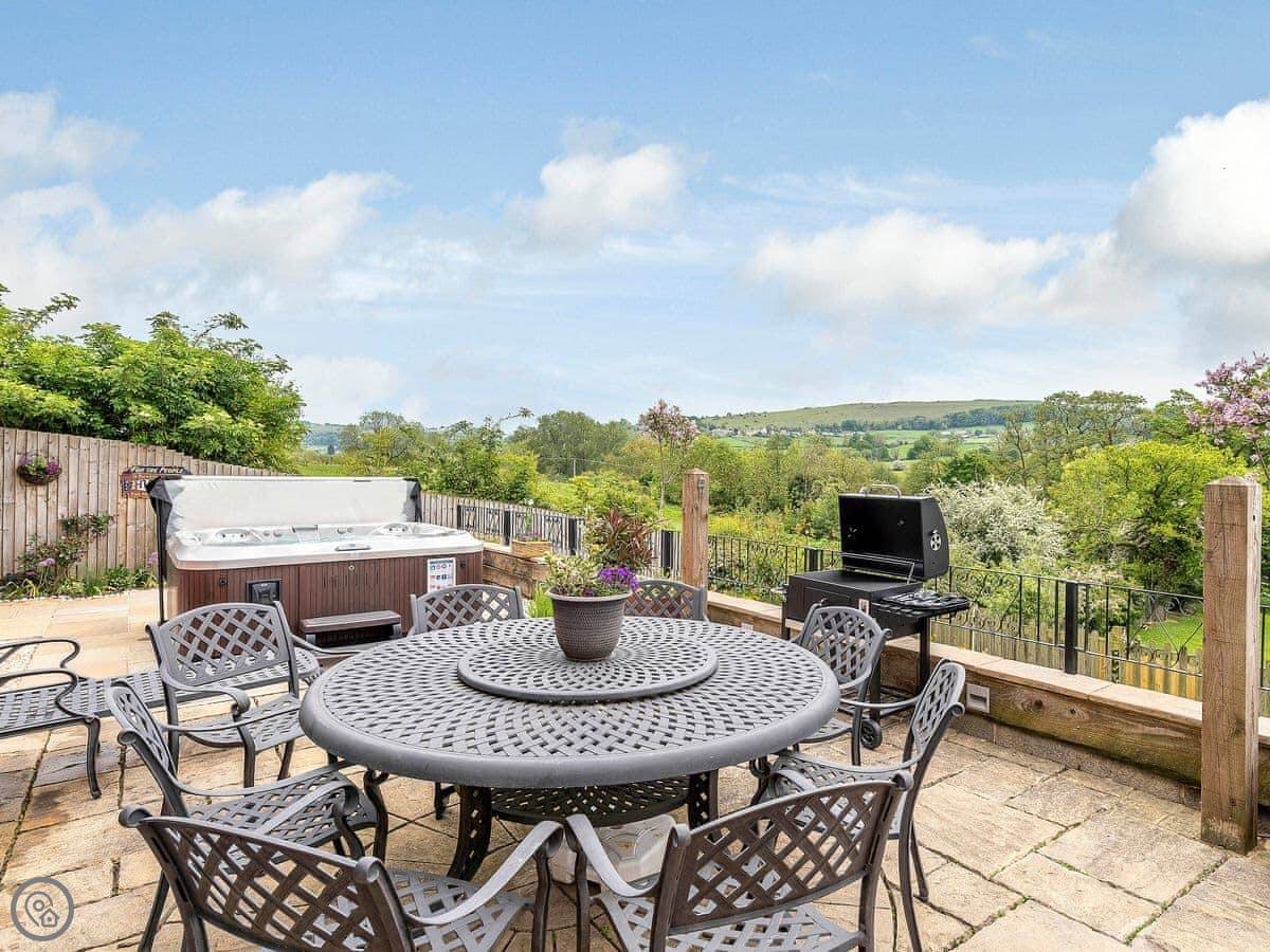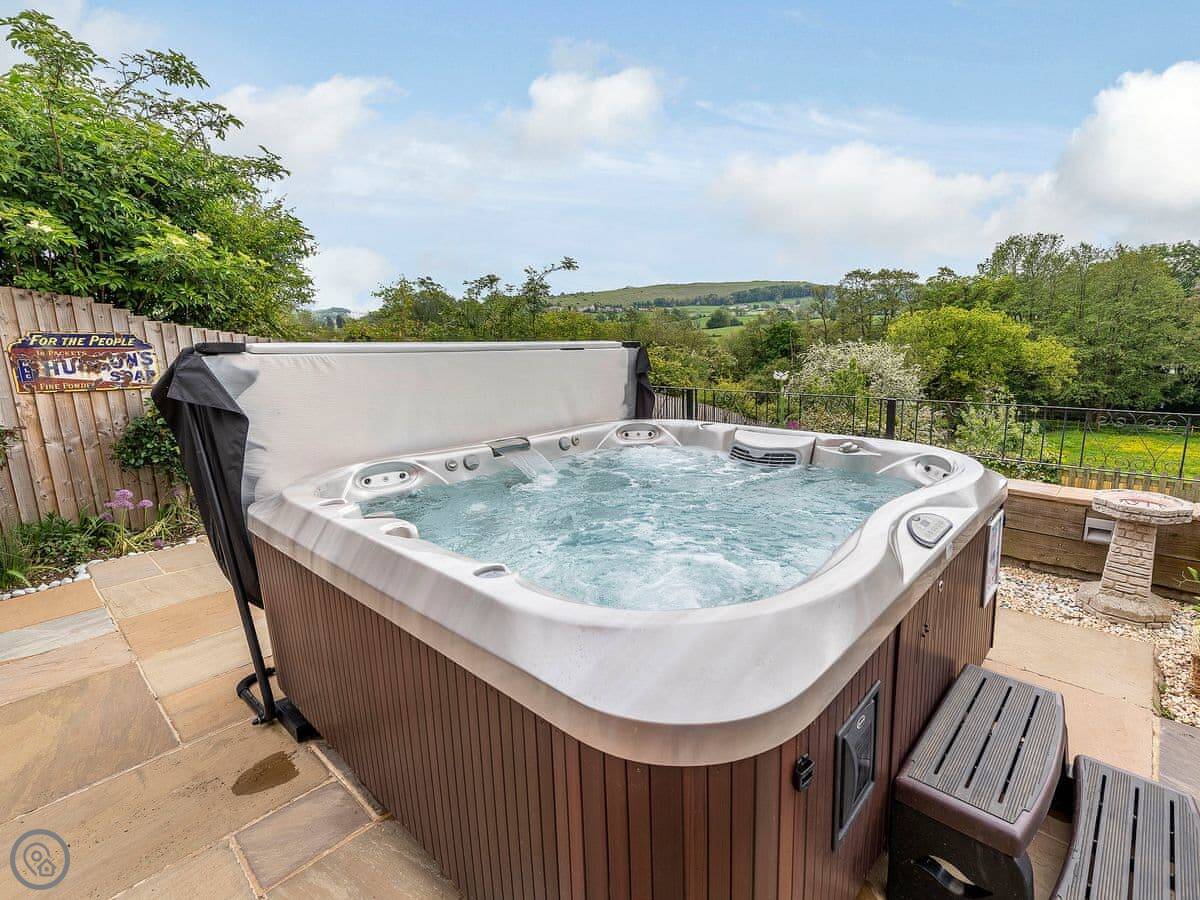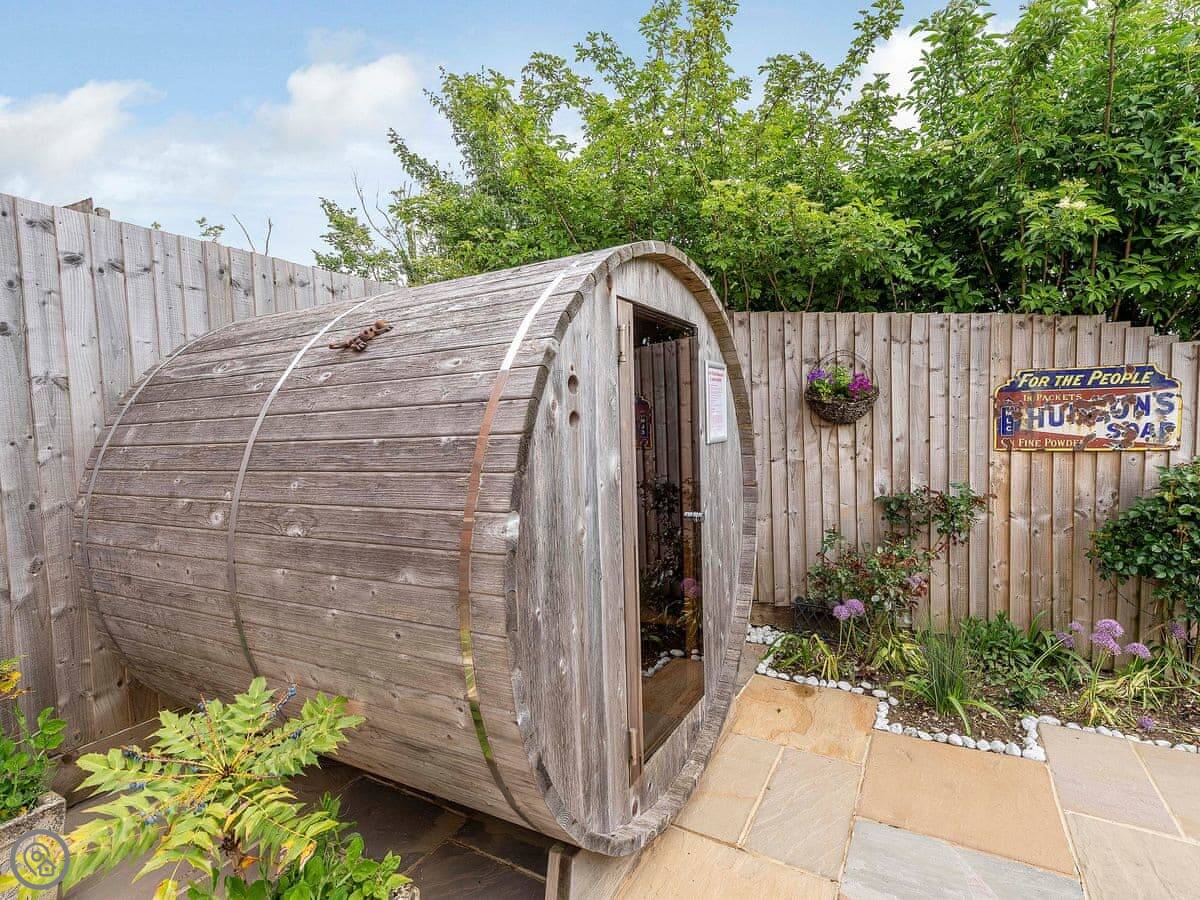 Outside, there’s a hot tub and a sauna in a wooden cabin. The garden is enclosed. There’s parking for several cars.
