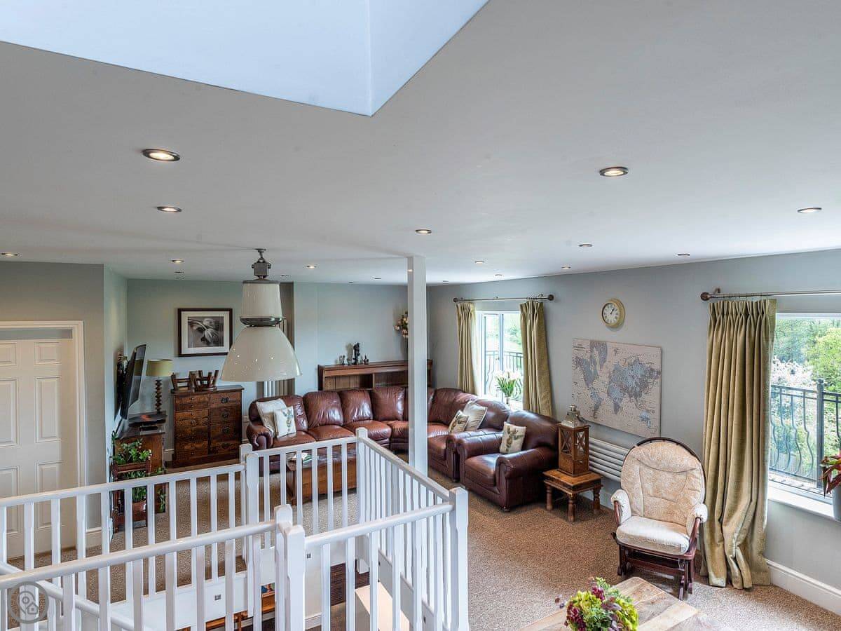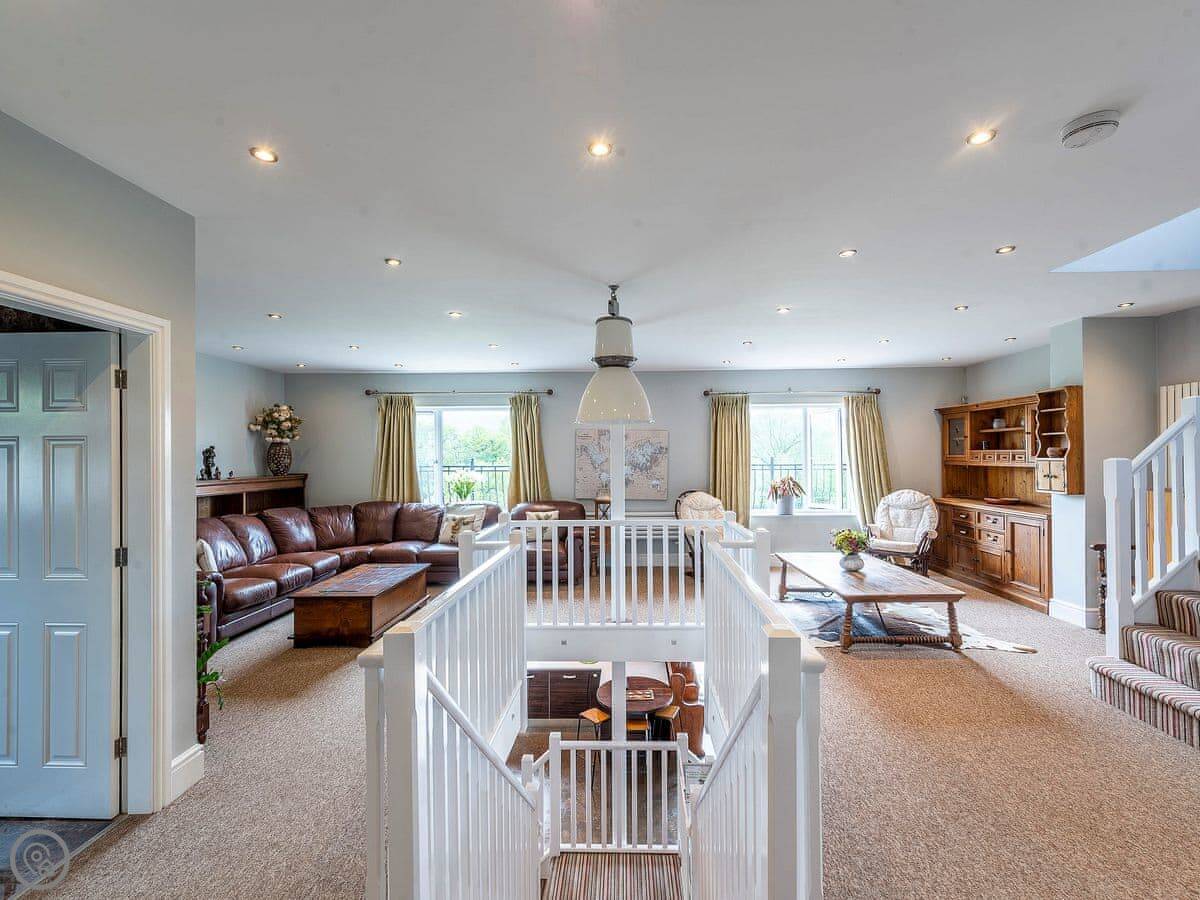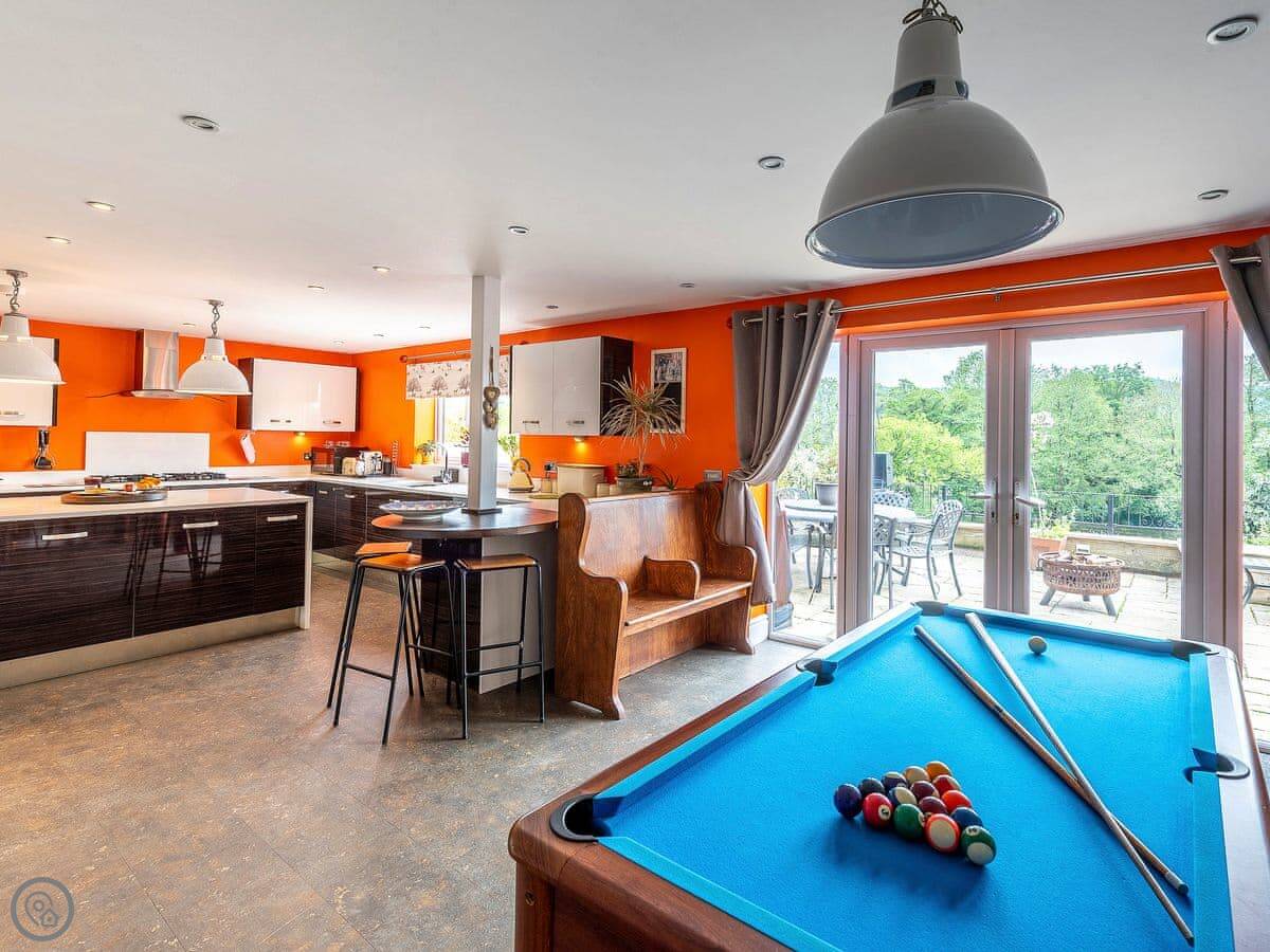 It sleeps twelve. Five bedrooms, four bathrooms. It’s a 5 Star property, which means it’s got a high spec. The main living space is on the lower ground floor. That’s where the big kitchen, dining area, and sitting area are. There’s a pool table and doors out to the garden.