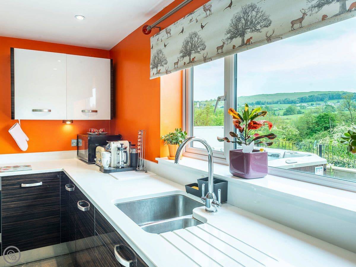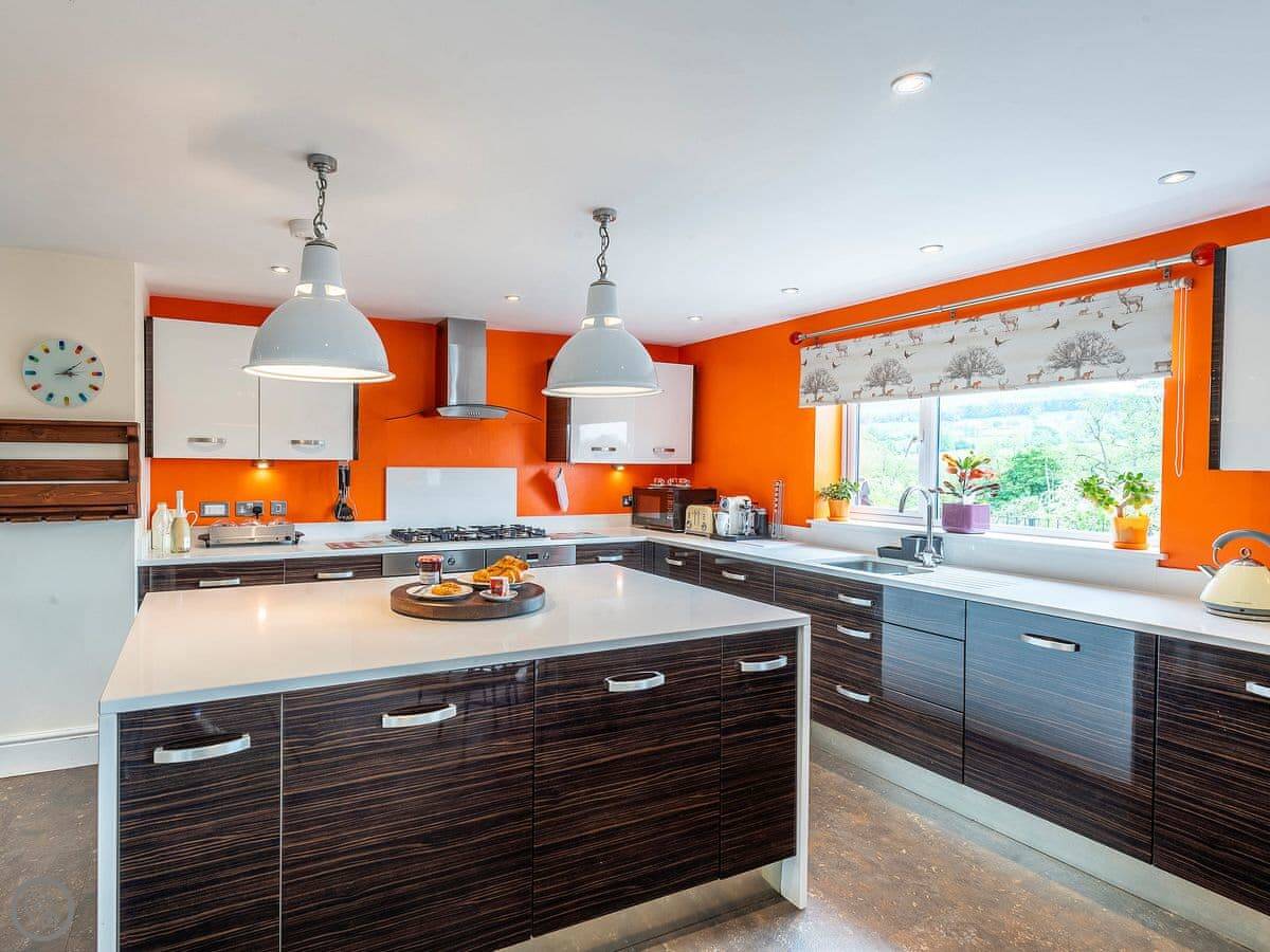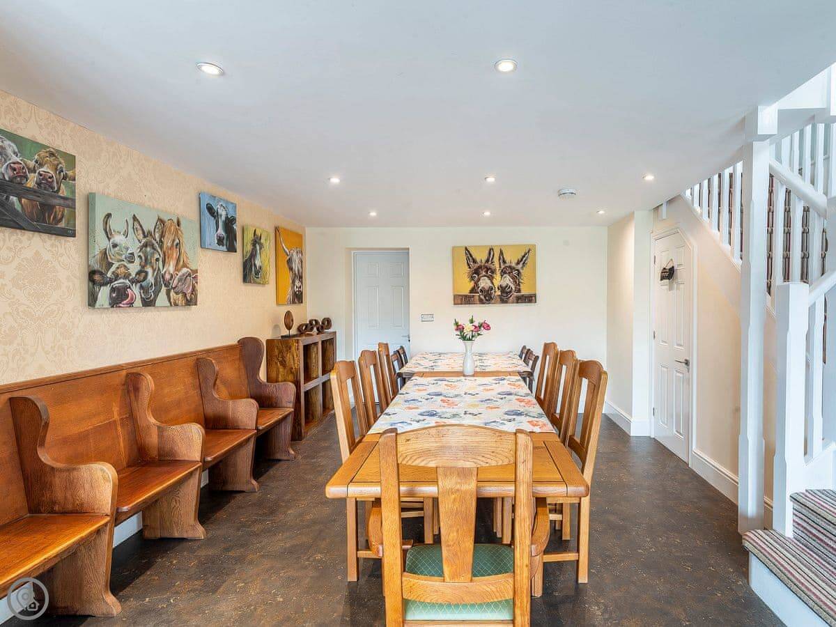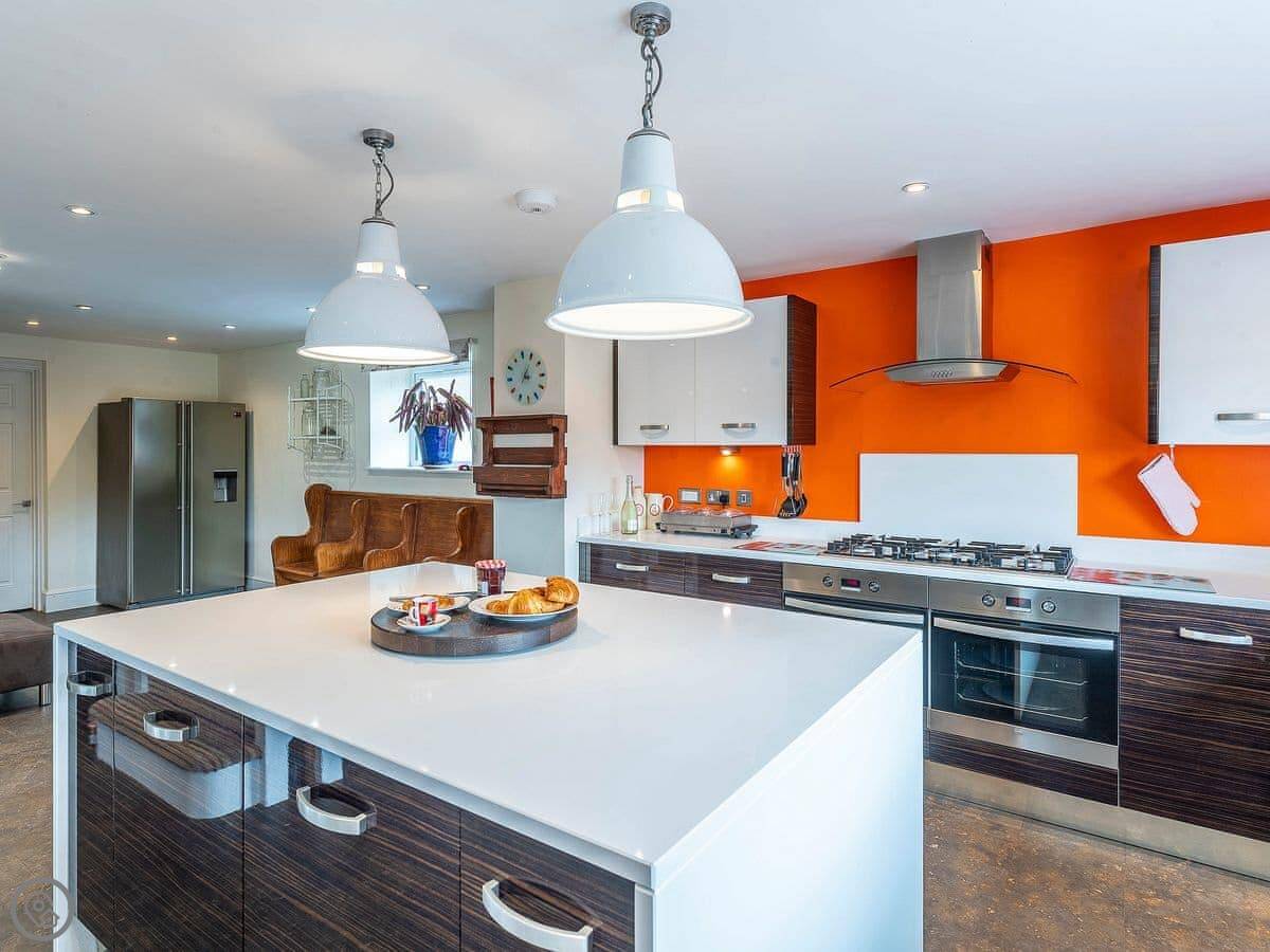 It sleeps twelve. Five bedrooms, four bathrooms. It’s a 5 Star property, which means it’s got a high spec. The main living space is on the lower ground floor. That’s where the big kitchen, dining area, and sitting area are. There’s a pool table and doors out to the garden.