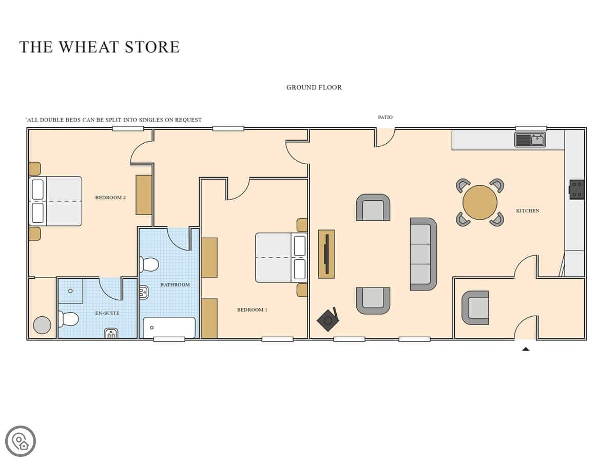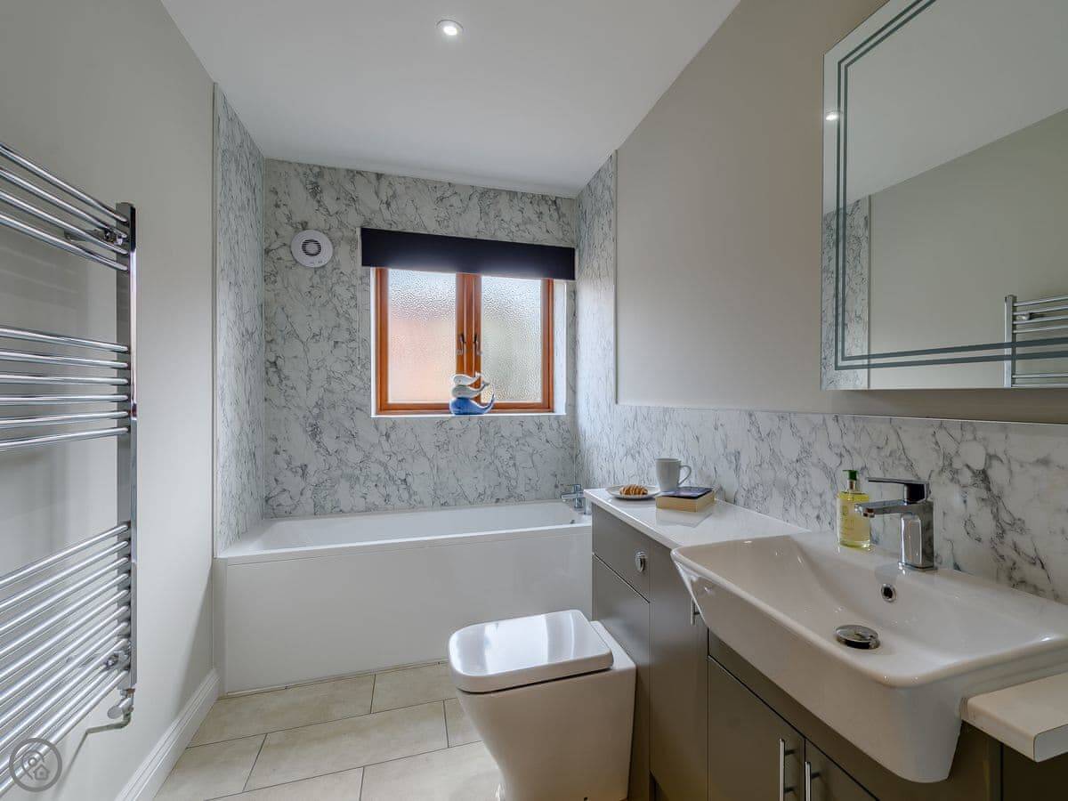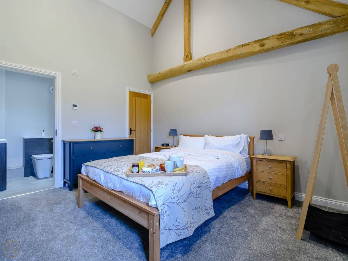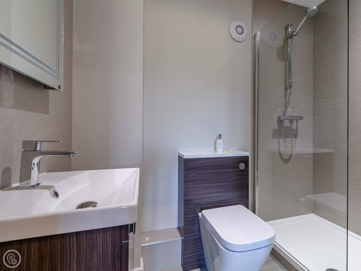 This one sleeps four. Two bedrooms, two bathrooms. It's got a 5 Star rating, which means it's well finished and comfortable. The heating is underfloor, so it's even and warm. Everything's on one level, so no stairs to worry about.