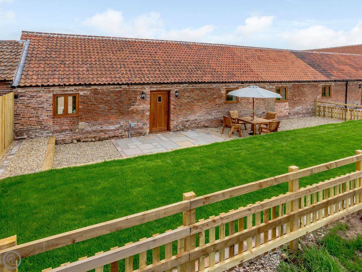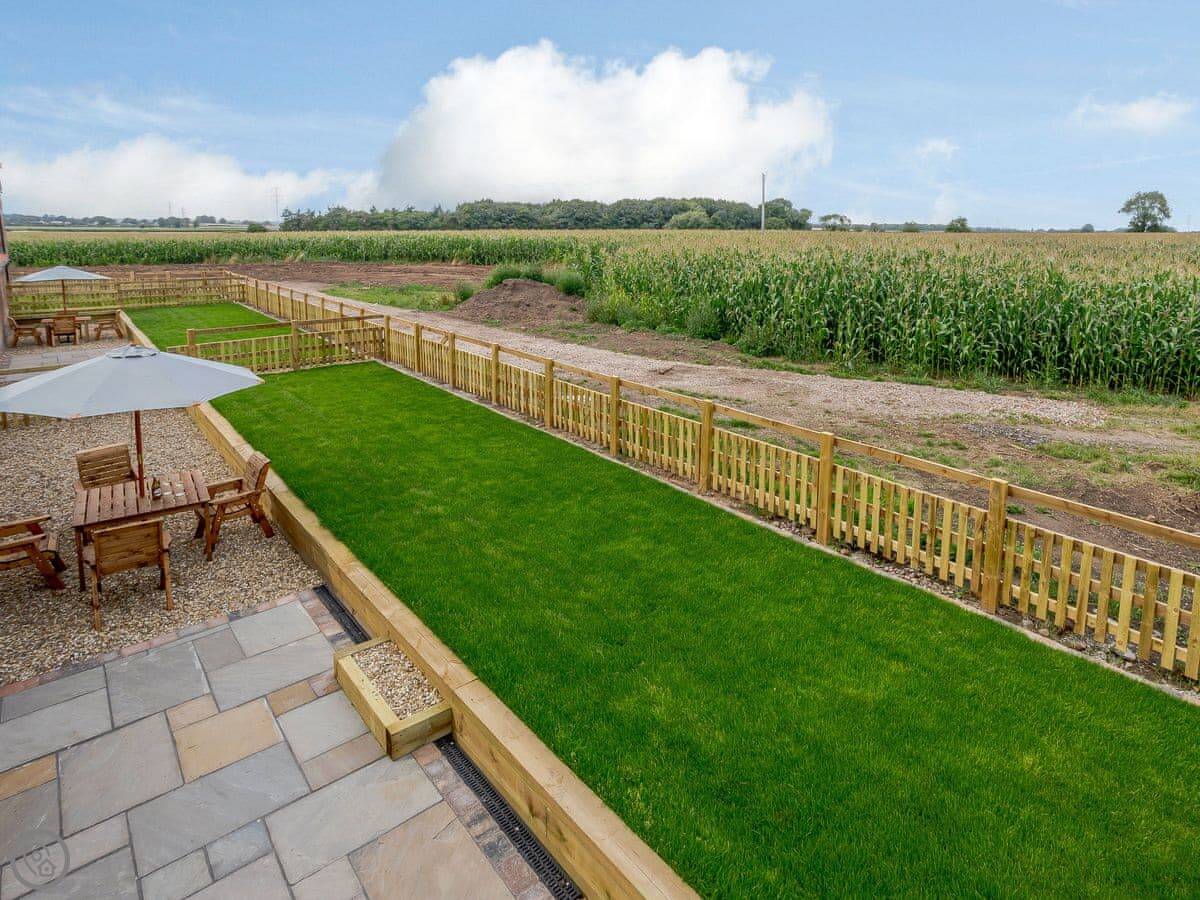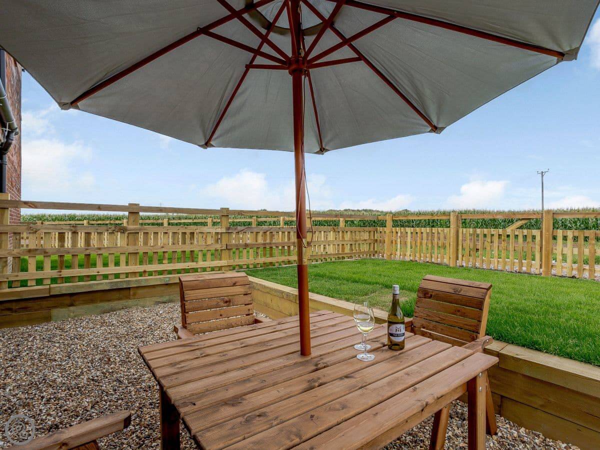 You get your own bit of patio out the back. It looks out over fields. The garden is enclosed, so it's safe if you're bringing a dog. Speaking of which, you can bring one dog.