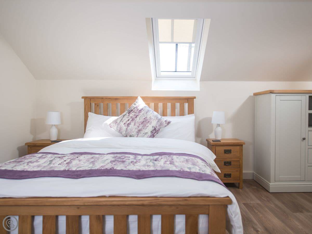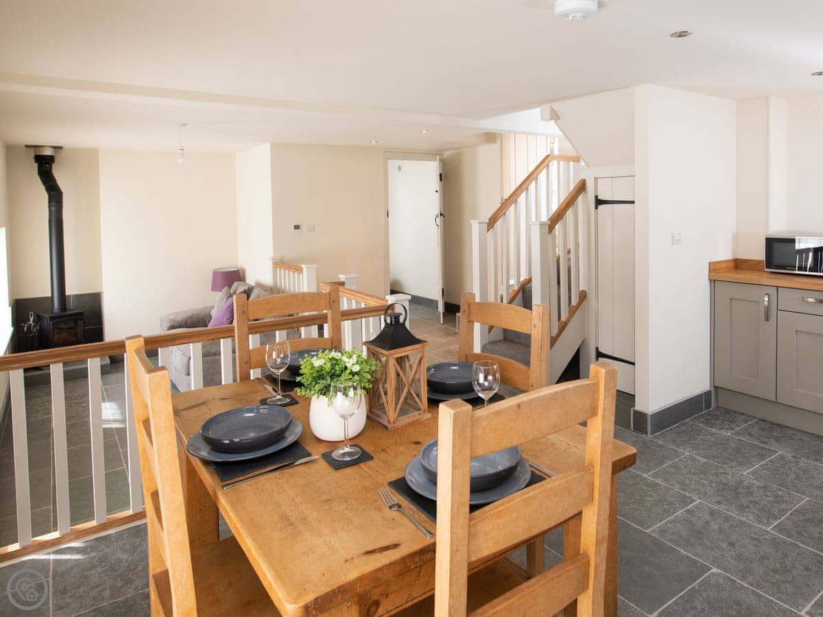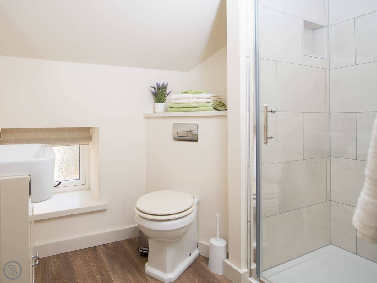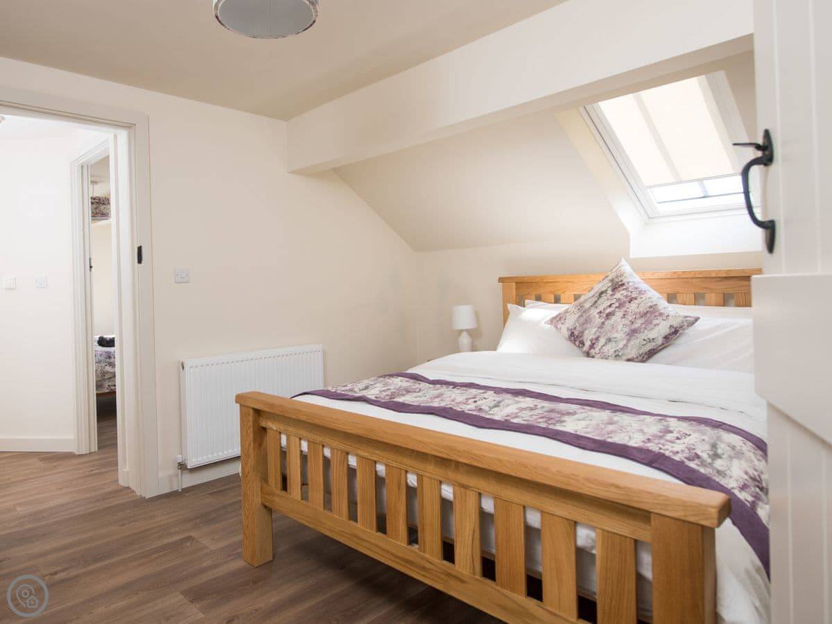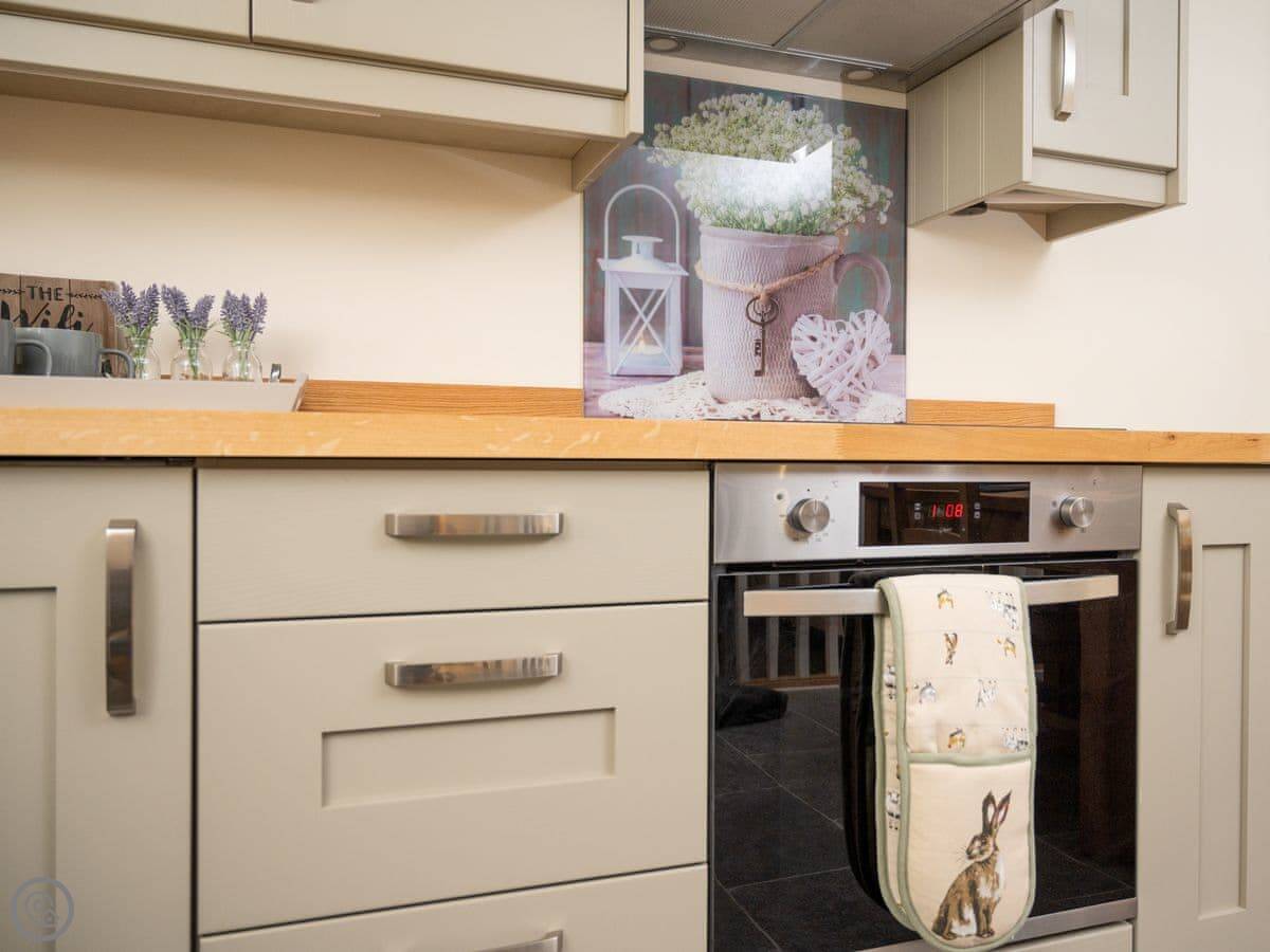 It sleeps four. Two bedrooms, both with their own bathrooms. That’s useful. The living space is all open plan downstairs. There’s a multi-fuel burner. It’s a 5 Star place, so everything is in good order.