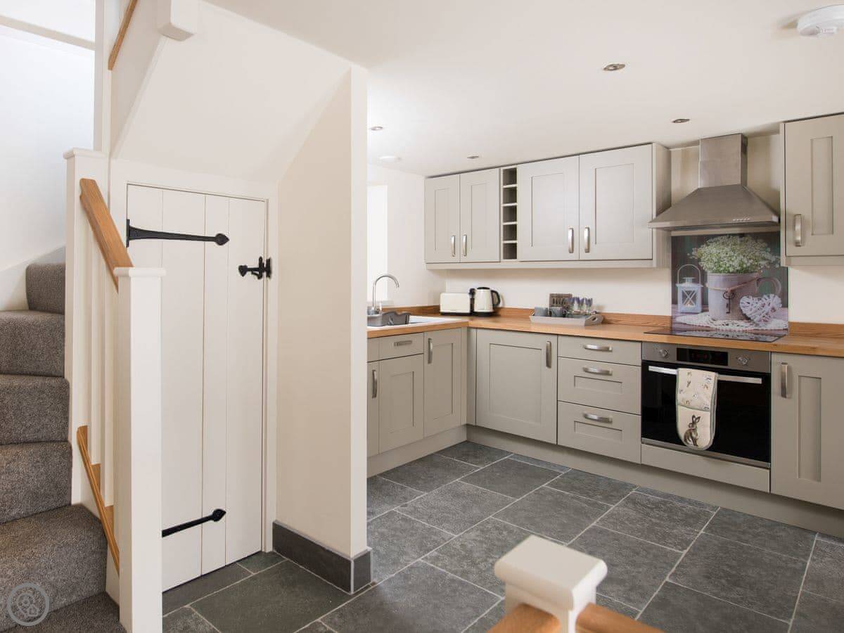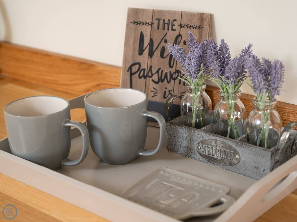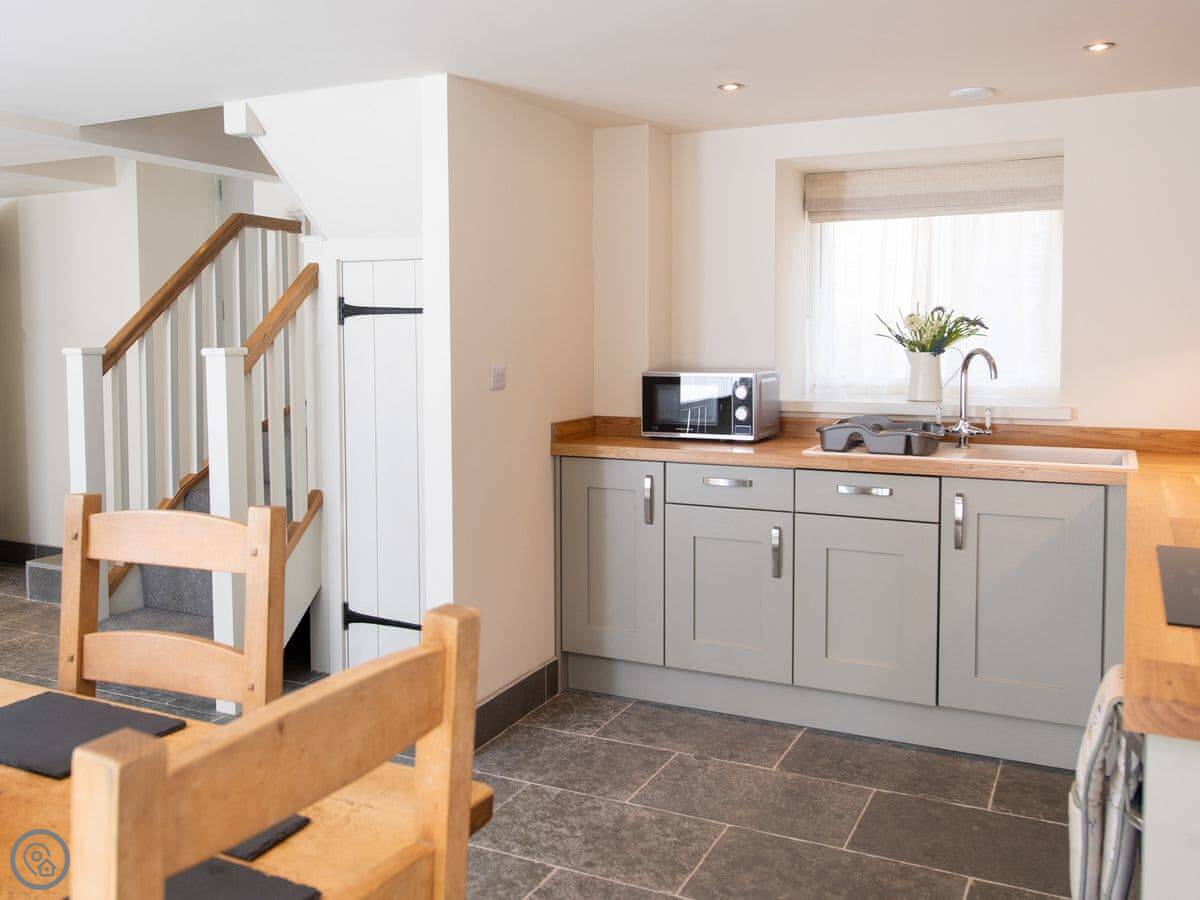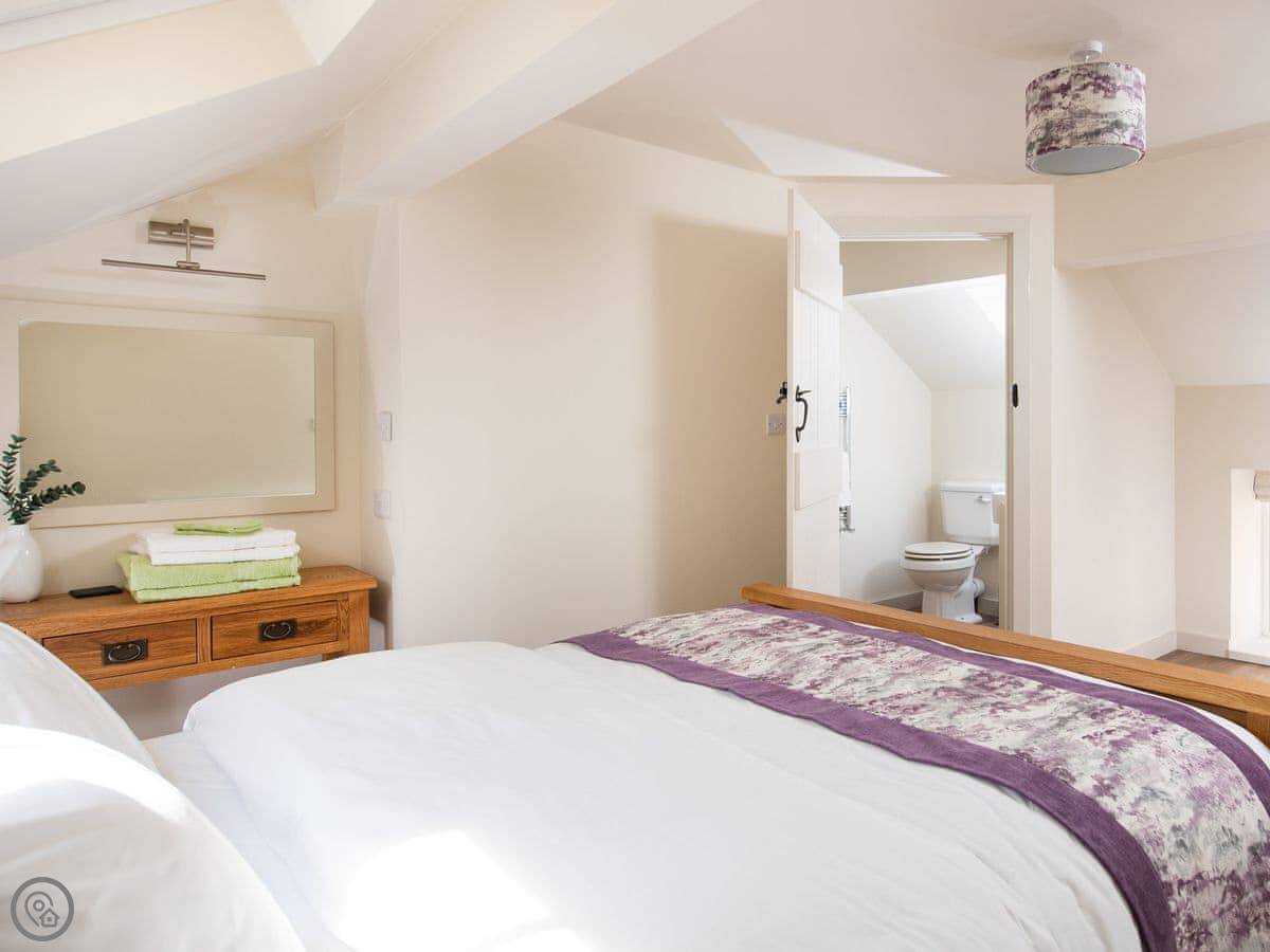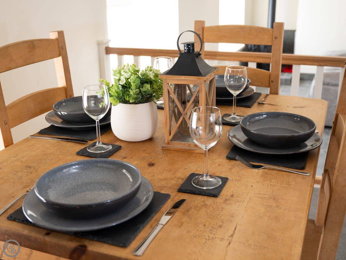 It sleeps four. Two bedrooms, both with their own bathrooms. That’s useful. The living space is all open plan downstairs. There’s a multi-fuel burner. It’s a 5 Star place, so everything is in good order.