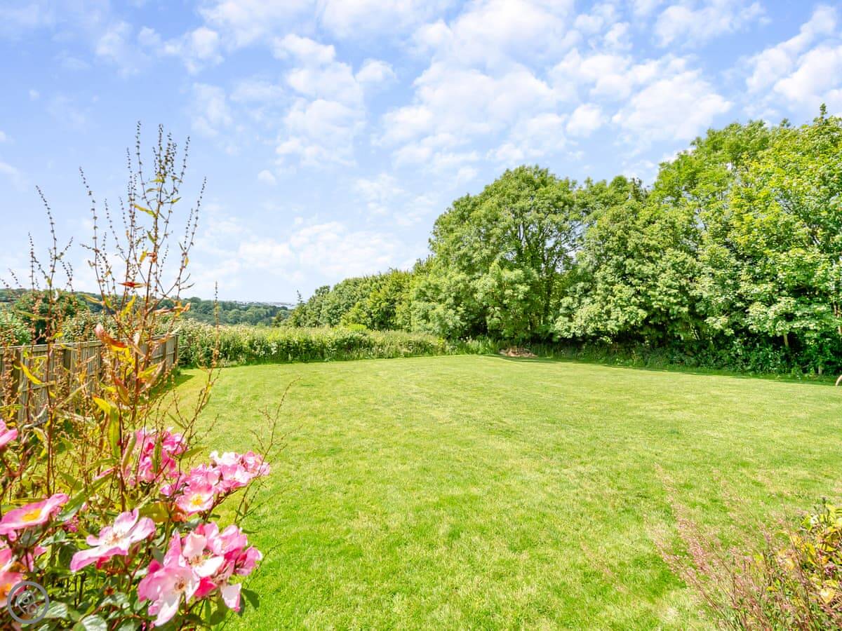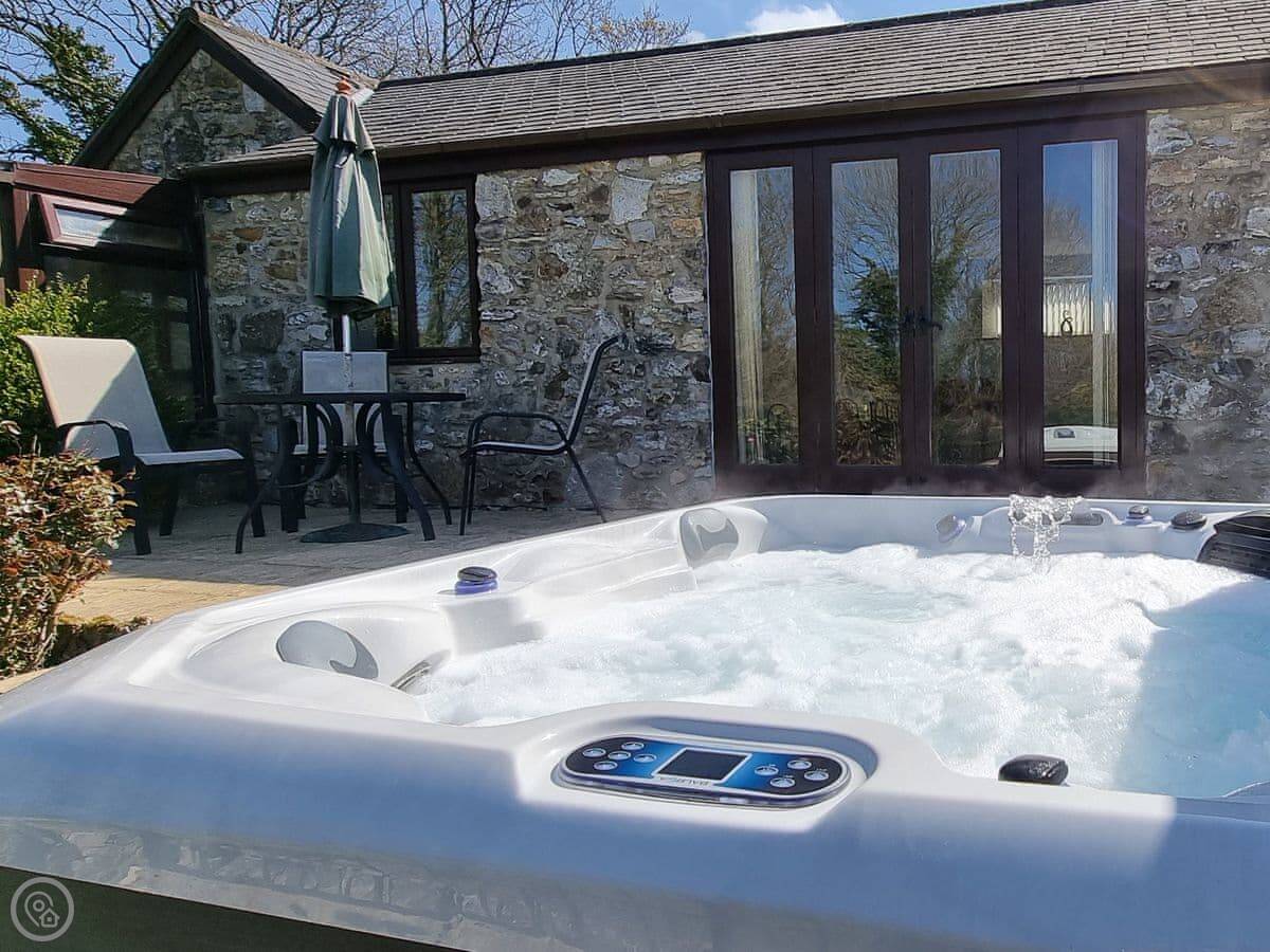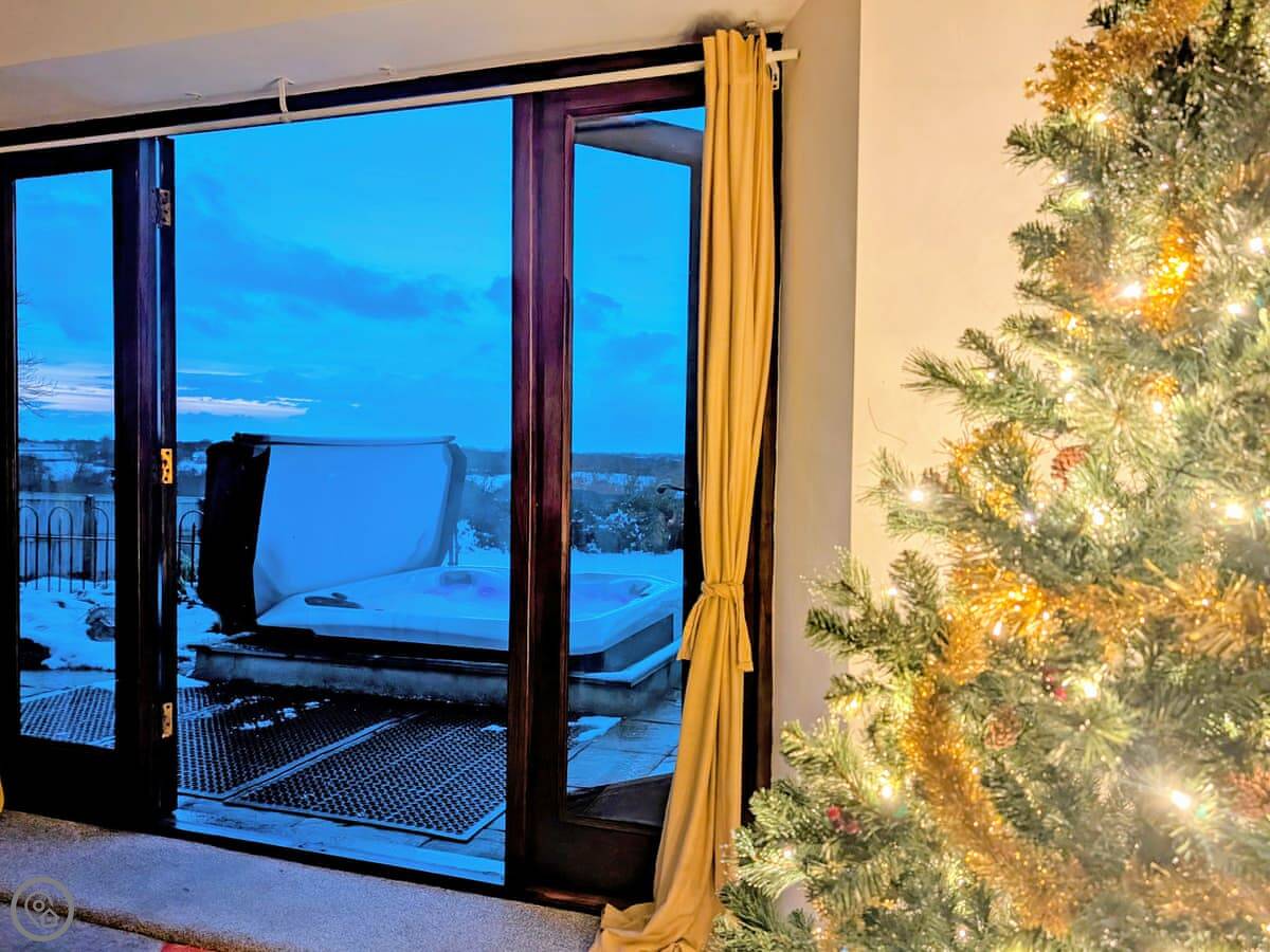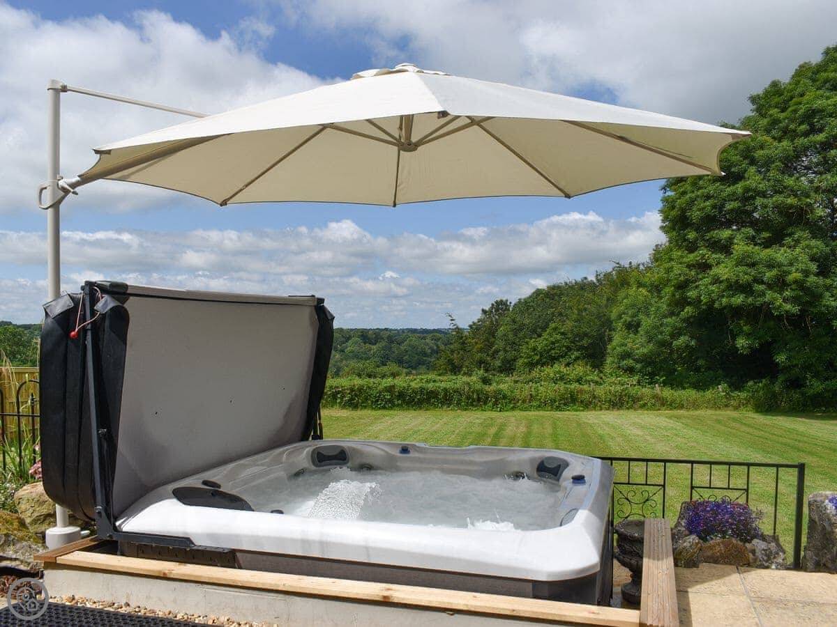 The garden is enclosed. There's a patio with furniture and a barbecue. The hot tub is out there too. You get a good view over the fields.