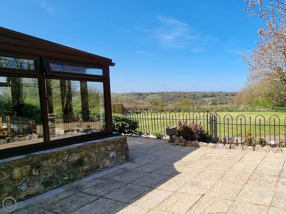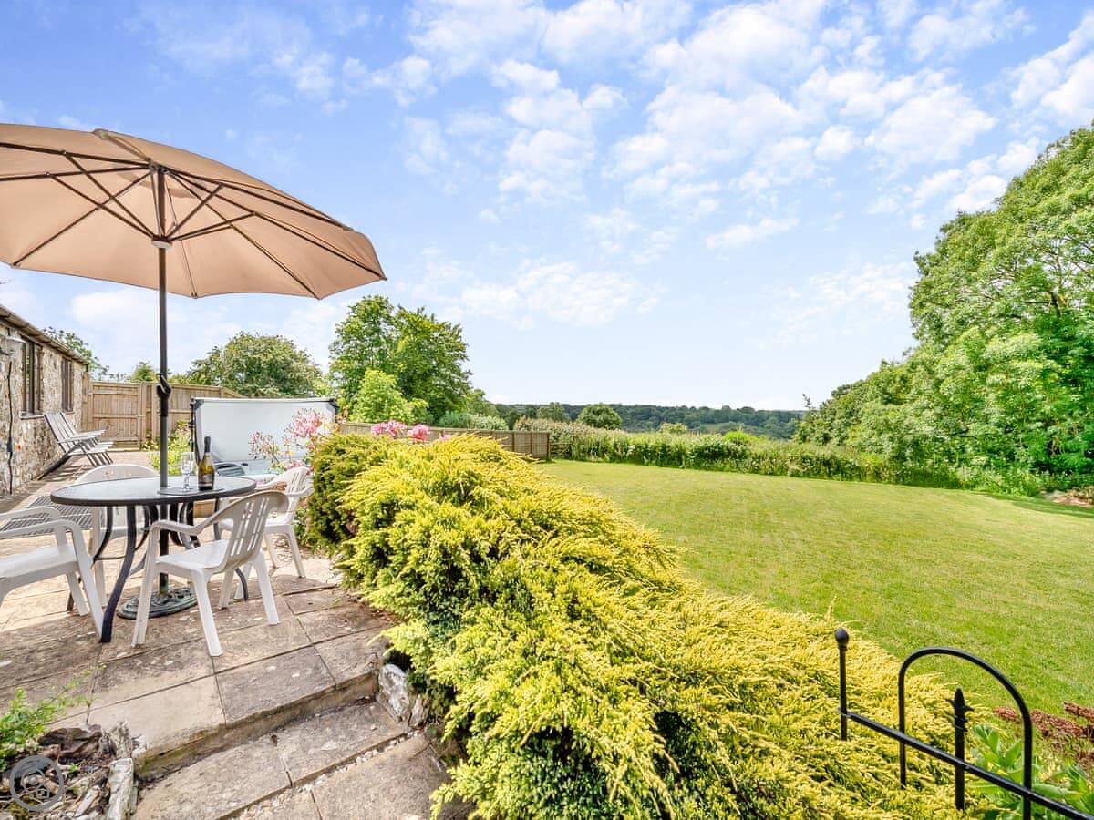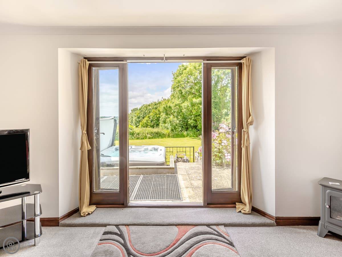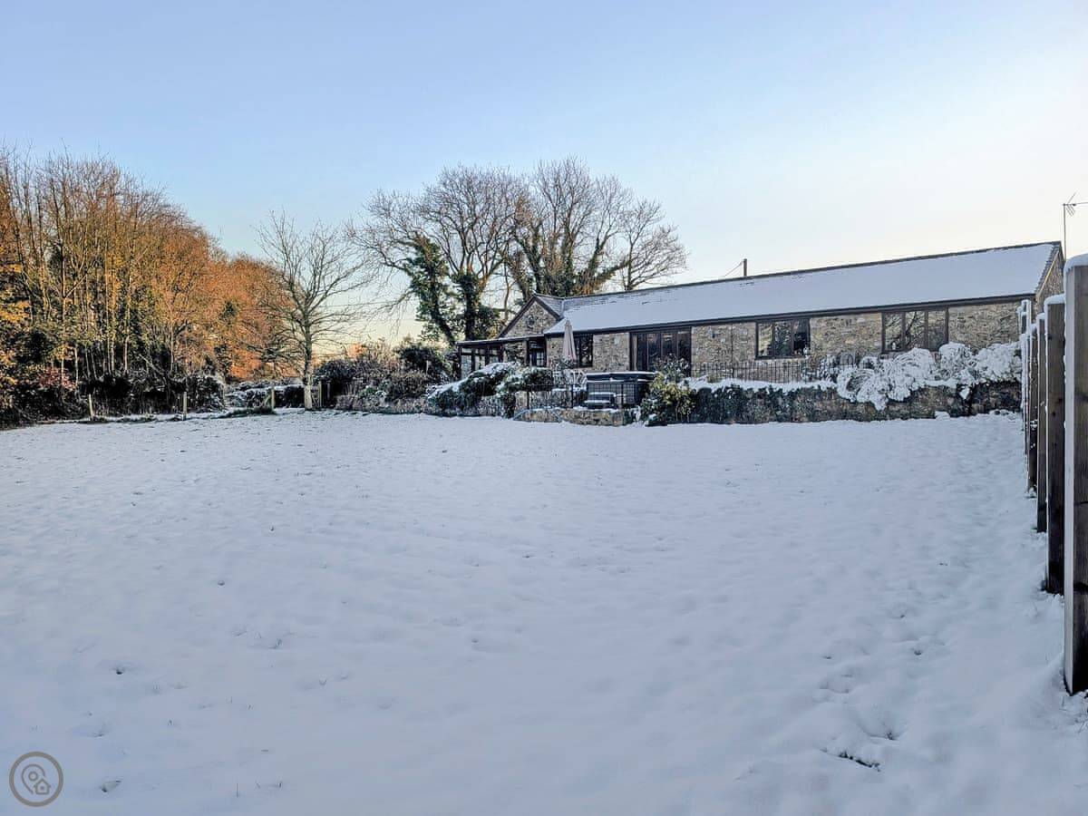 The garden is enclosed. There's a patio with furniture and a barbecue. The hot tub is out there too. You get a good view over the fields.