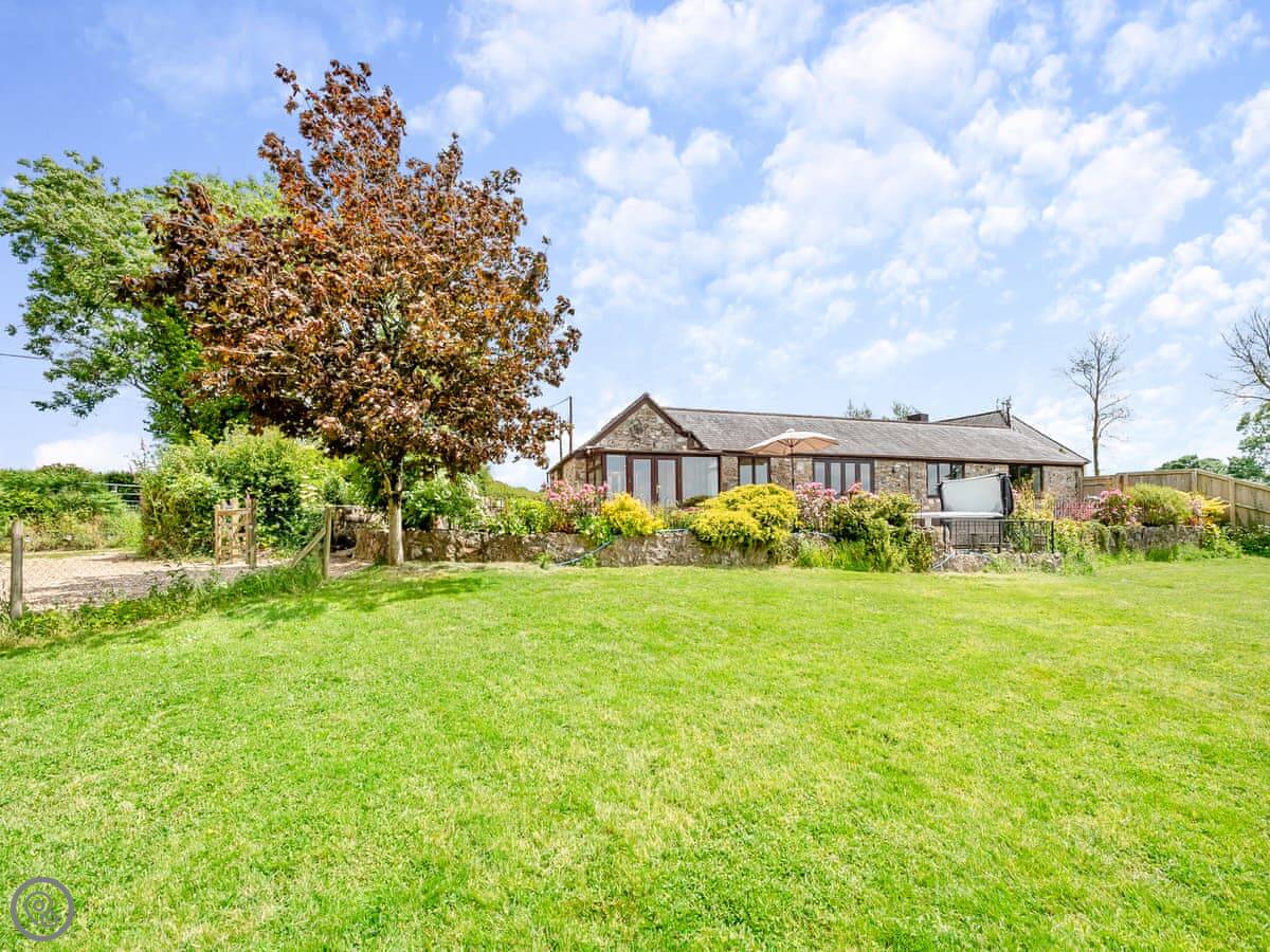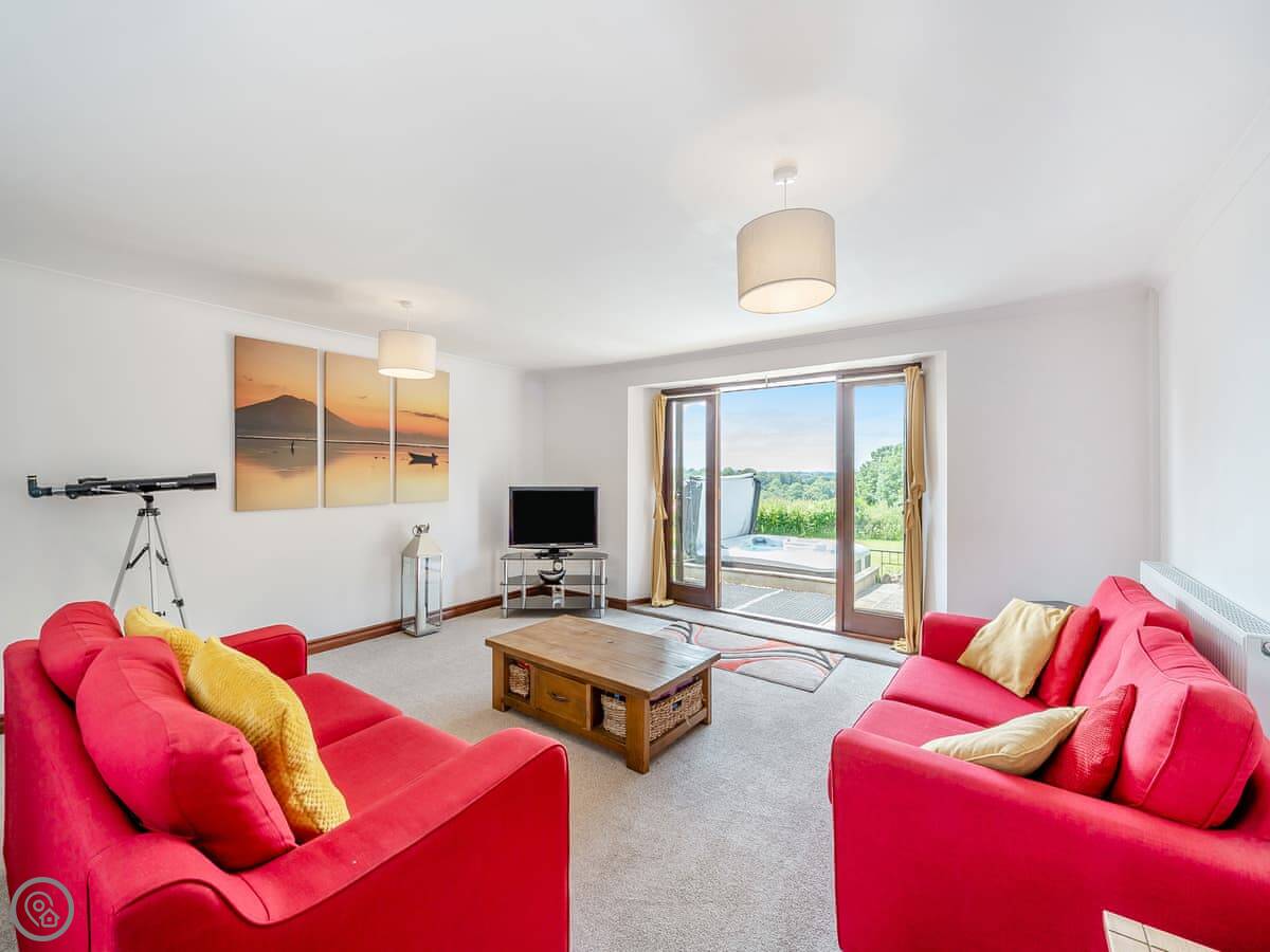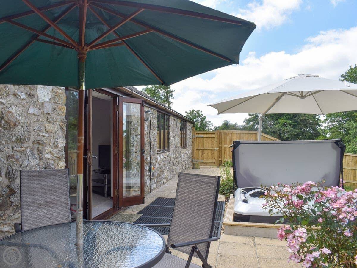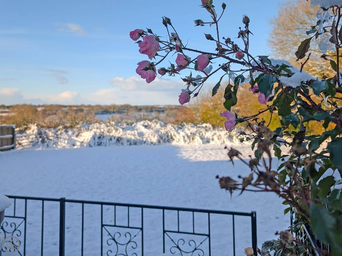 The garden is enclosed. There's a patio with furniture and a barbecue. The hot tub is out there too. You get a good view over the fields.