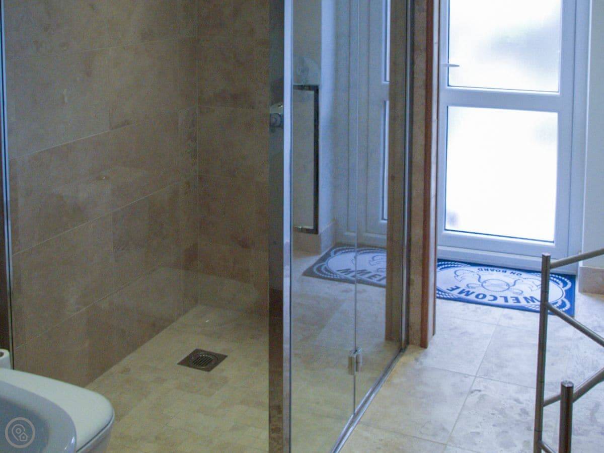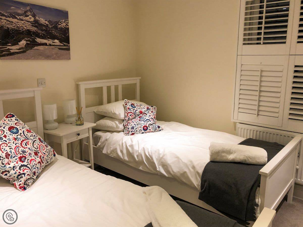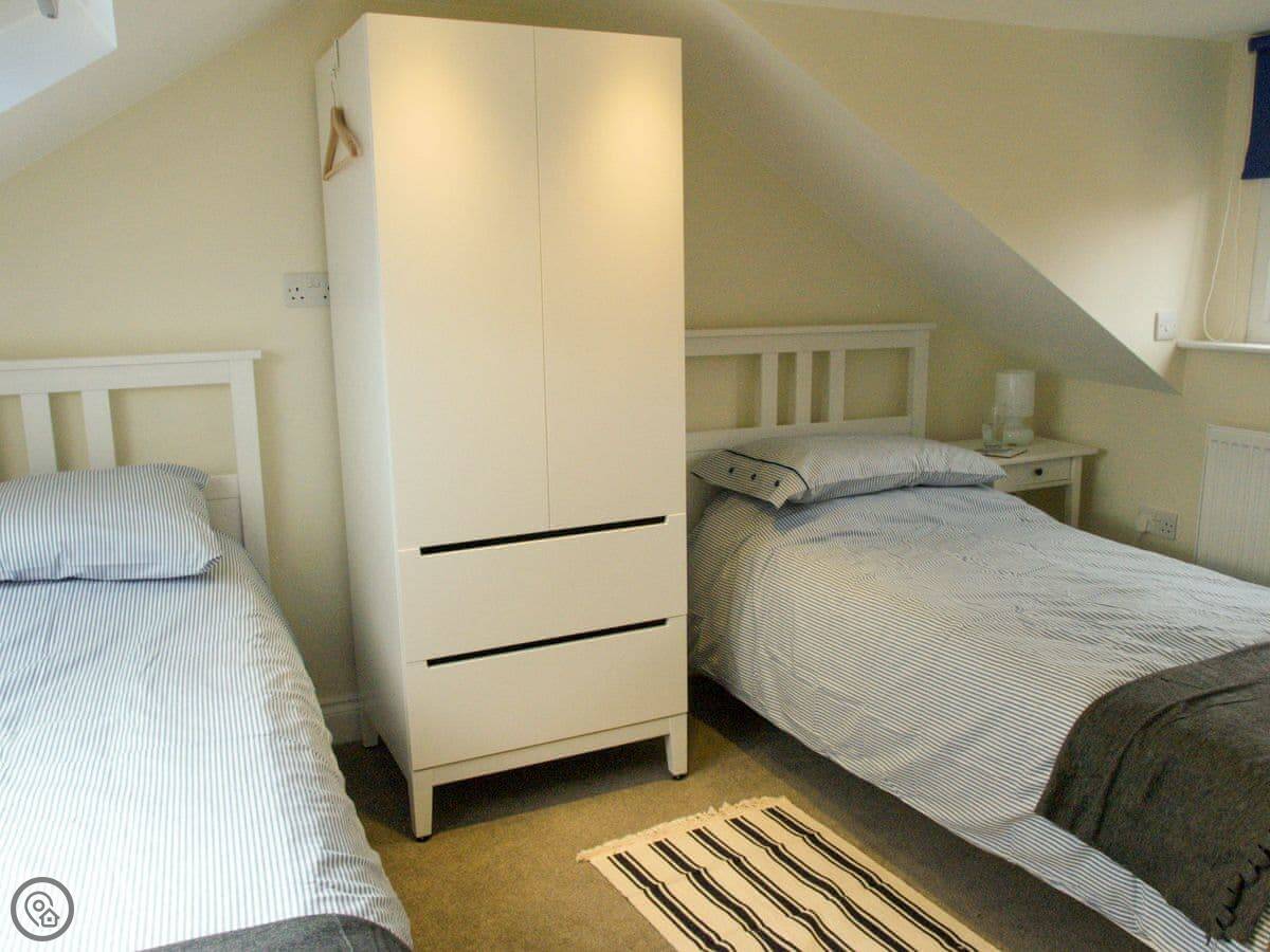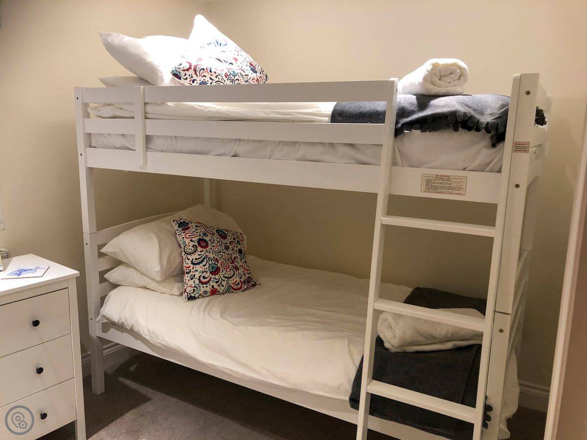 It sleeps six. Three bedrooms. One has twin beds, one has an adult-sized bunk bed, and there's another twin room up on the top floor. There's one bathroom, it's a shower room. It's on the ground floor at the back.