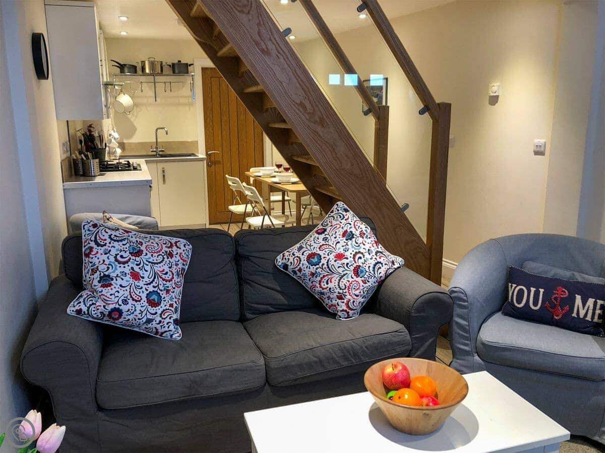 The stairs are open tread and a bit steep. They're cottage stairs. The ground floor is all open plan: living room at the front, then the kitchen and dining area. There's a small outside space you get to through the bathroom.