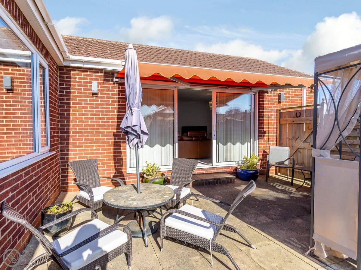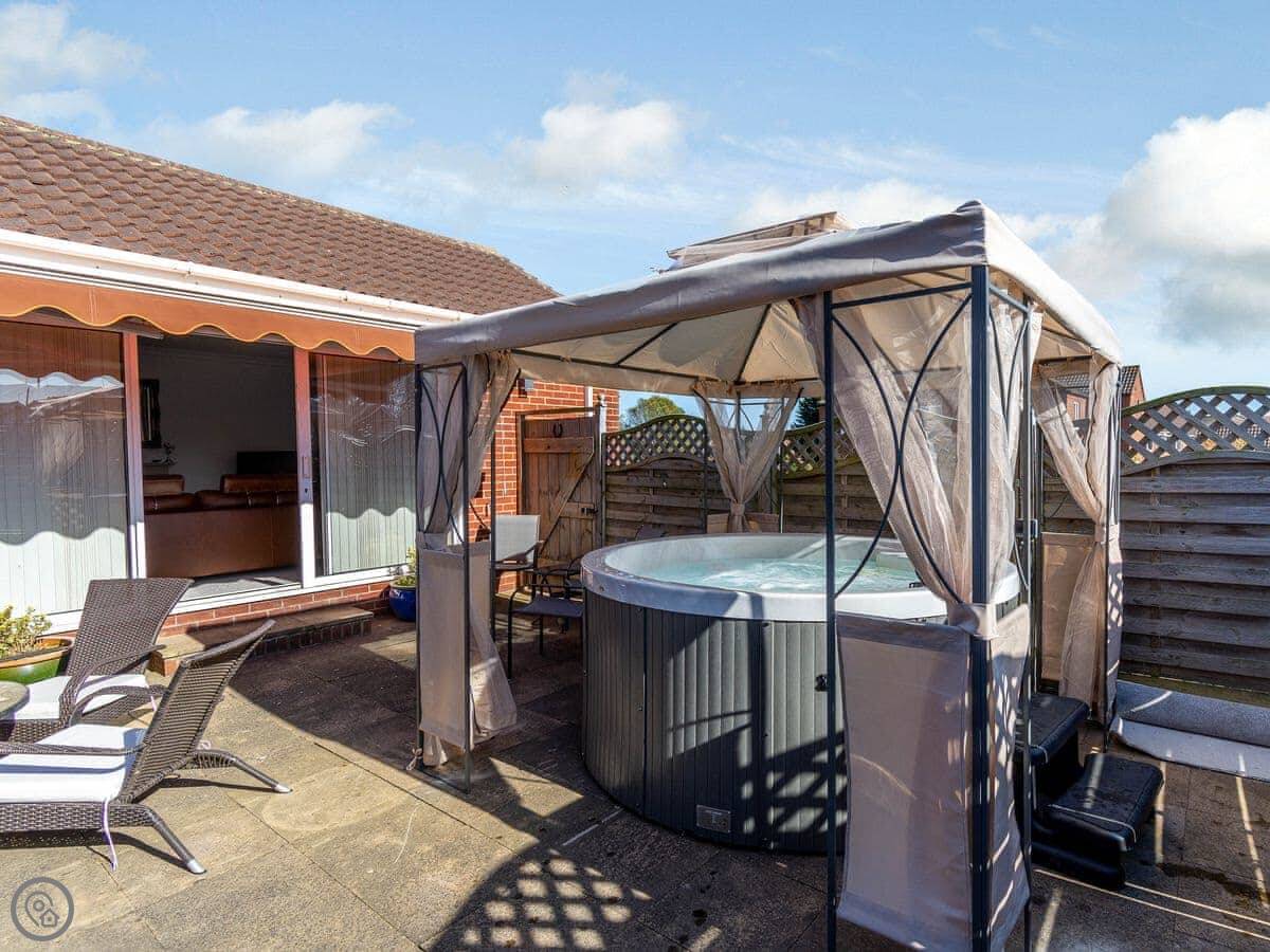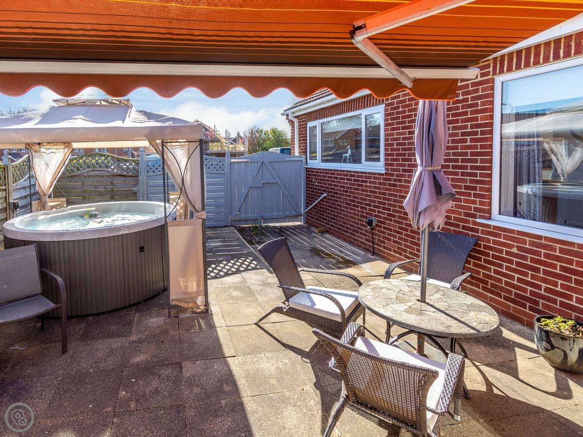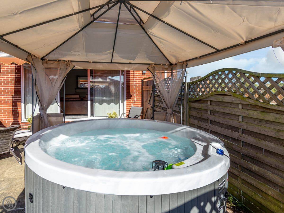 It sleeps six. Three bedrooms, two bathrooms. It's got a 4 Star rating. The garden is enclosed, so it's safe for kids or dogs. There's a patio and a hot tub at the front.