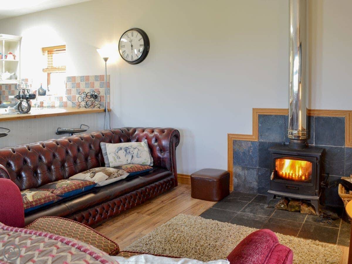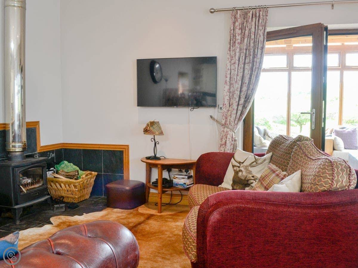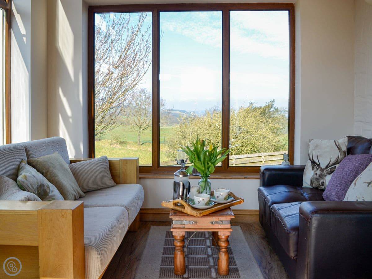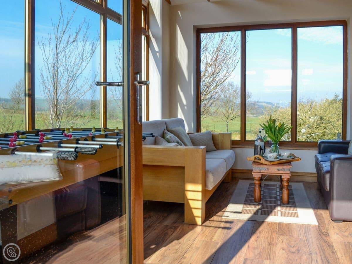 The main room is open plan. There's a wood burning stove. Off that is a conservatory with a table football game and chairs to look out at the view. The view is over the fields and the valley, Annandale. You're up on the hill a bit.