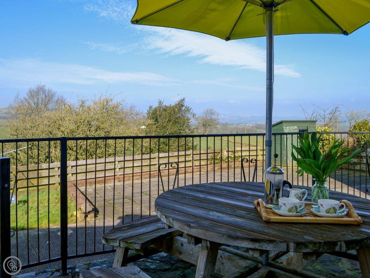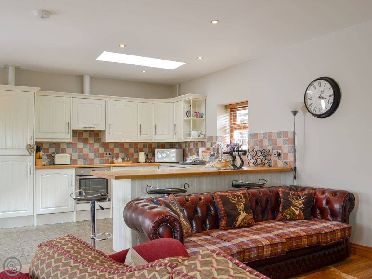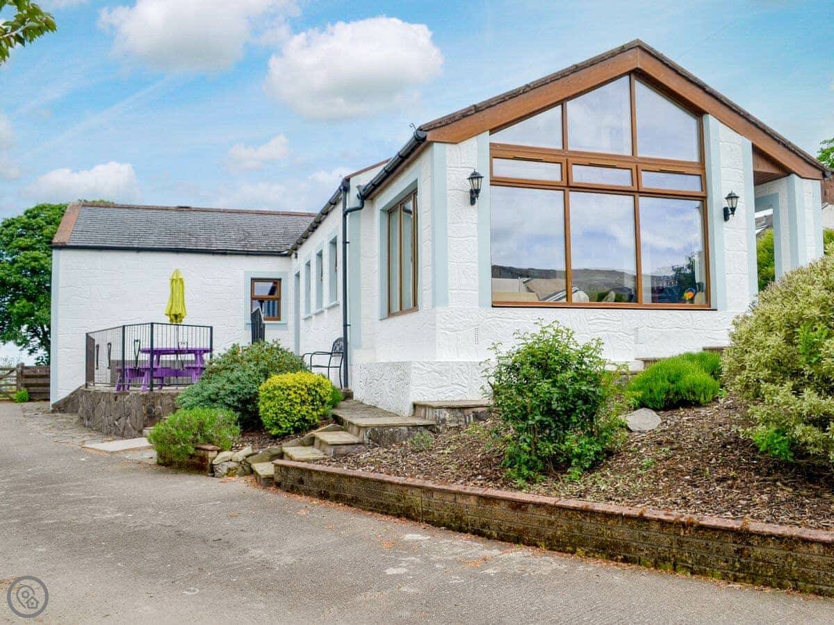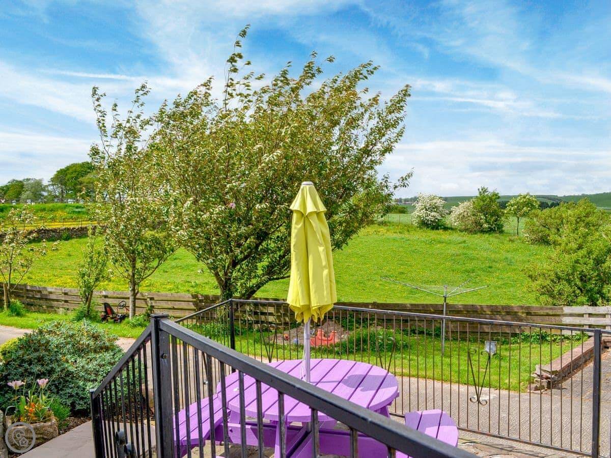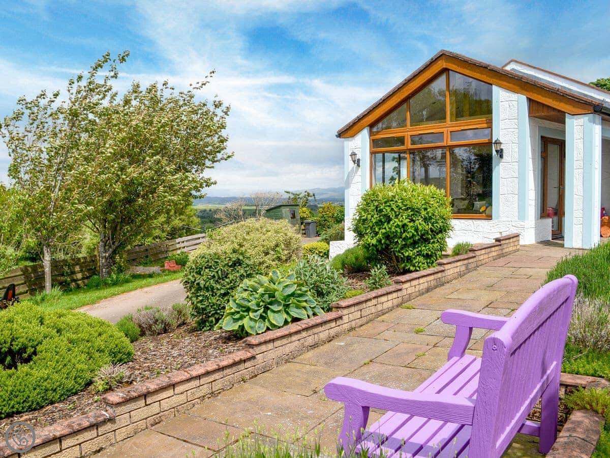 The main room is open plan. There's a wood burning stove. Off that is a conservatory with a table football game and chairs to look out at the view. The view is over the fields and the valley, Annandale. You're up on the hill a bit.