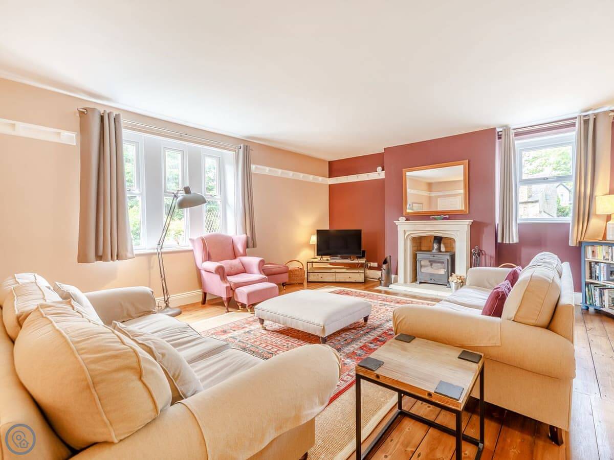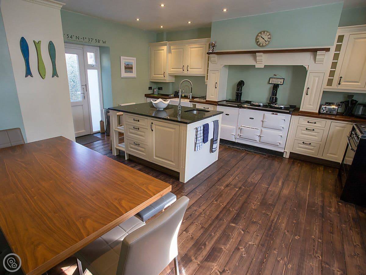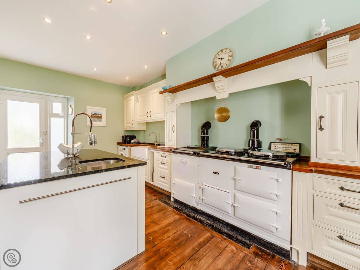 The Old Reading Room oozes character and charm throughout its spacious rooms. Retaining many features of the historic past, including beams and stripped wood floors, it is bursting with elegance and makes the perfect holiday home to gather with friends, family or for an amazing getaway. The beautiful and impressively spacious living room has a feature fireplace housing an attractive wood burner, with period plate shelving around all the walls, currently used as storage for books. This is a delightful room and the hub of the home. The individually designed, bespoke, statement country kitchen has been custom made by a local kitchen maker, and has granite and solid wood worktops as well as a large island and butler sink. A fabulous wide central staircase with polished timber handrails lead to first floor landing with two skylights providing oodles of natural light and the exposed beams accentuate the historic nature of this gorgeous home.