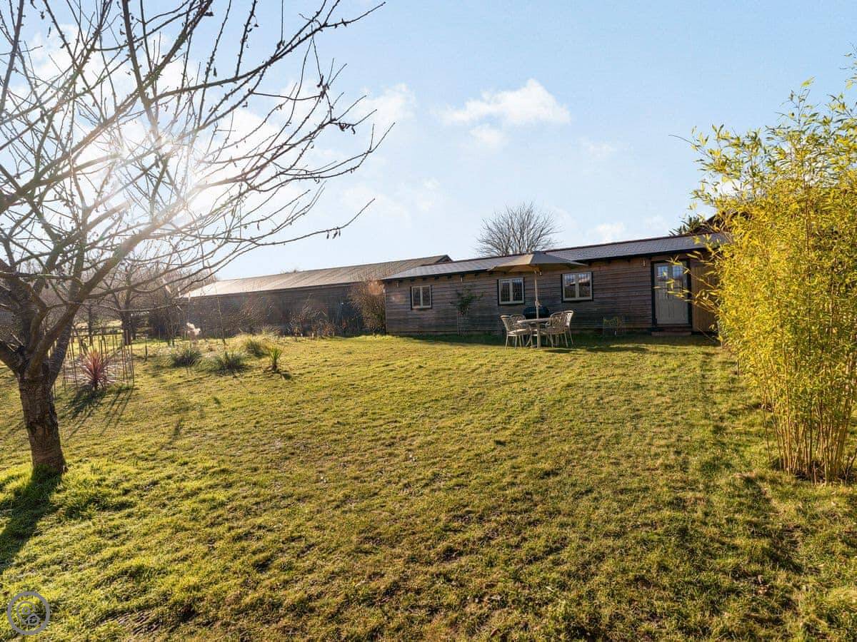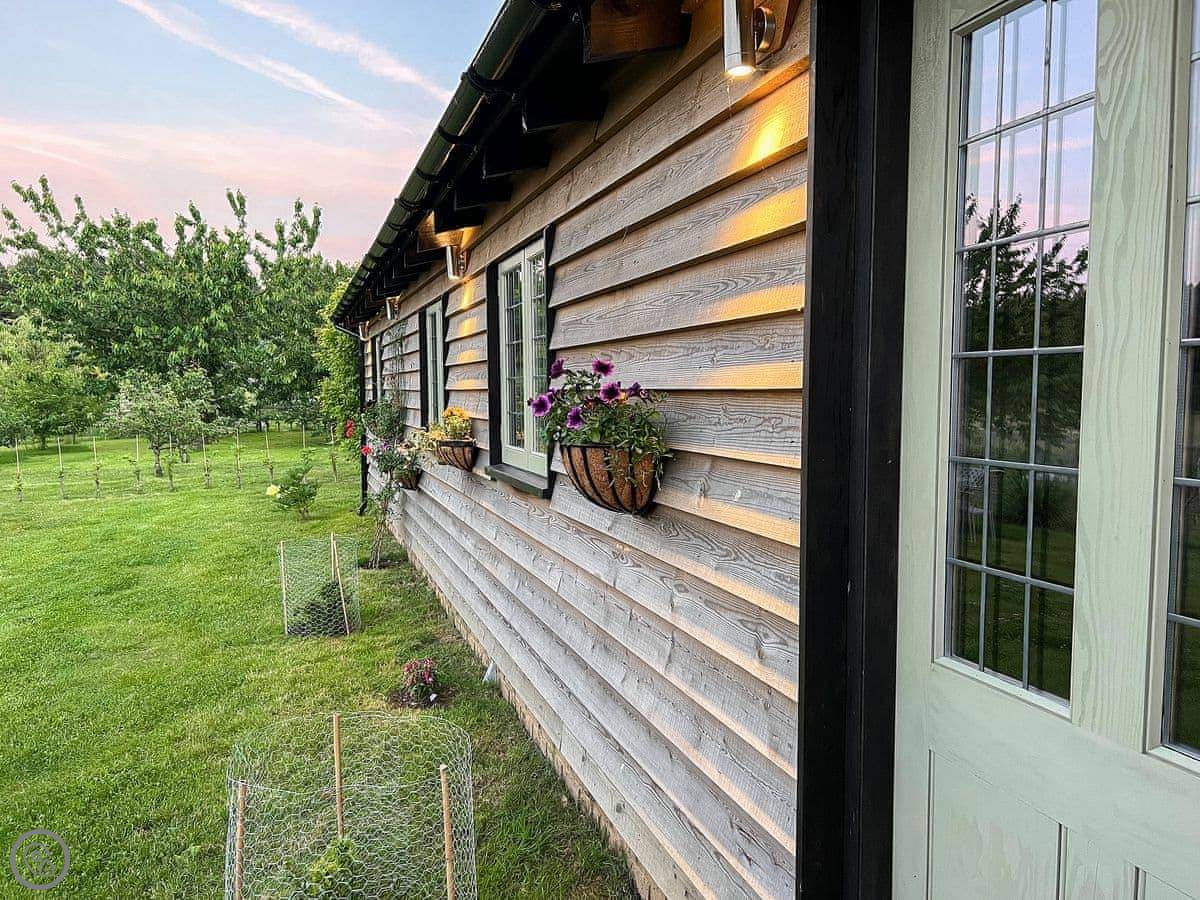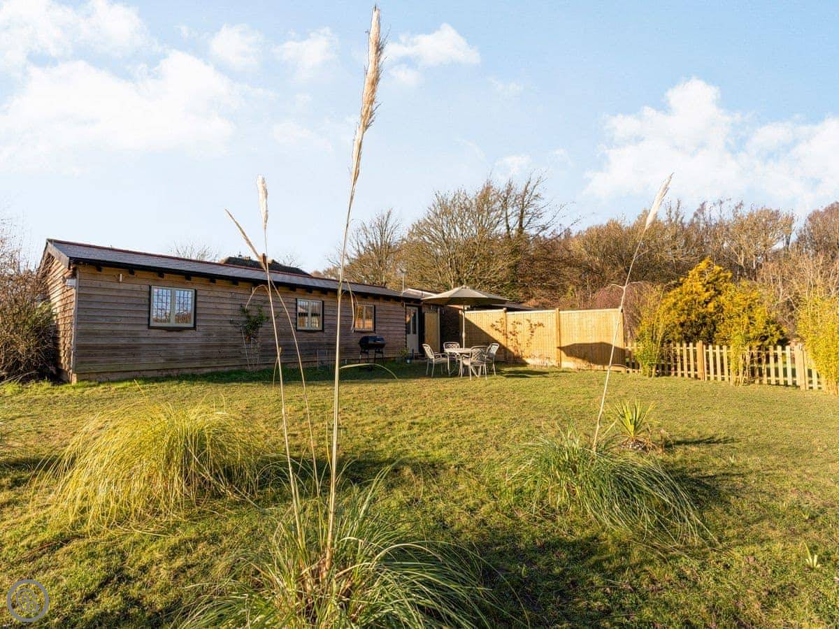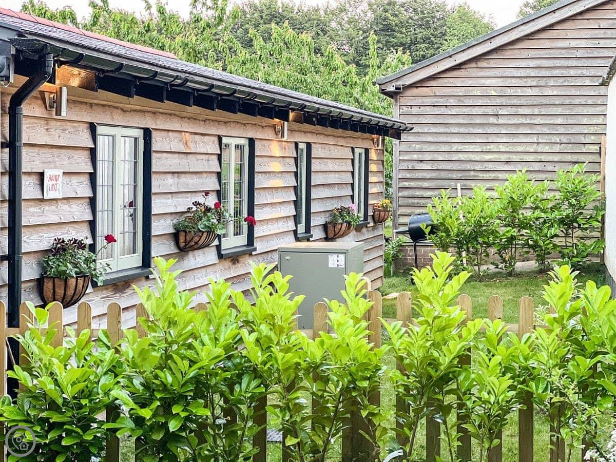 Snowdrop Lodge is in Challock, Kent. It's a new lodge, built in 2021. It's part of a pair with Bluebell Lodge, so you can book both if you need space for eight.