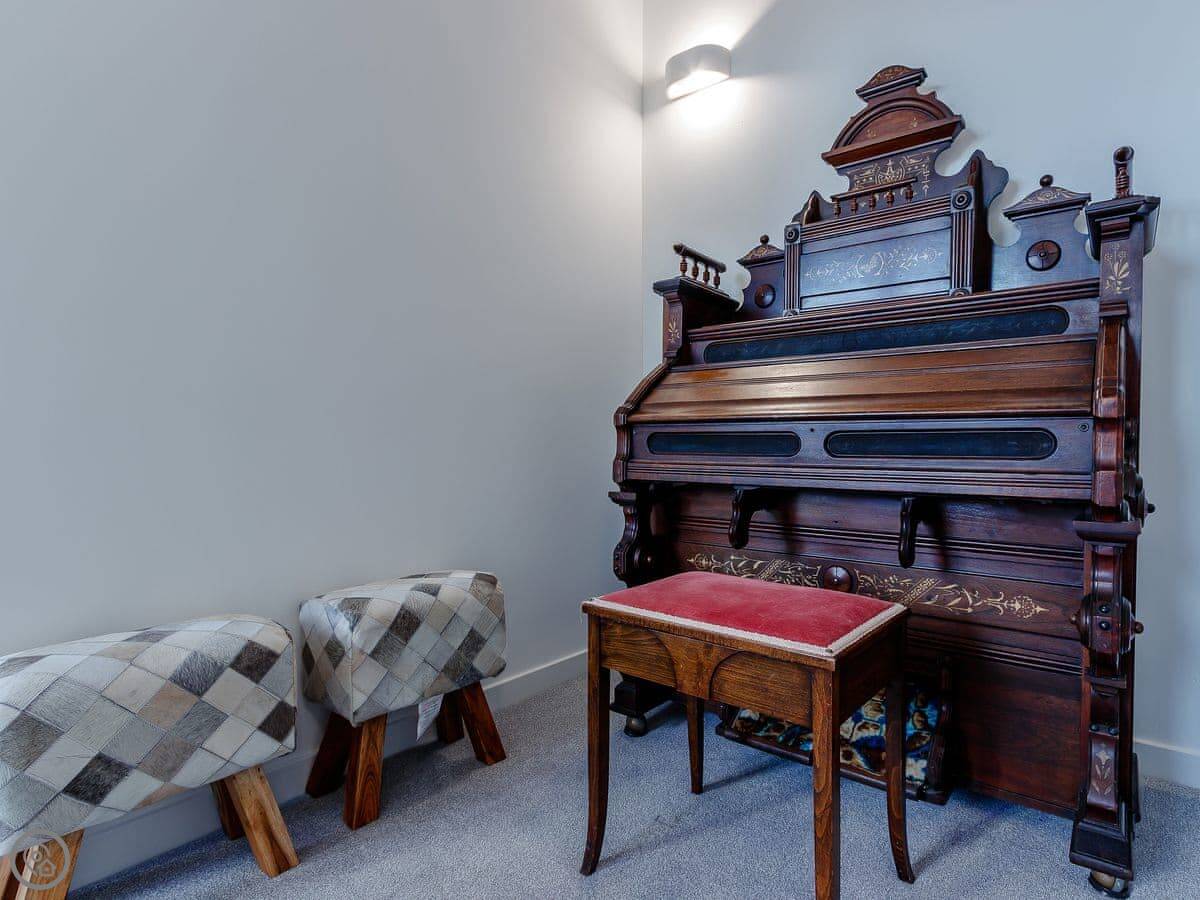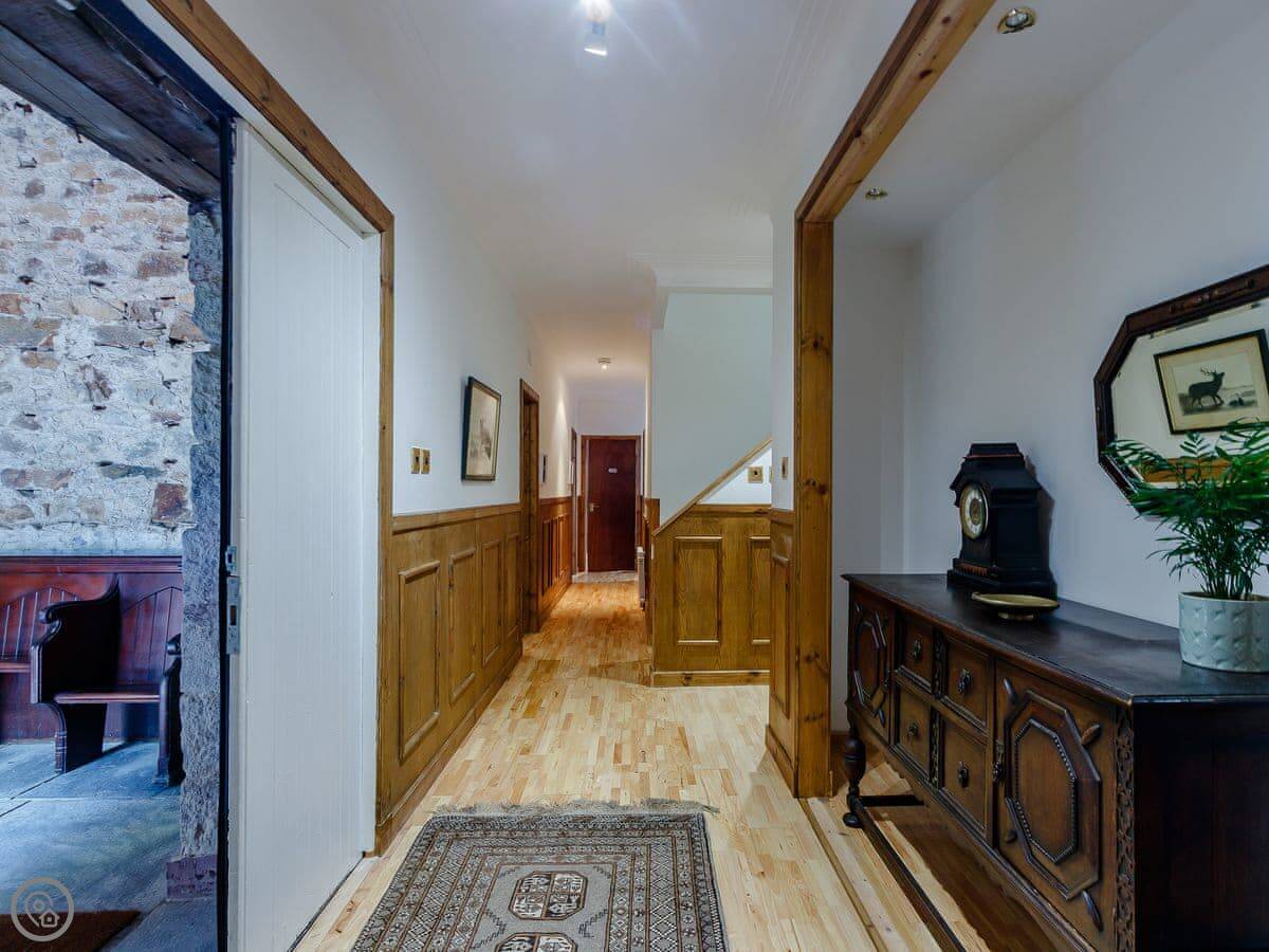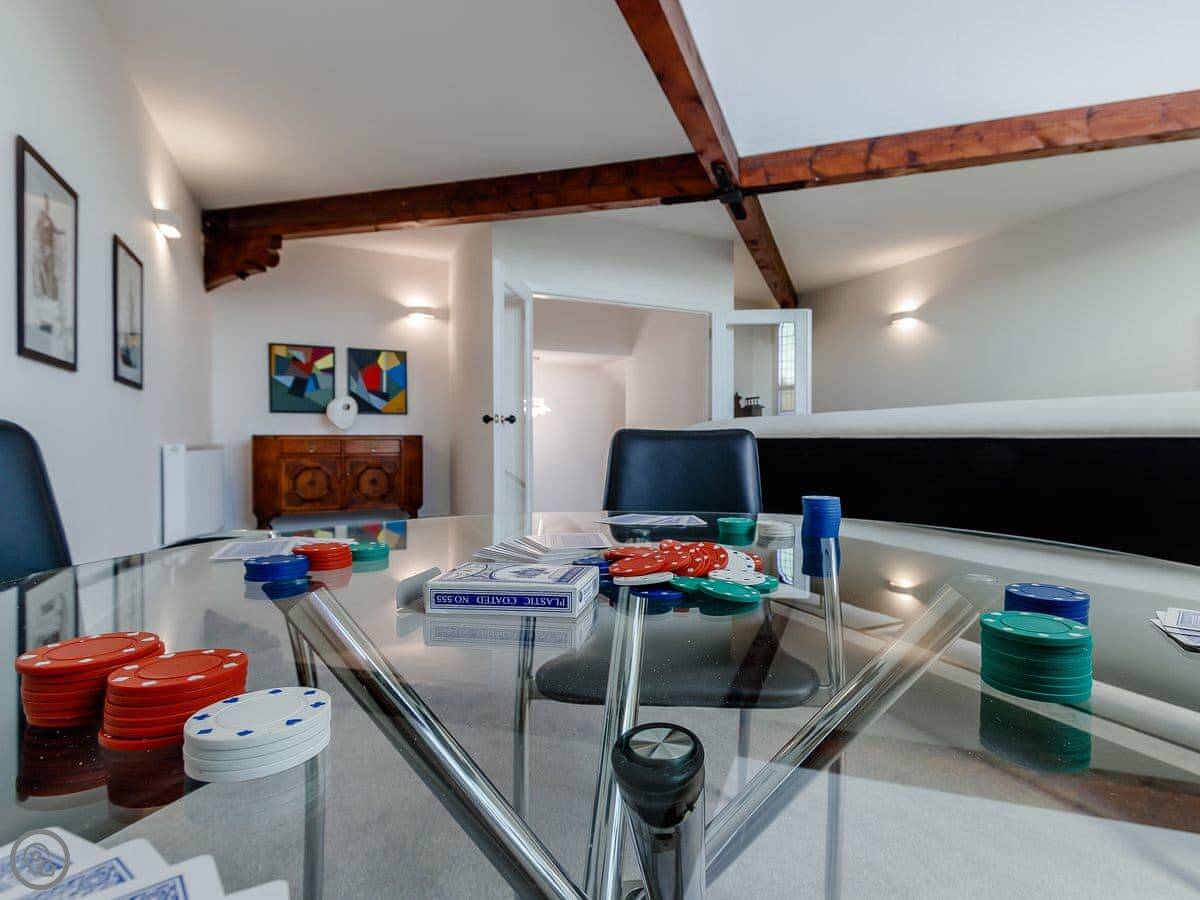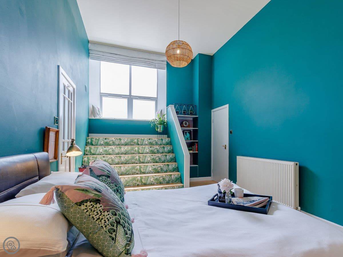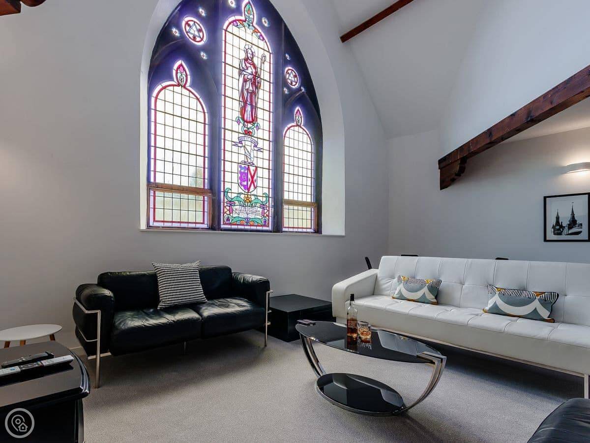 It sleeps ten people in five bedrooms. There are three bathrooms. It’s got a 4 Star rating, which means it’s well set up and comfortable. The living room is upstairs to make the most of the stained glass window. The ceilings are high.