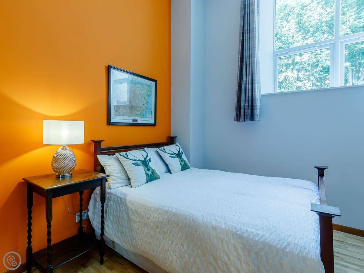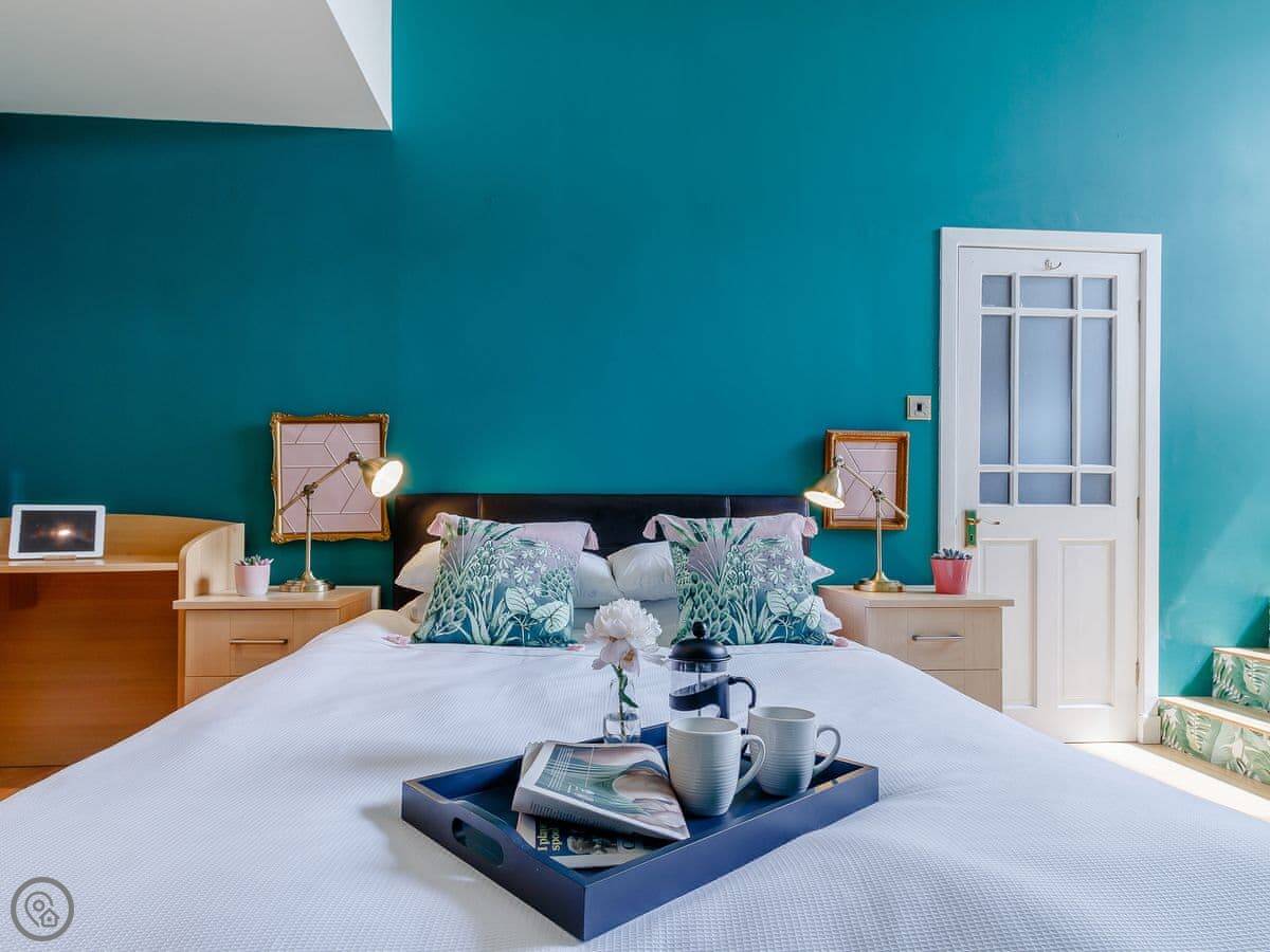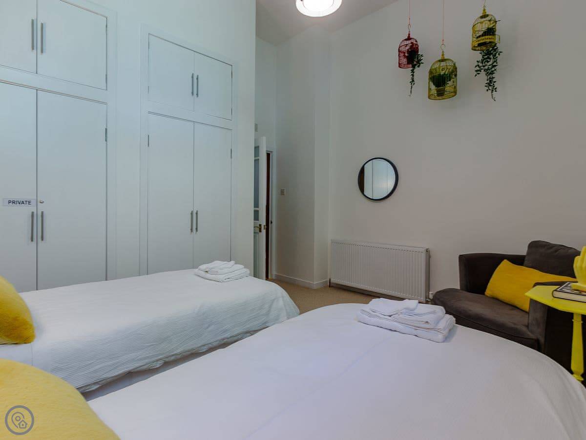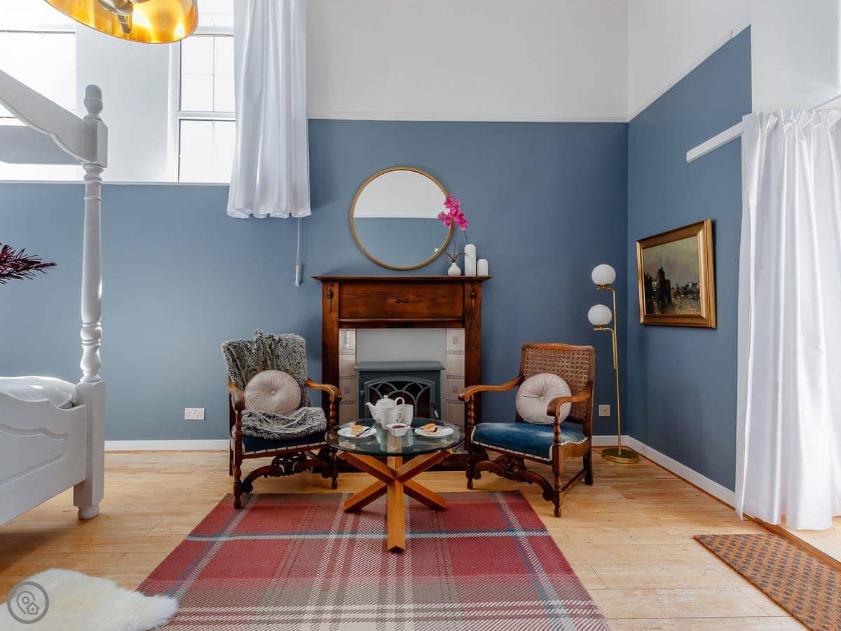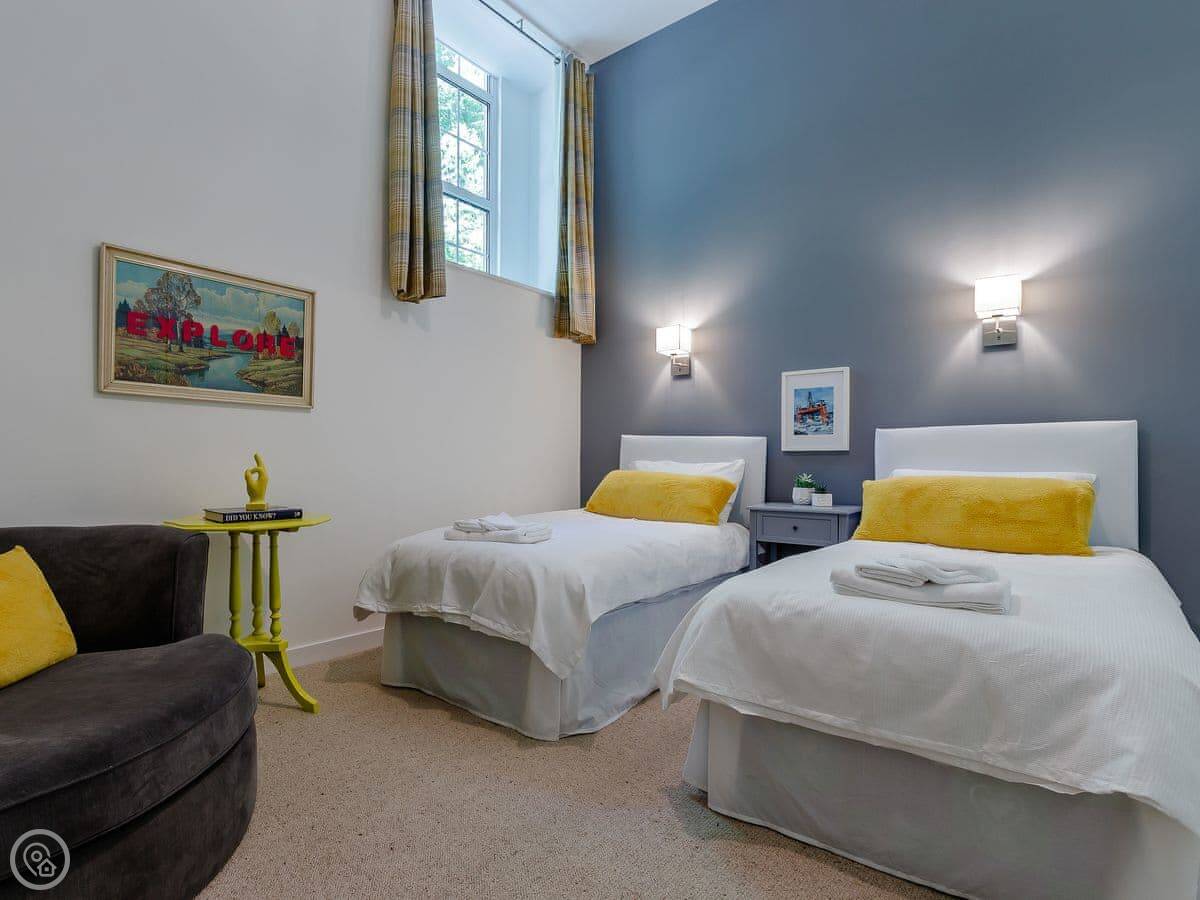 It sleeps ten people in five bedrooms. There are three bathrooms. It’s got a 4 Star rating, which means it’s well set up and comfortable. The living room is upstairs to make the most of the stained glass window. The ceilings are high.