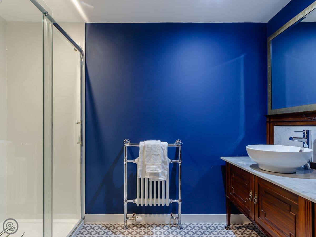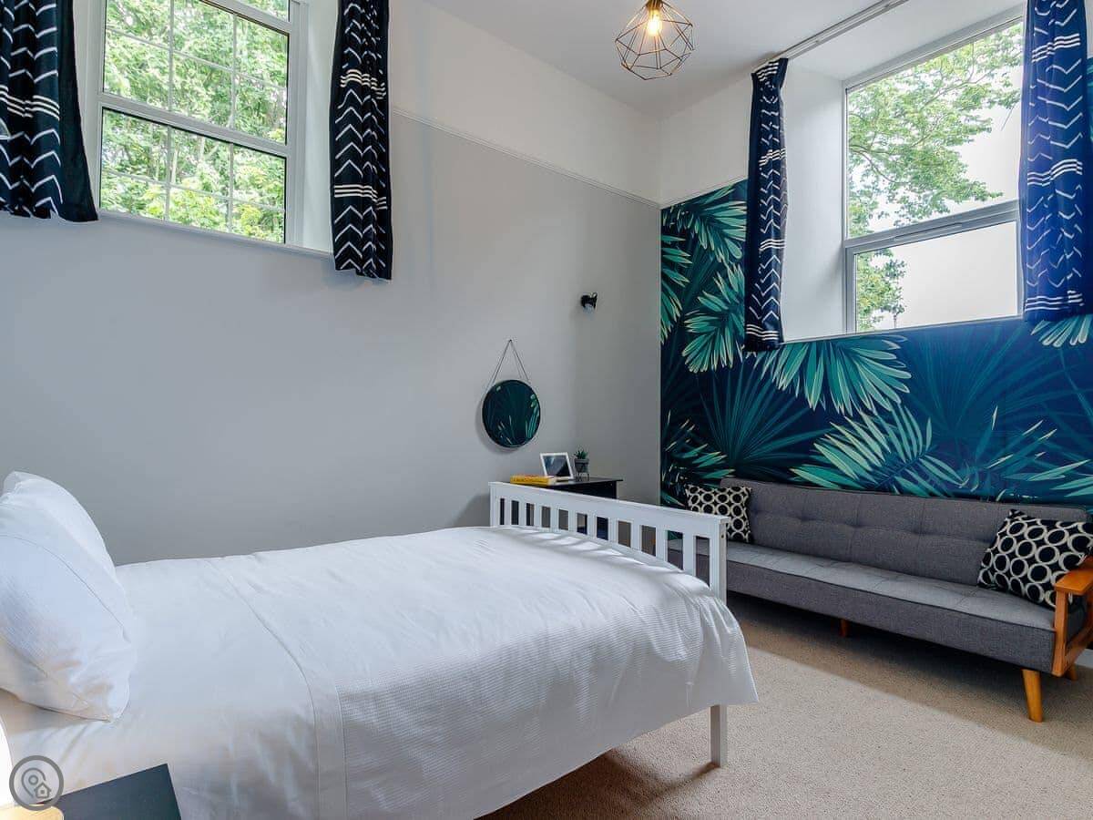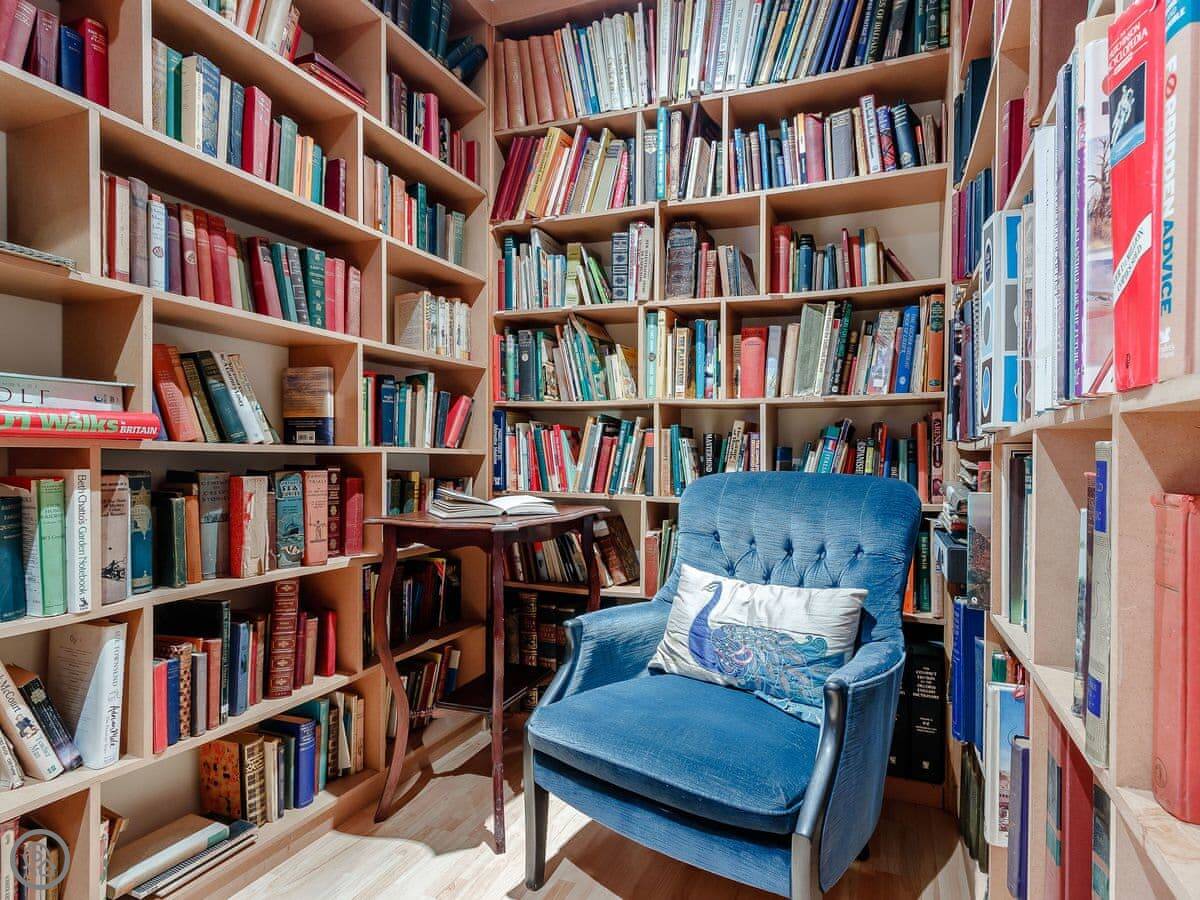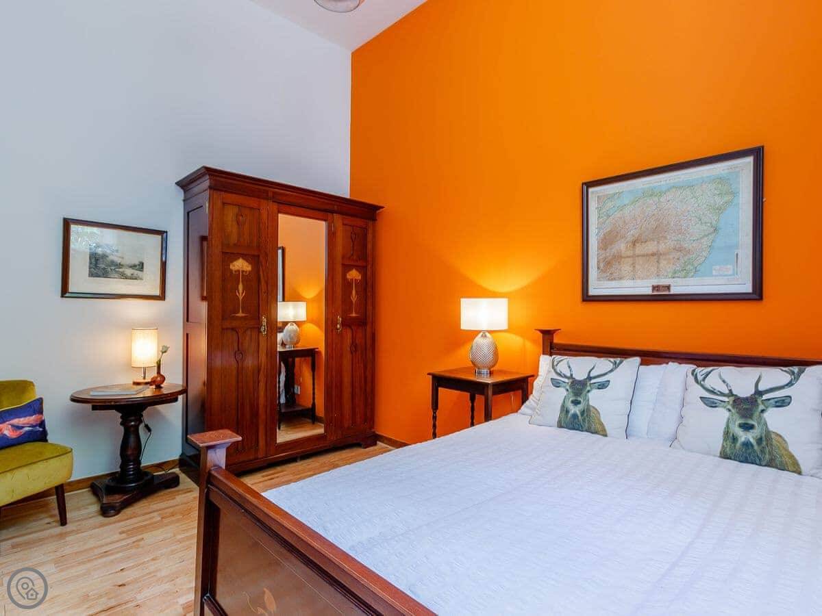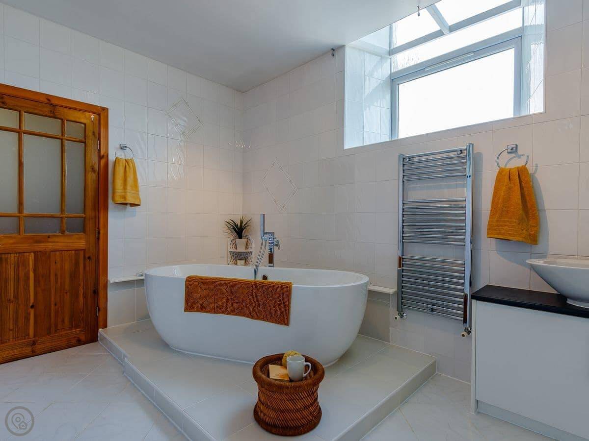 It sleeps ten people in five bedrooms. There are three bathrooms. It’s got a 4 Star rating, which means it’s well set up and comfortable. The living room is upstairs to make the most of the stained glass window. The ceilings are high.