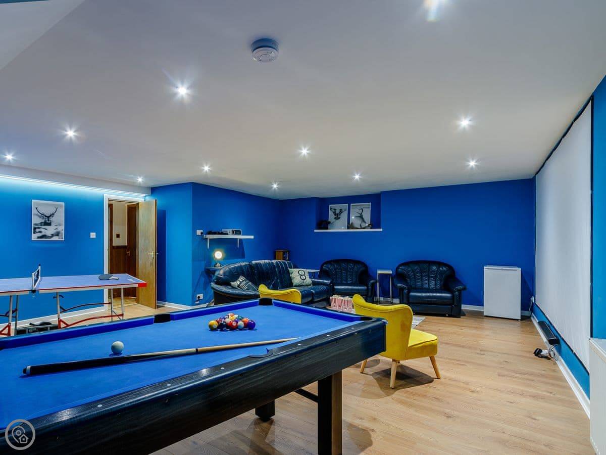 The main living space is on the ground floor. The kitchen and dining area open out to the back garden through sliding doors. There's a cinema room and a games room, which are useful if the weather turns.