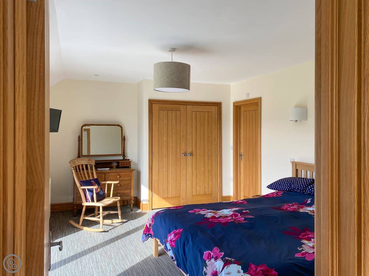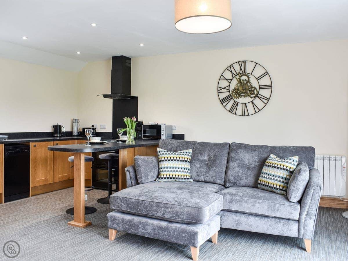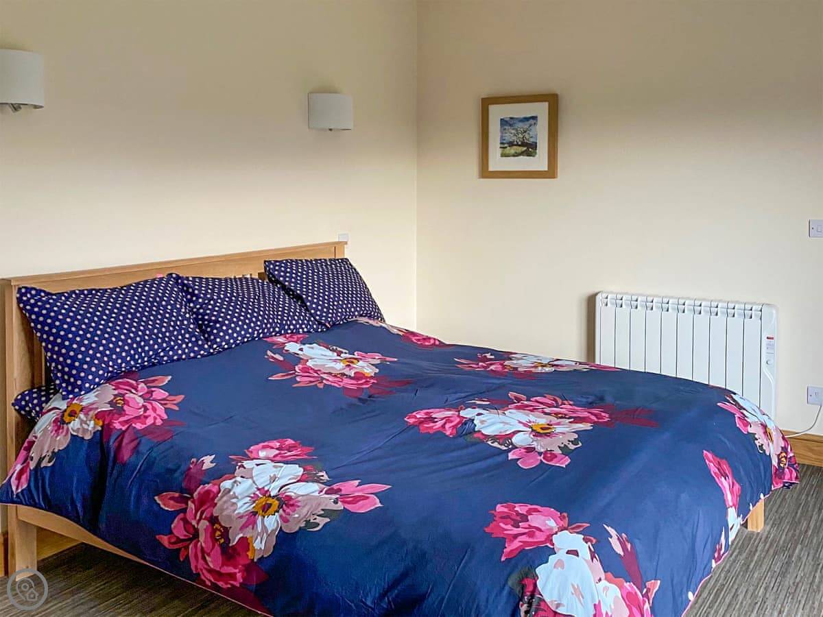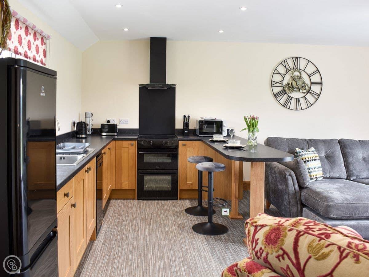 It’s for two people. One bedroom, one en-suite shower room. It's a 4 Star place, which means it's well-finished and everything's new. The bed is a super king. The living area and kitchen are all one open space with big doors out to a balcony.