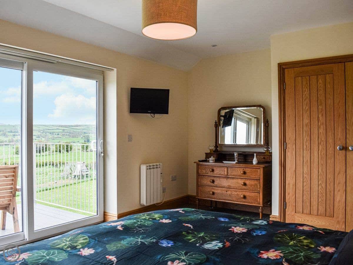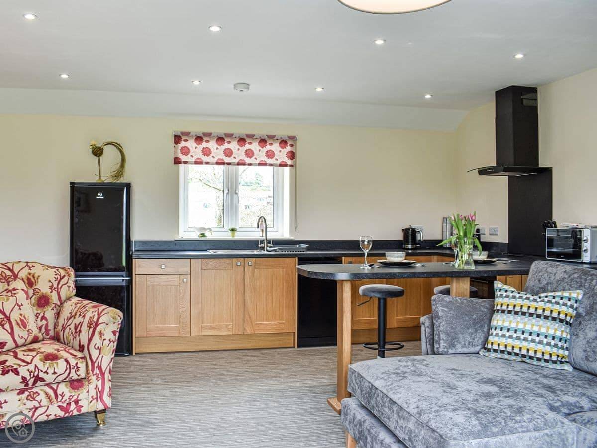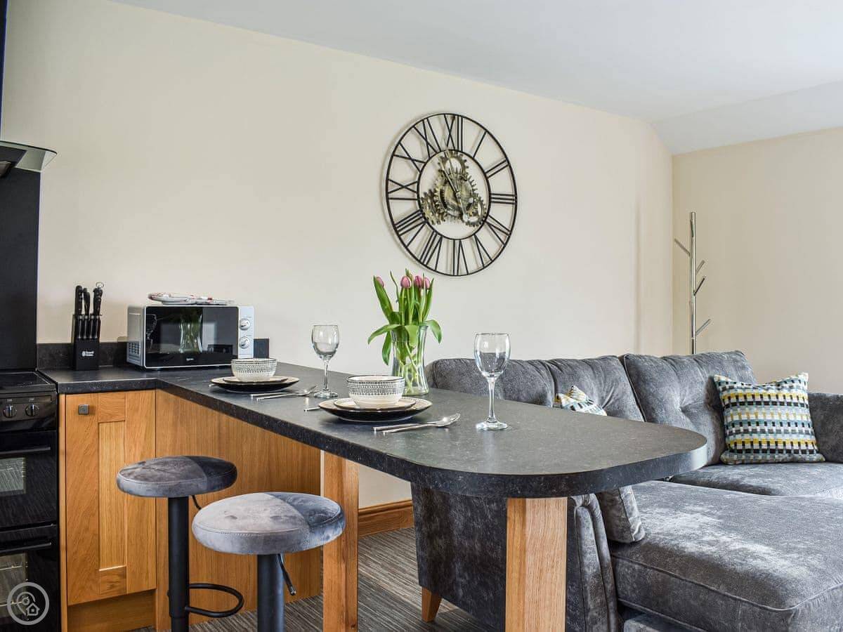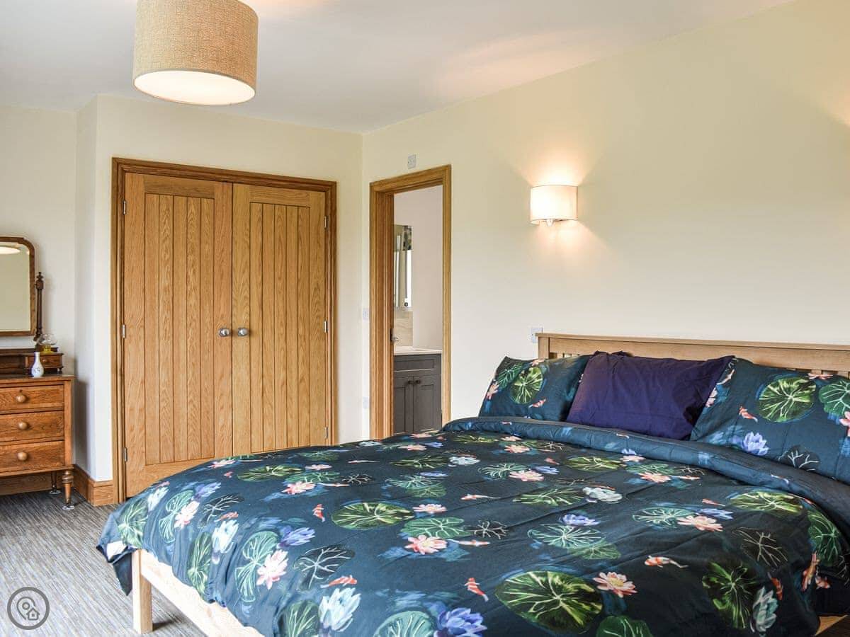 It’s for two people. One bedroom, one en-suite shower room. It's a 4 Star place, which means it's well-finished and everything's new. The bed is a super king. The living area and kitchen are all one open space with big doors out to a balcony.