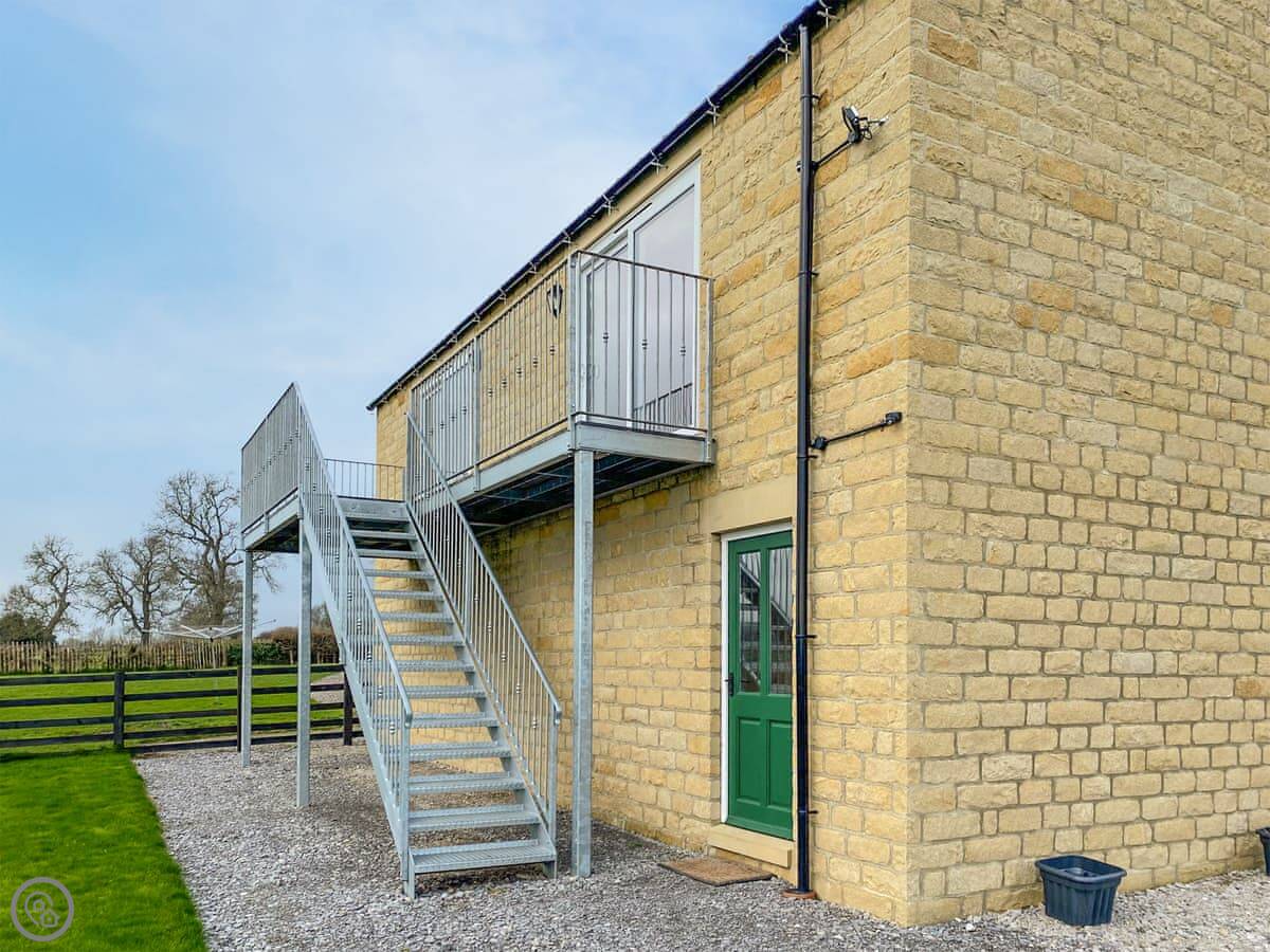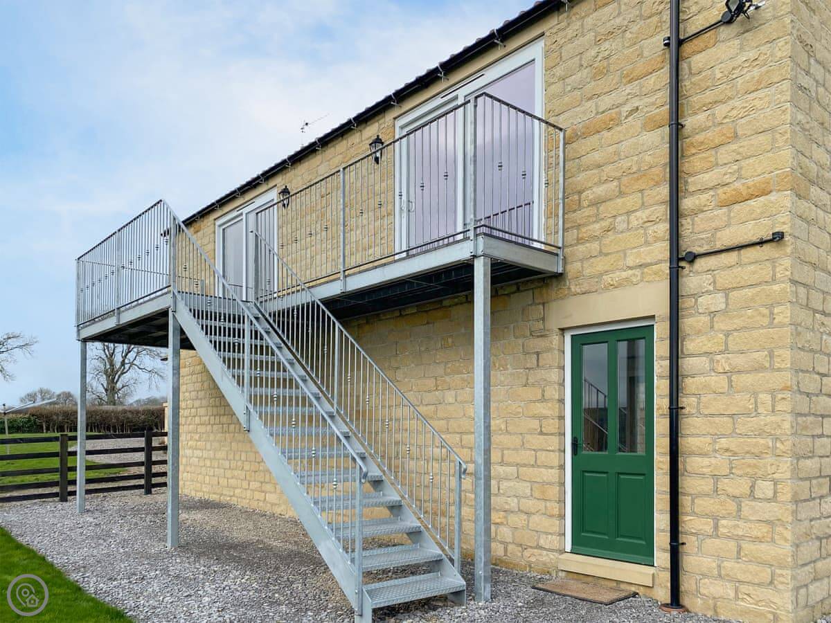 You should know it's upstairs. There's an external spiral staircase to get to the front door. It's sturdy, but it's a spiral staircase.