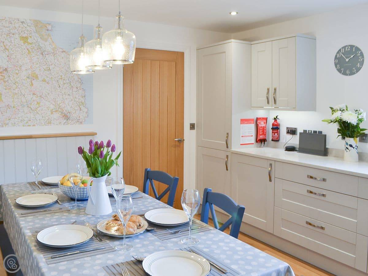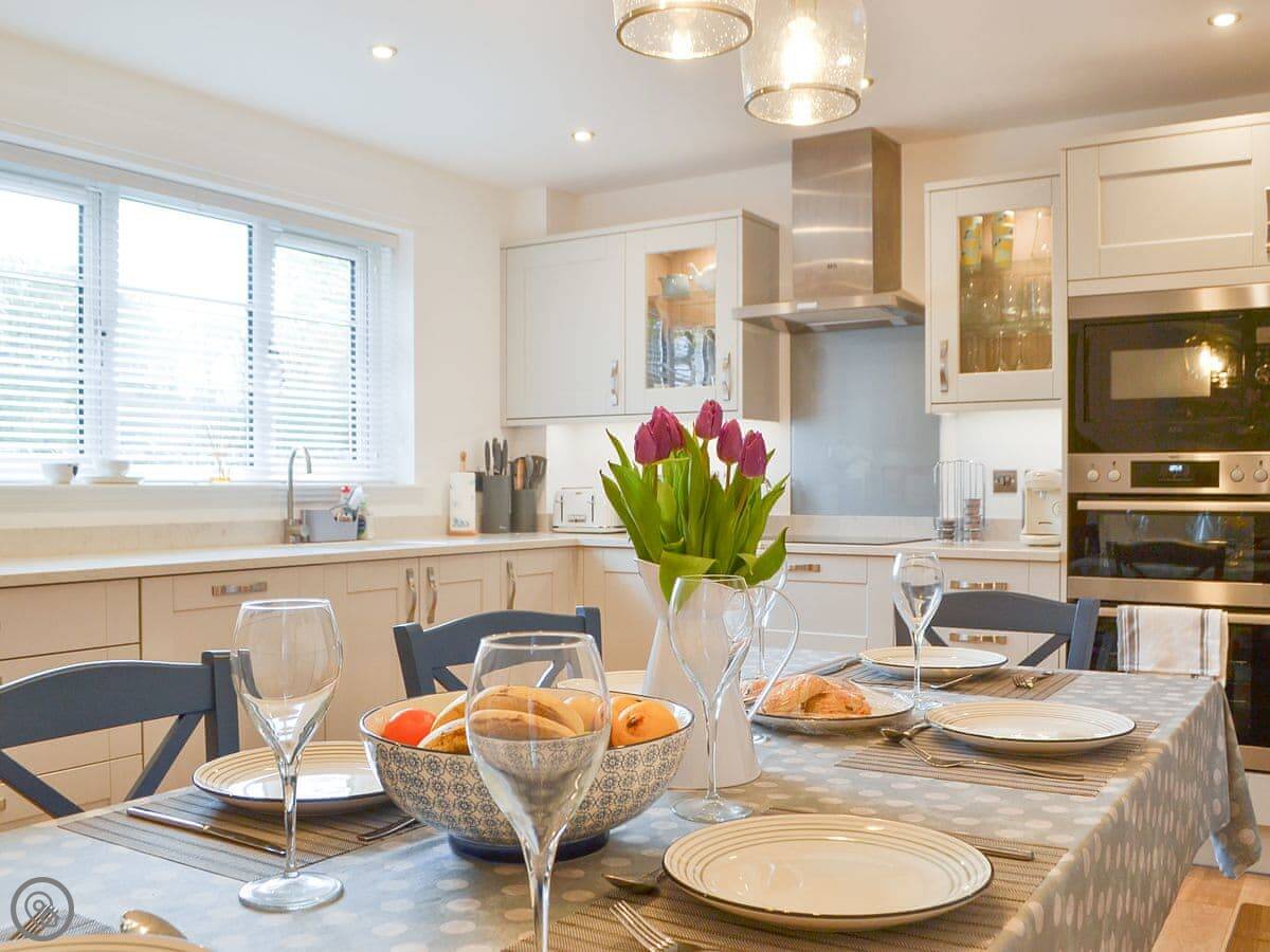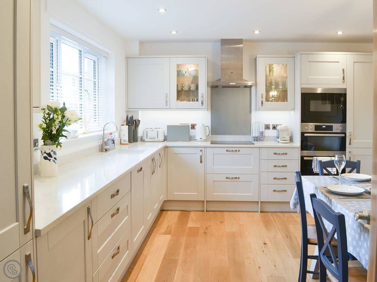 With private parking and enclosed lawned garden benefiting from distant sea views over attractive countryside and farmland. With tasteful interior décor and oak flooring, the living room has a wood burner set within an inglenook fireplace. A wonderful cosy seating area with a 50" Smart TV and Sky channels for your entertainment and ultra fast broadband for your convenience. Hive heating also ensures a warm welcome and hot water for your arrival. French doors lead off the living room into the garden, with a large outdoor dining table with seating for eight. The stunning kitchen and dining area provide a great social space to gather. The high specification kitchen has quartz worktops and is fully equipped with all modern appliances; there is a separate utility room with a washer/dryer and a separate ground floor toilet. Upstairs are three bedrooms, two with double beds, the master with a 43" Smart TV, the third room is perfect for the children with bunk beds. All have wardrobe storage. The property is fully equipped with travel cot, high chair, stairgate and fireguard. There is a family bathroom with a bath and shower over. Outside, there is a securely locked shed for storing several bicycles. From the lawned garden and raised patio area, views extend across open countryside to the coast, a lovely place to sit with the family and enjoy breakfast or supper while enjoying the peace and quiet of the countryside.