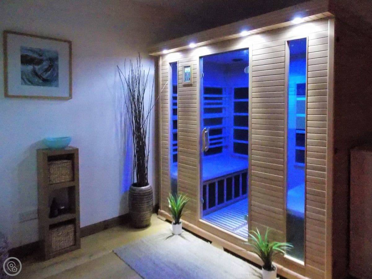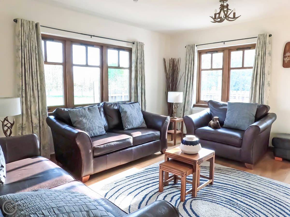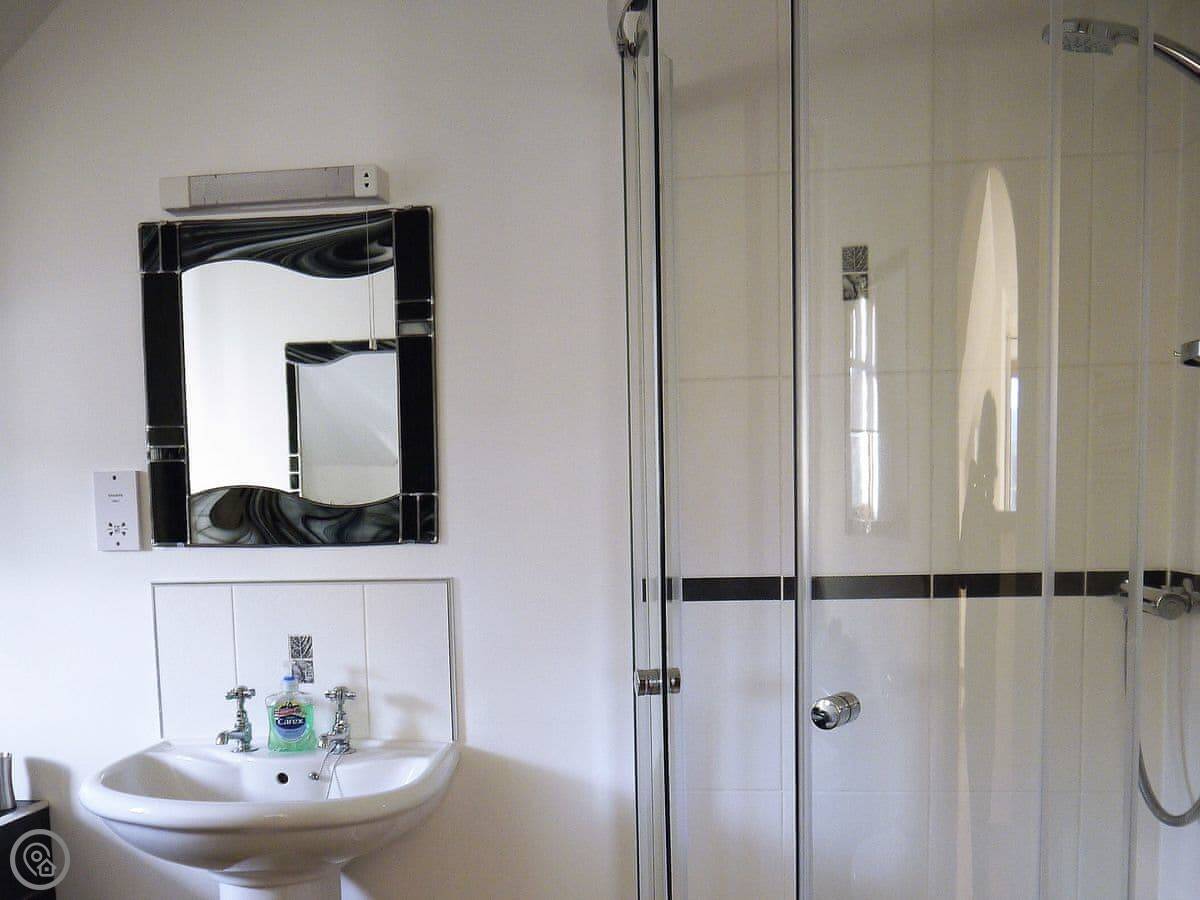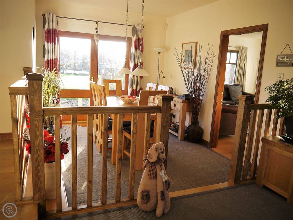 Inside, it's open plan downstairs, with the kitchen and dining area, plus a separate living room with an electric stove. Upstairs, the bedrooms are all en-suite and each has a TV. There's good WiFi.