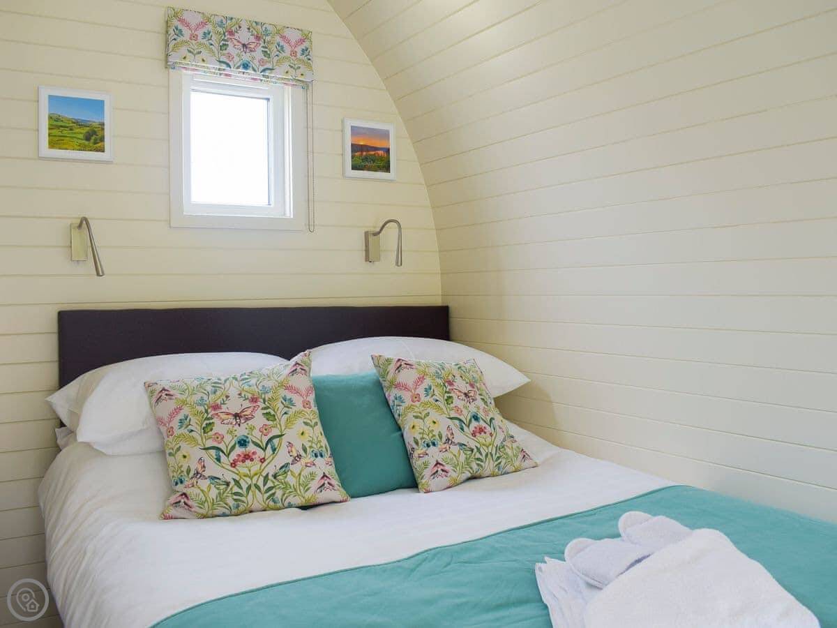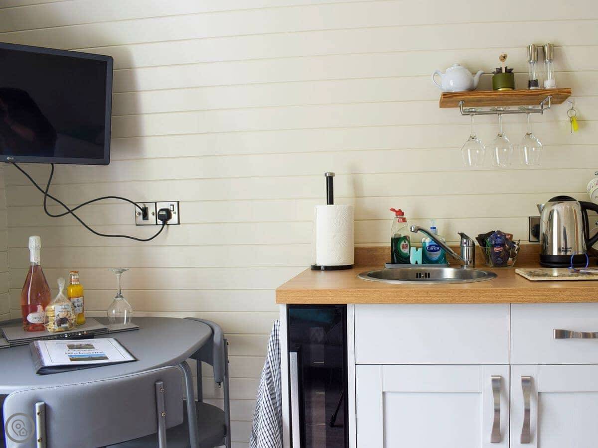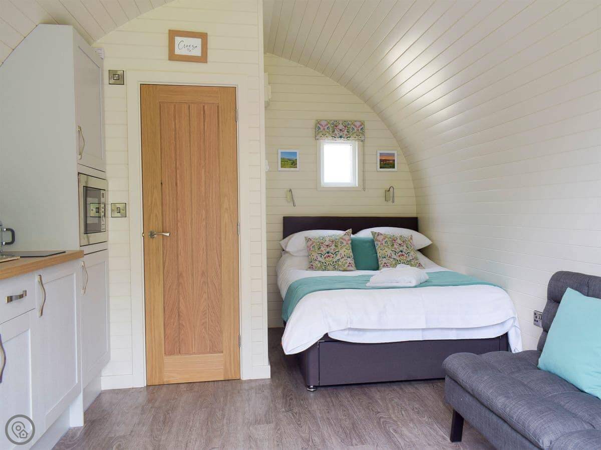 It sleeps two. One room, with the bed, kitchen and sitting area all in the same open space. There's a shower room. It's modern inside, clean and warm. It's got a 4 Star rating.