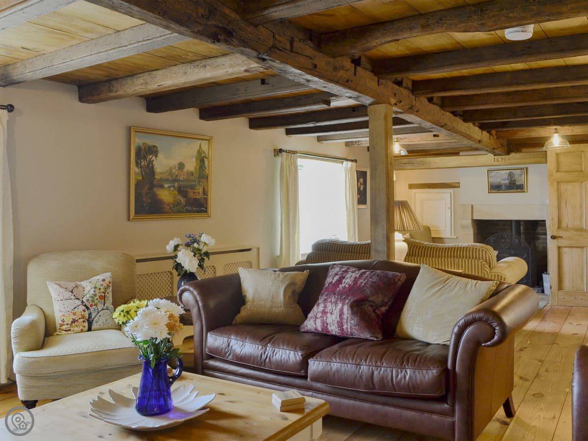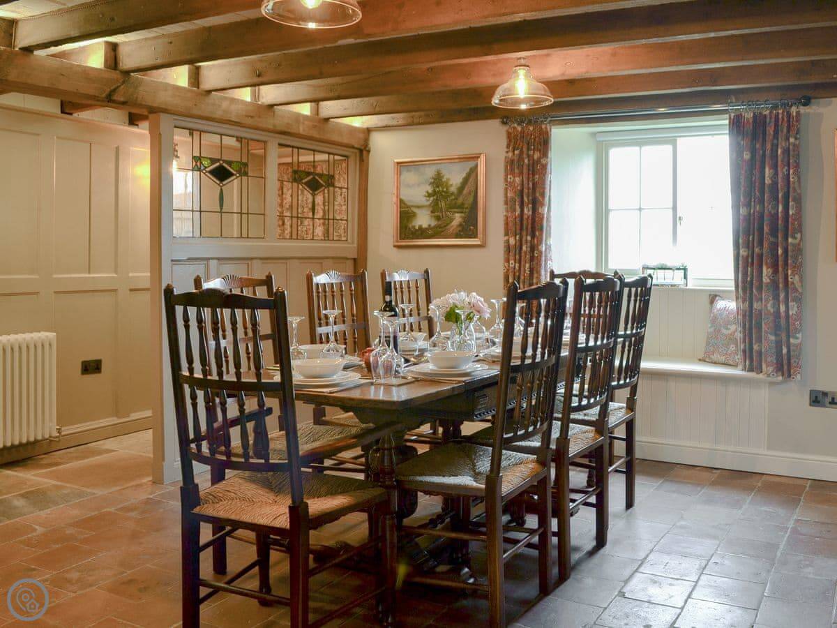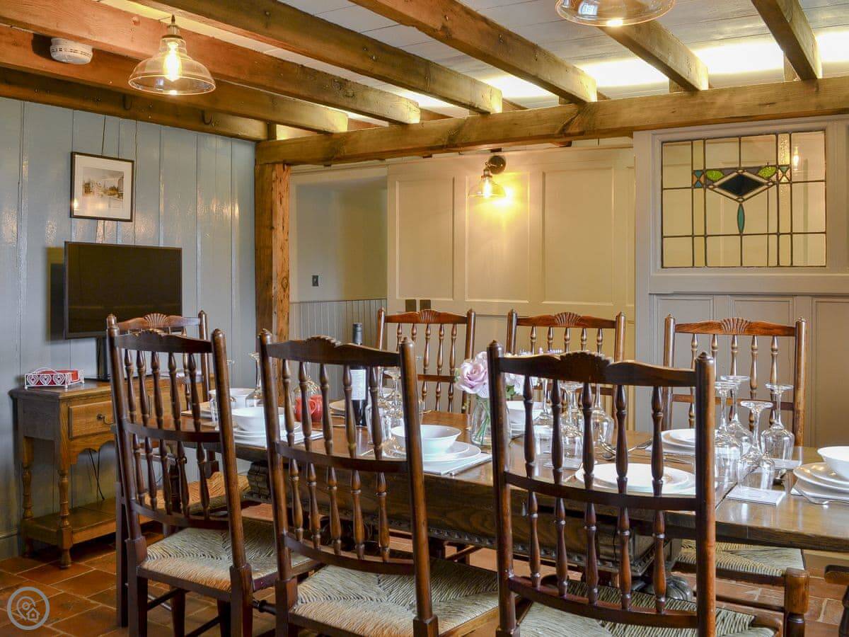 Downstairs, there's a dining room with a low beamed ceiling and the original cooking range. The living room is big, has a wood burner, and looks out the front. There's an antique games table.