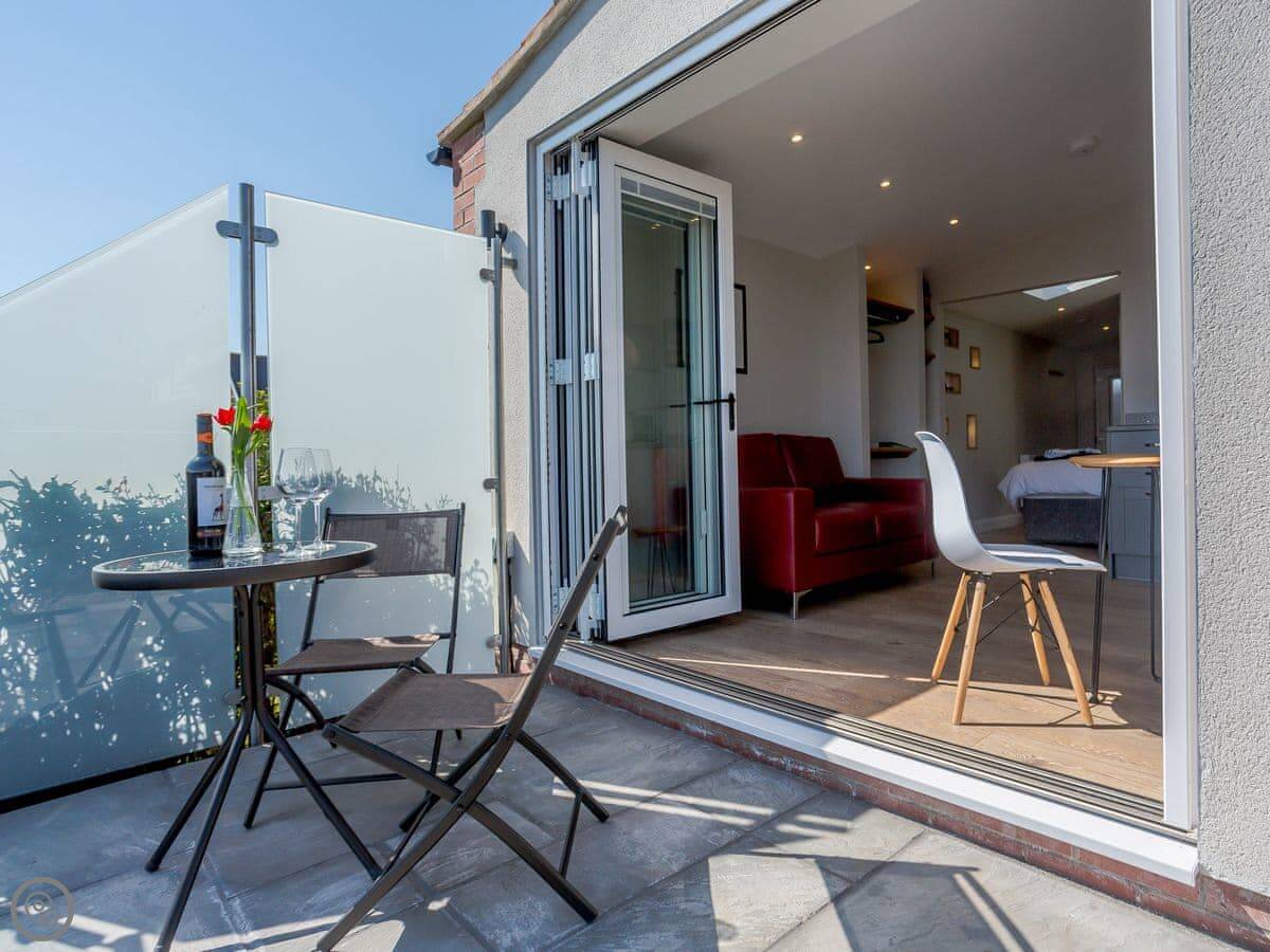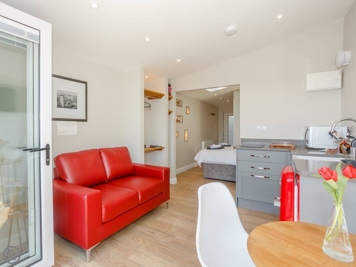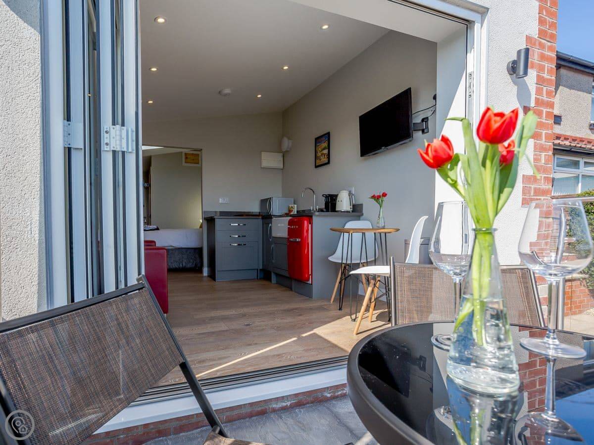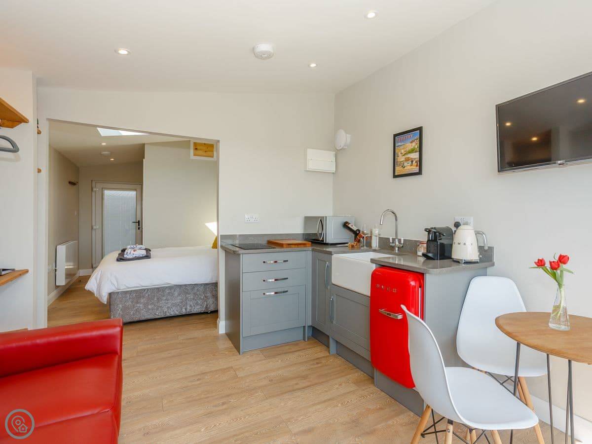 Stepping inside from the driveway enter the compact yet beautifully presented accommodation. The layout maximises the living space and is open plan with the bedroom flowing into the open plan living area, with plenty of light bathing the property from the velux windows as well as the glass wall to wall folding door. The living area has a cosy sofa for two as well as a well-equipped kitchenette. Completing the property, you have a modern shower room adjoining the bedroom. Stepping out onto the patio you look over the owner’s adjoining garden.