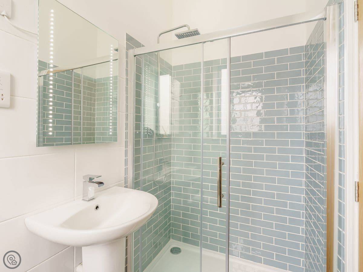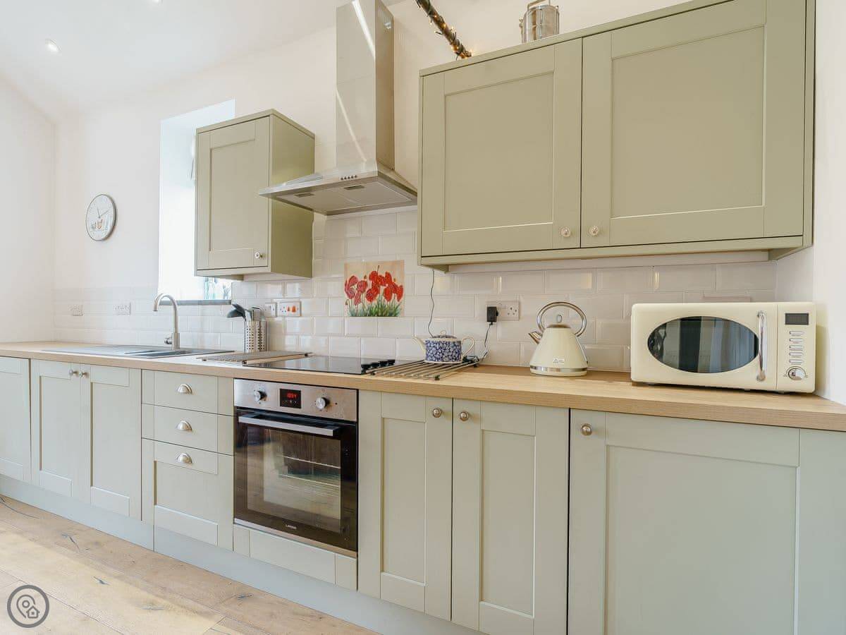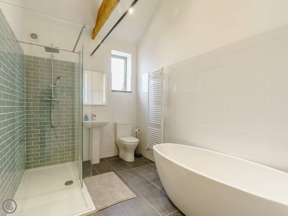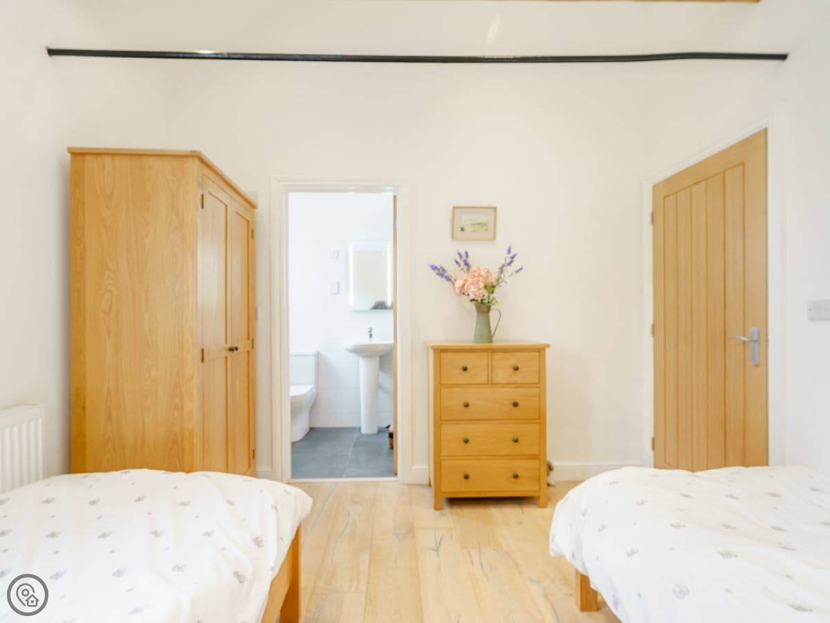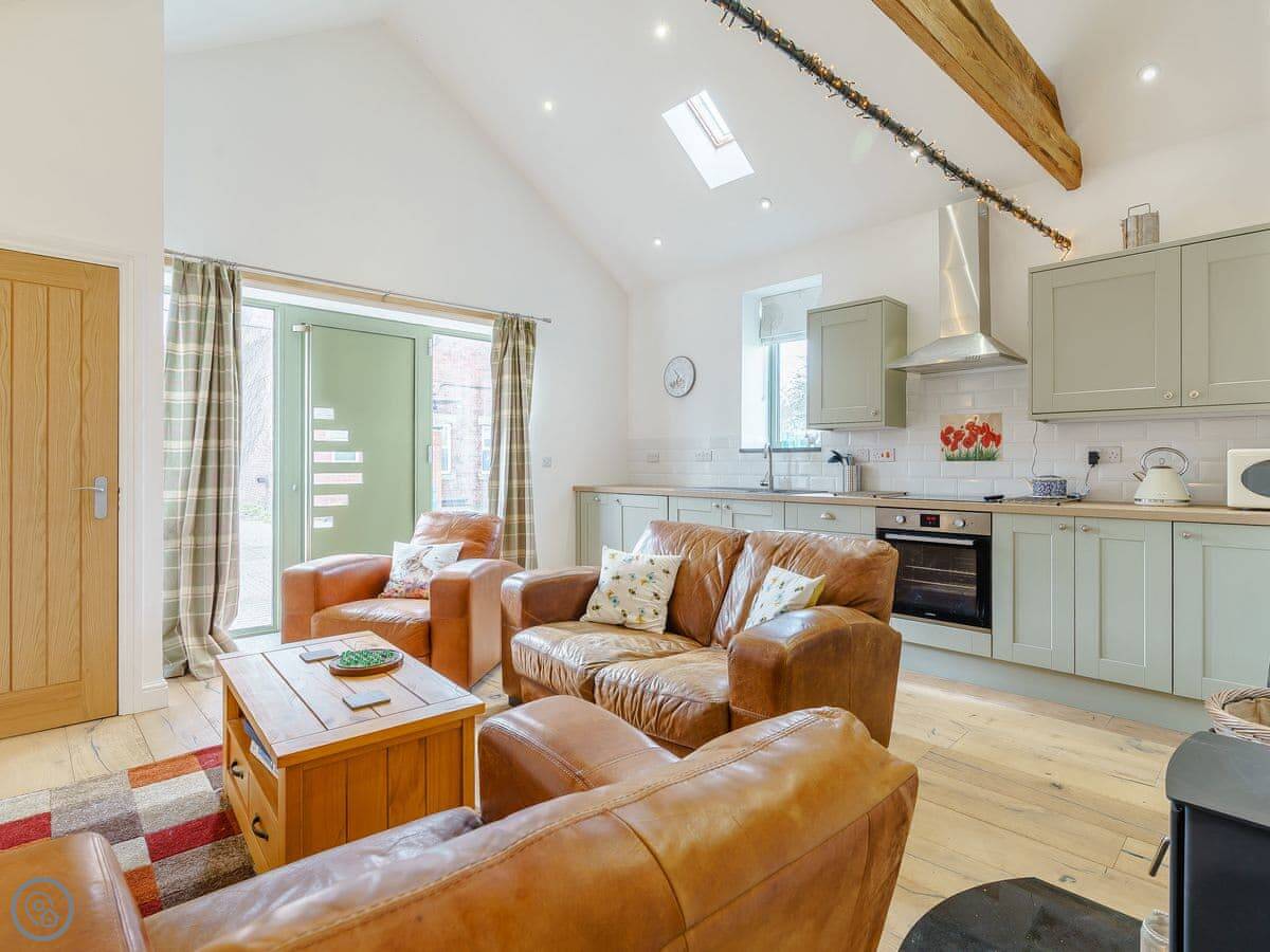 Inside, the living room is bright with a wood burner. The kitchen has everything you need. The main bedroom has a kingsize bed and looks out over the paddock. The second bedroom has twin beds and its own walk-in shower. There's also a family bathroom with a bath and another shower.