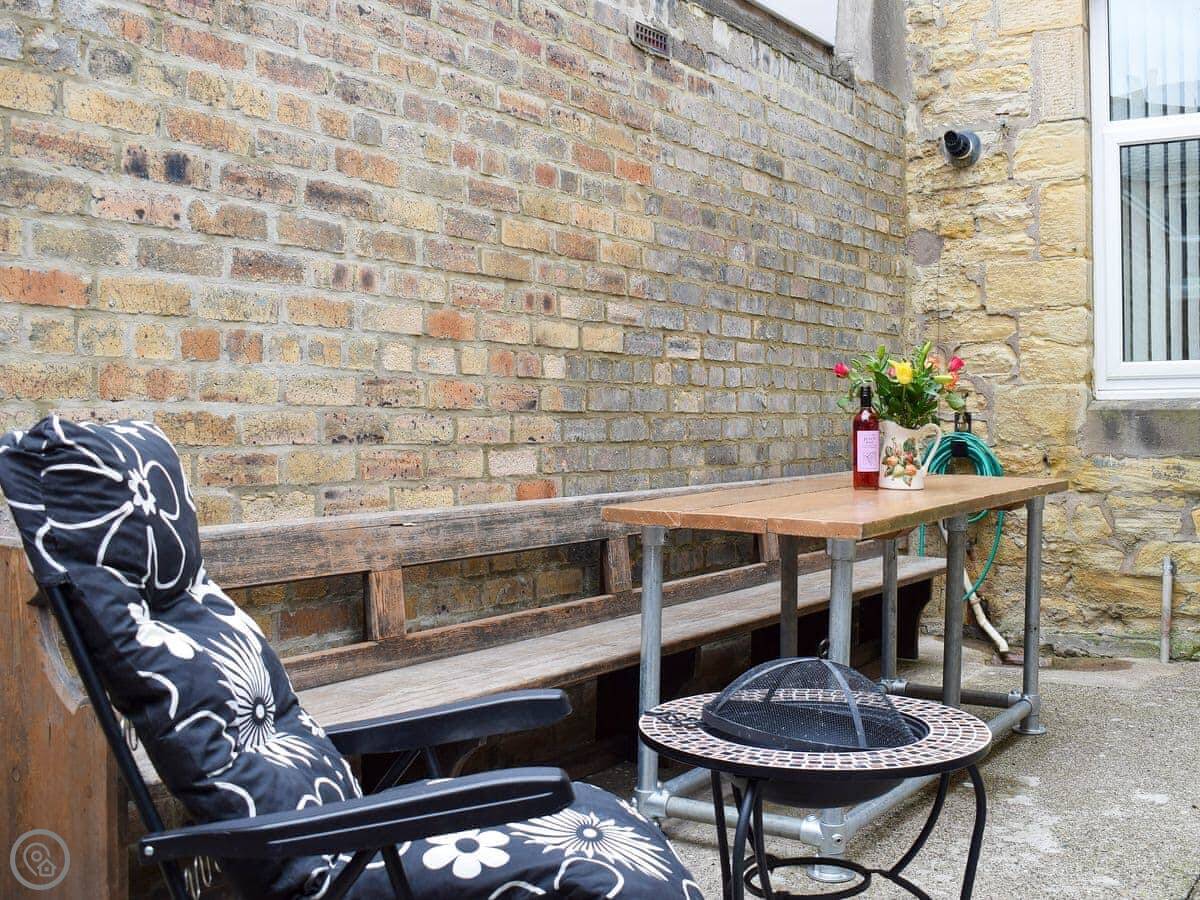 The back garden is a small, enclosed courtyard. There’s a patio set and a fire pit out there. It’s handy for a morning coffee or an evening drink, but it’s not a big lawn.
