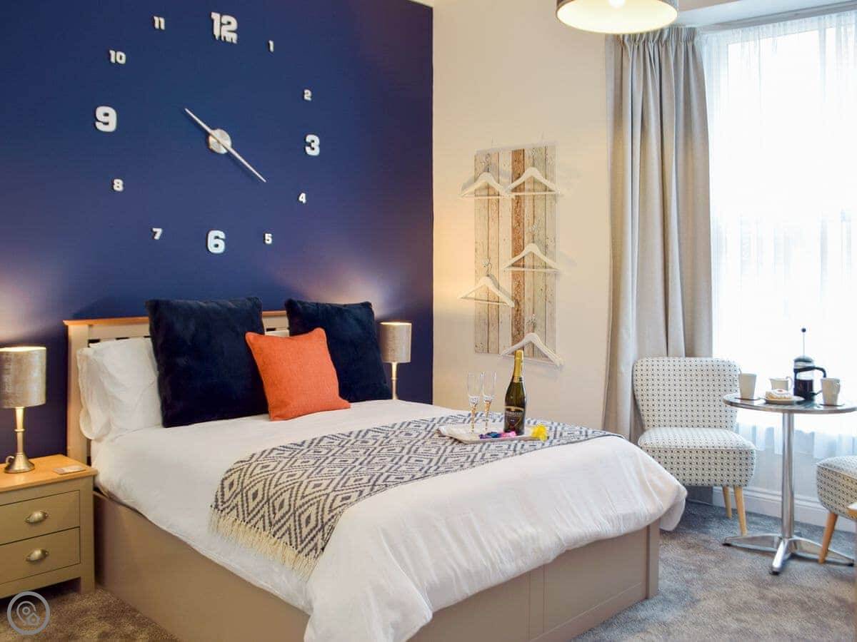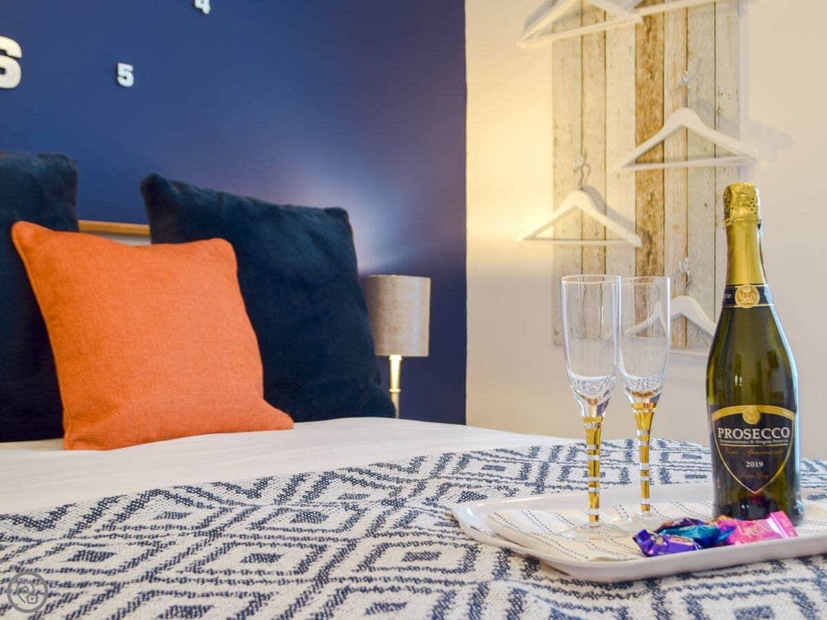 It sleeps two. One bedroom, one en-suite shower room. It's got a 4 Star rating. The bed's comfortable and the ceilings are high, which makes the open-plan living space feel bigger than it is.