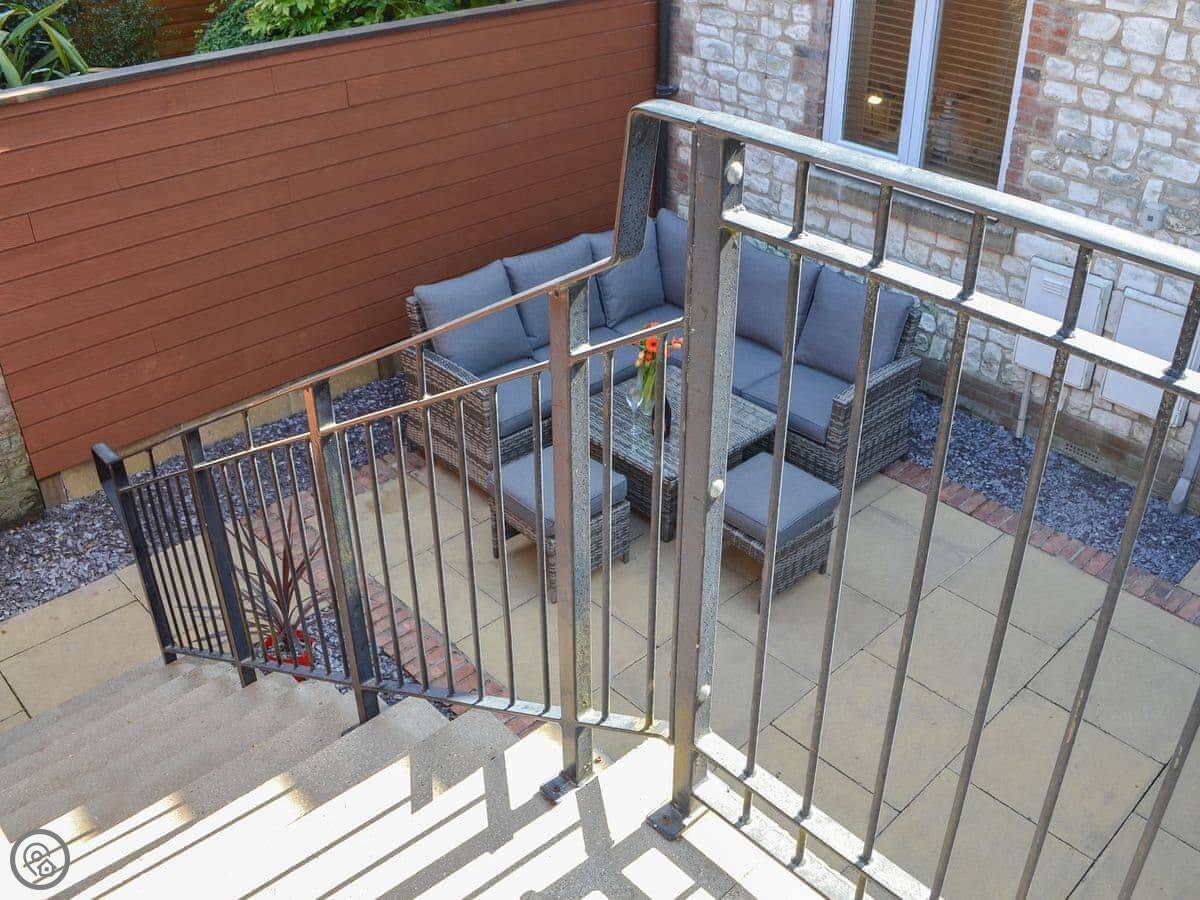 The layout is a bit different. The two bedrooms are on the ground floor. The living room and kitchen are on the first floor. The stairs are standard, not too steep. There's a small enclosed courtyard out the back. It gets the sun in the morning.