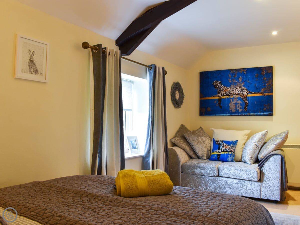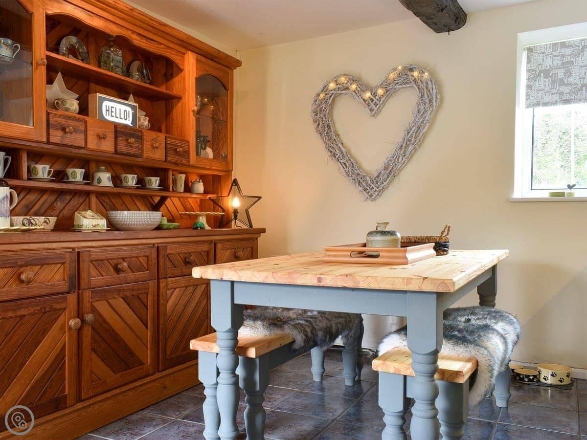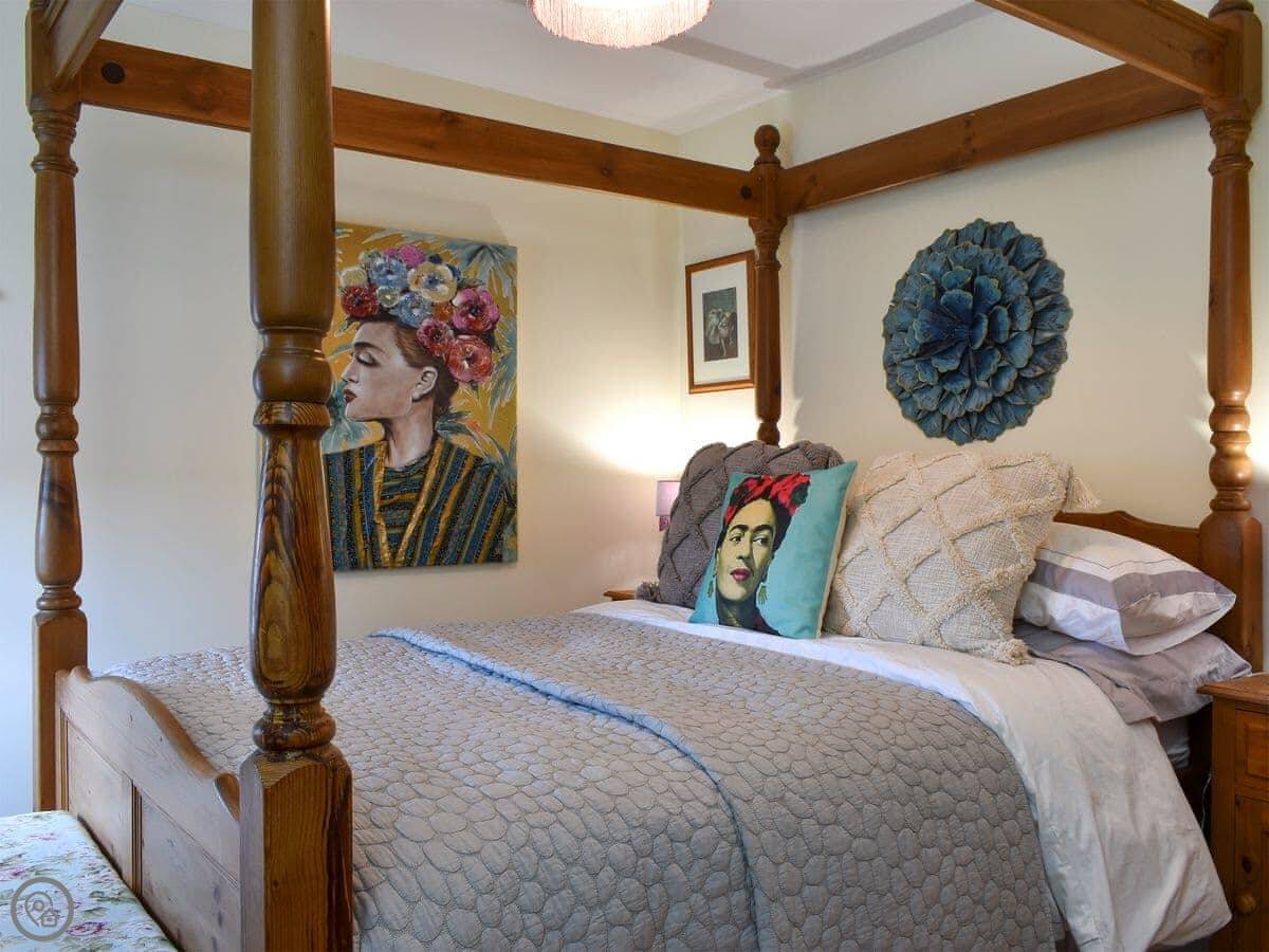Inside, it's been done up nicely. The kitchen has a table and the living room has sofas. Upstairs, the main bedroom has a four-poster bed. The second bedroom is a standard double. The bathroom has a shower over the bath.