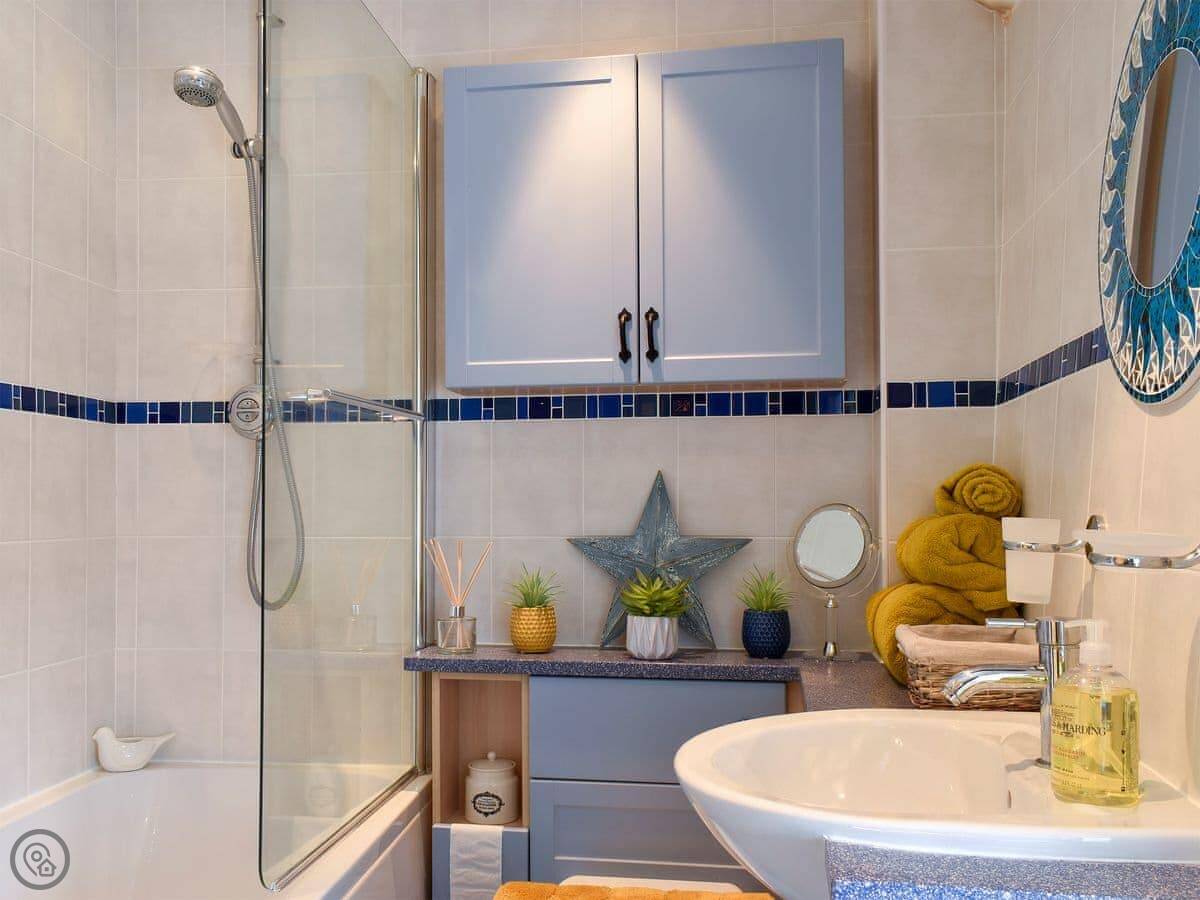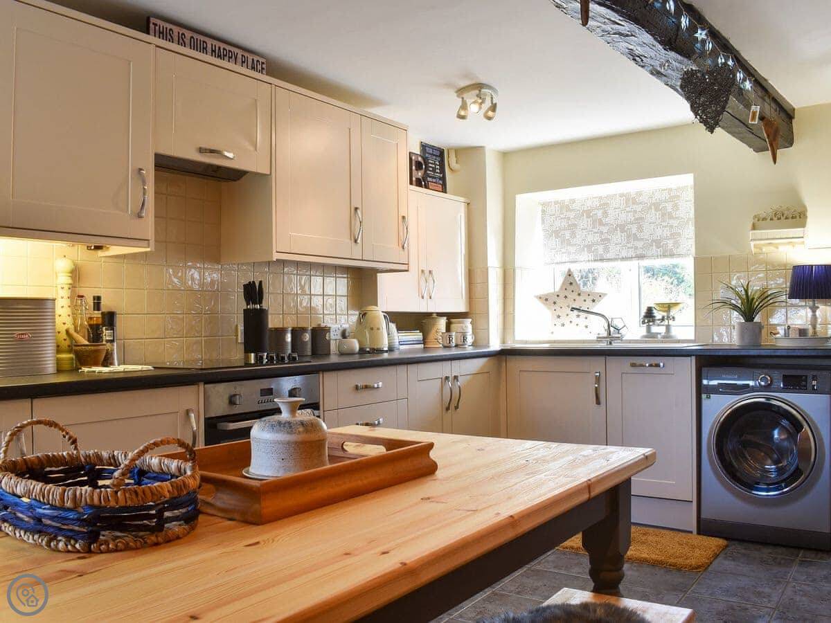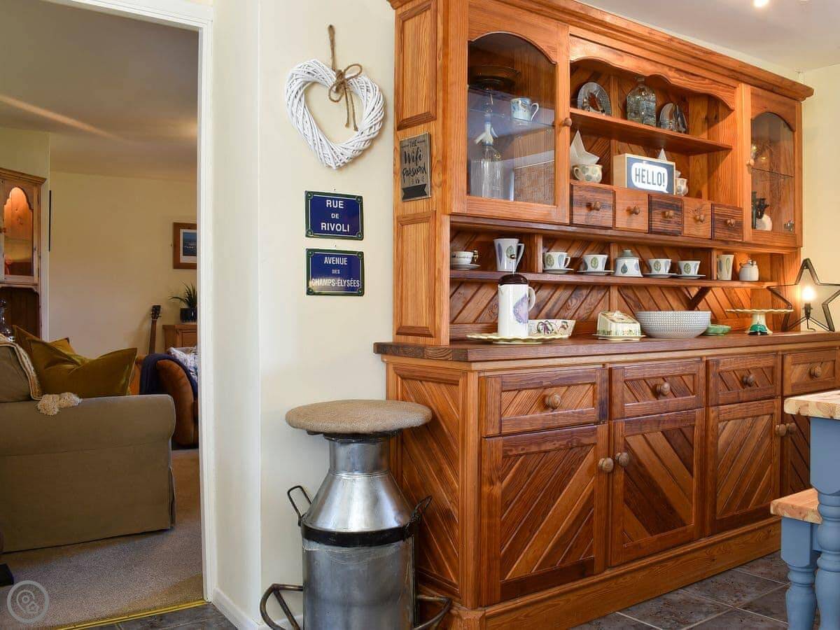 Inside, it's been done up nicely. The kitchen has a table and the living room has sofas. Upstairs, the main bedroom has a four-poster bed. The second bedroom is a standard double. The bathroom has a shower over the bath.