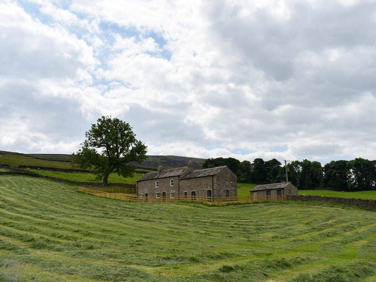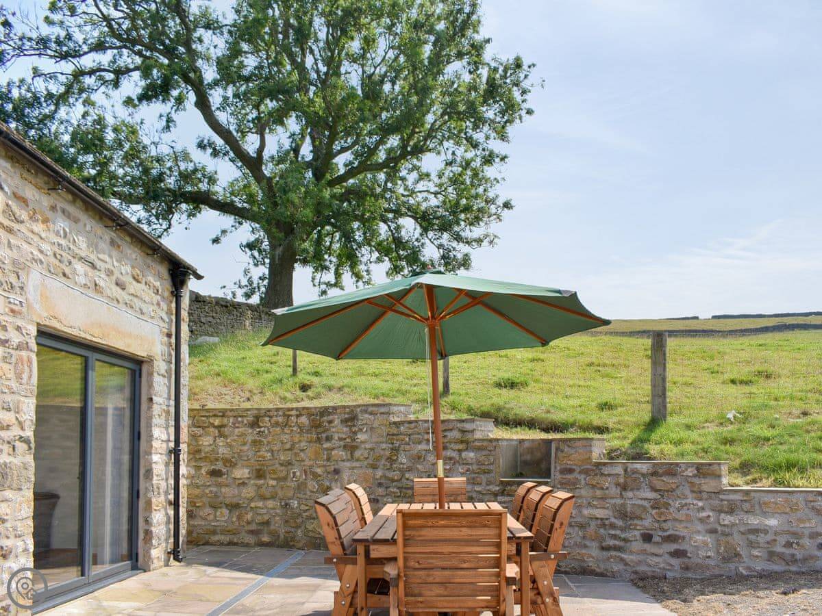 The house is on its own, up on a bit of a slope. The views from the front are very good, across the dale. There's a patio out there with furniture.