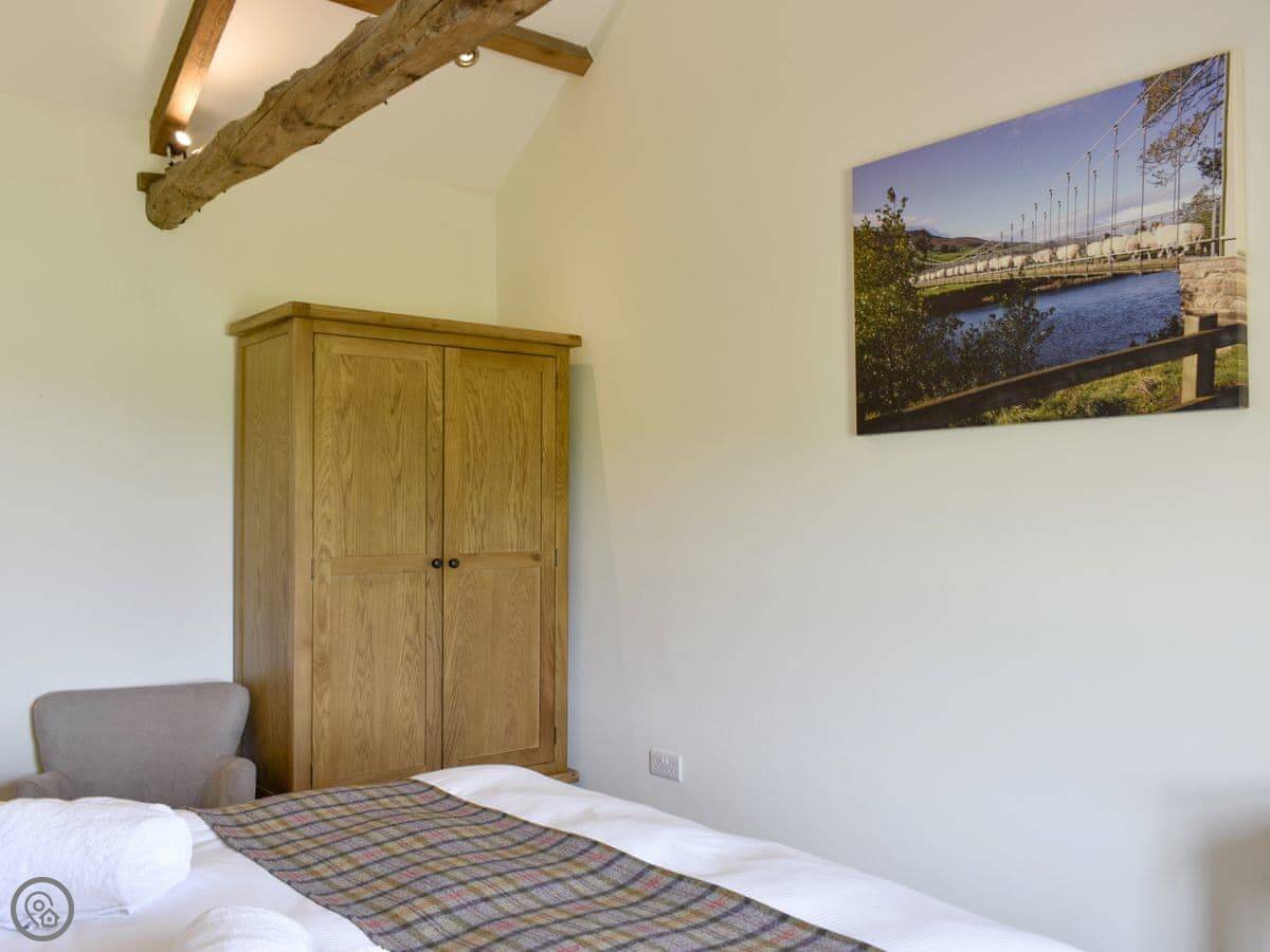 Inside, it's a modern build but done in a cottage style, with oak beams and stone. The main living room has a wood burner. There's a dining room with big doors that open up. One bedroom is on the ground floor with its own bathroom. Upstairs, there's a twin room with a TV, which is handy if you've got children with you.