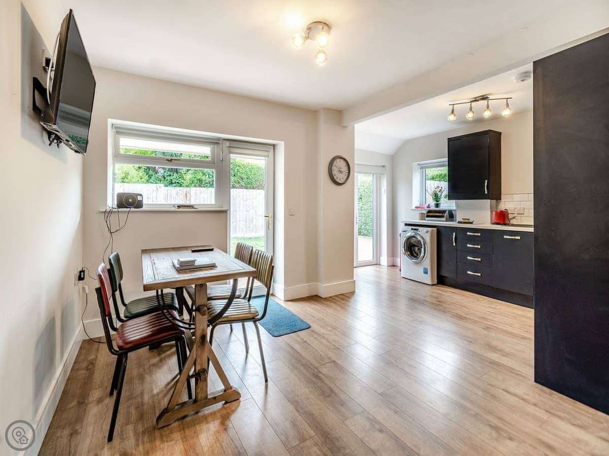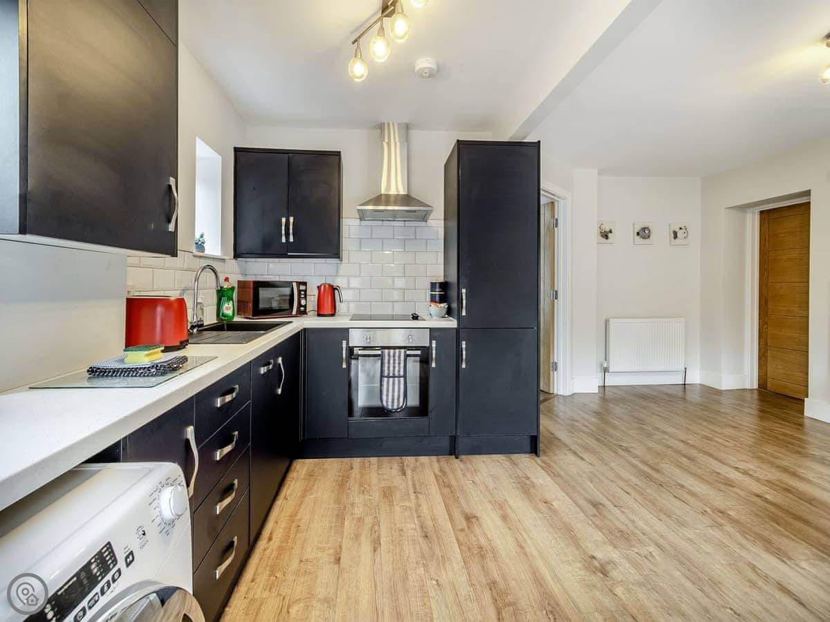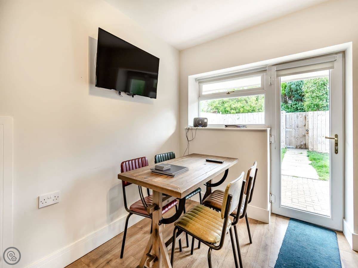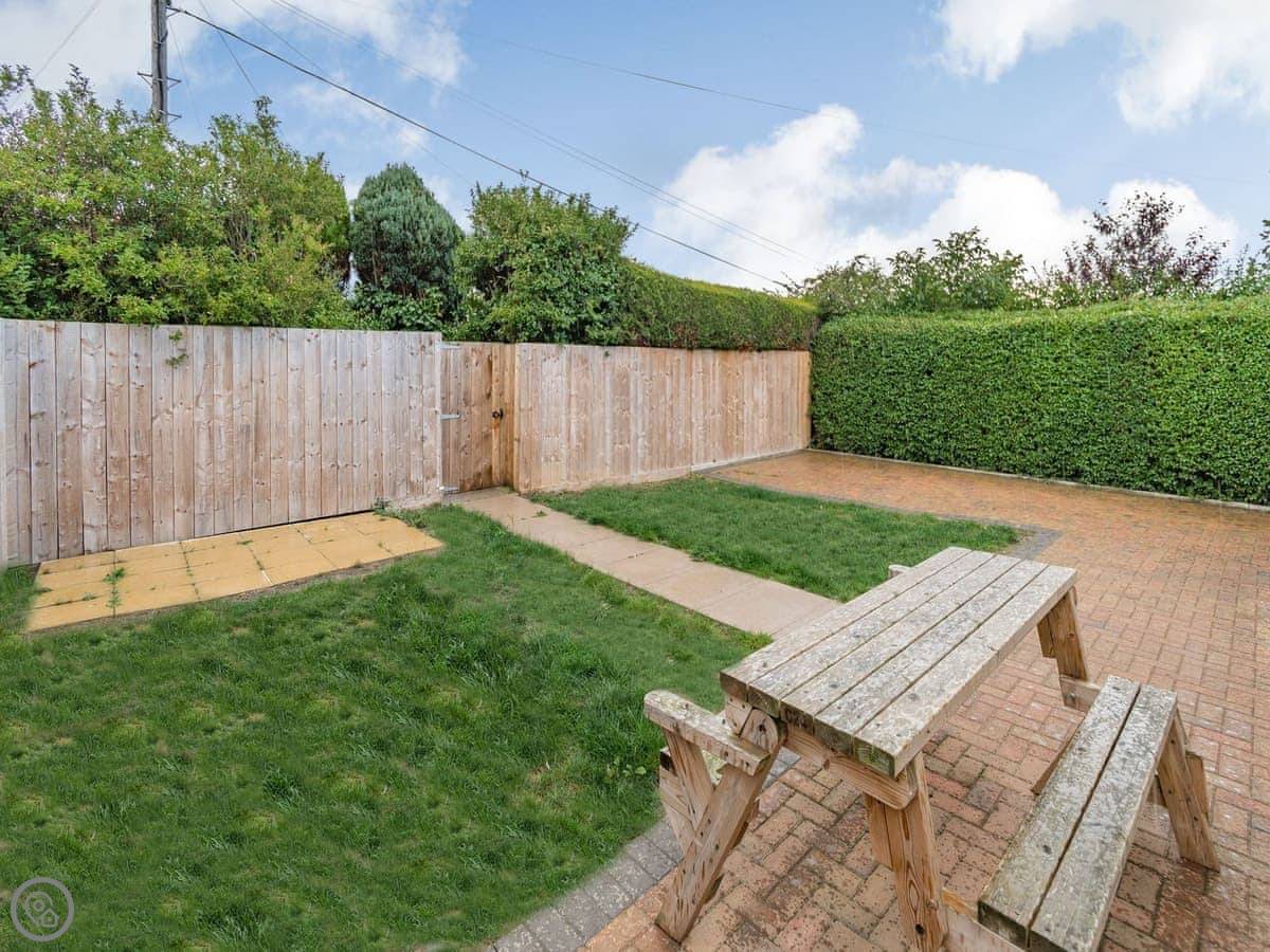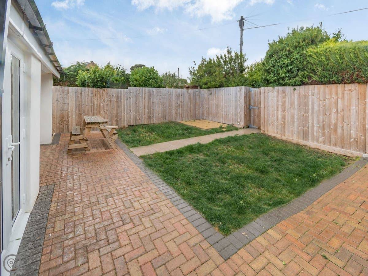 The kitchen is big. There’s a dishwasher and a washing machine. The living room has a TV. The doors from the kitchen open out to the back garden, which is private and gated.