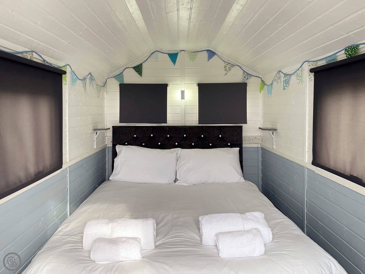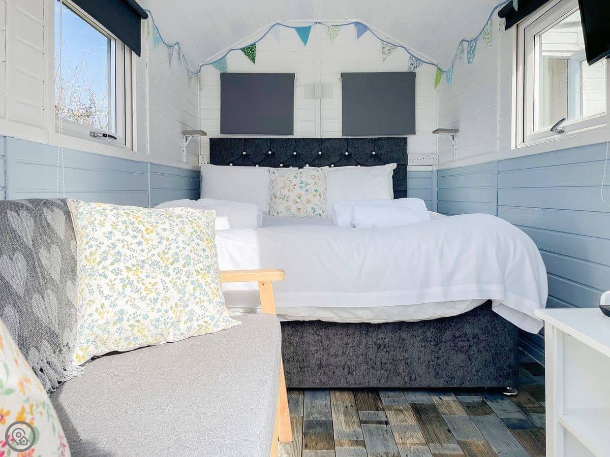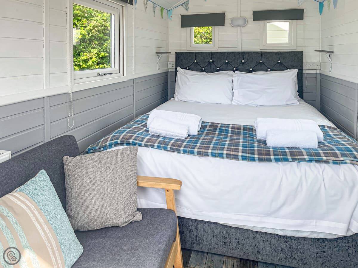 It's built for two people. You get the hut itself, which has a kingsize bed and a small sofa. Your kitchen is in a separate little hut next door, with a table. Your bathroom is tucked away in its own tiny shed behind that. It's cosy.