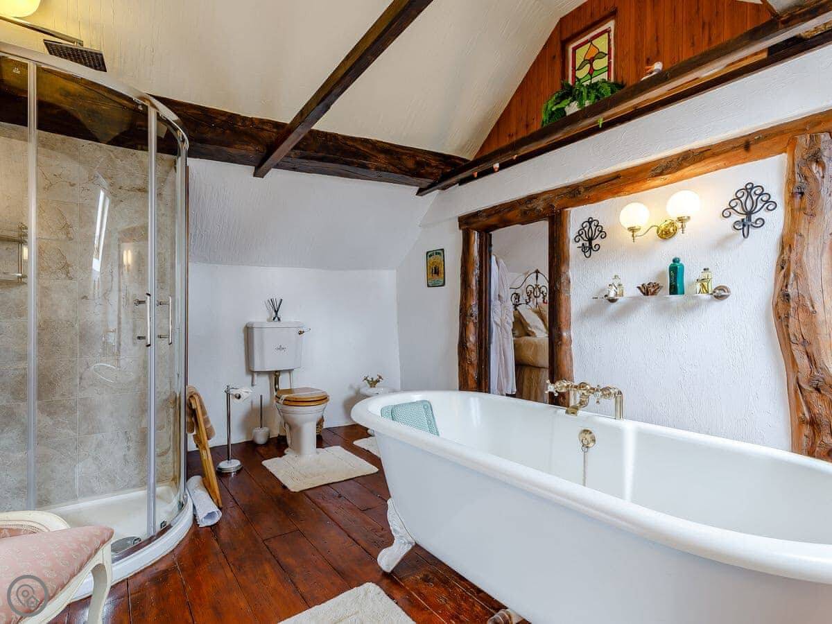 It's a cottage for two, one bedroom and one bathroom. It's got a four star rating, which means it's comfortable and well-finished. It's on two floors. The stairs go up to the bedroom, which has a high ceiling. Downstairs is open plan with a wood burning stove. There's a proper roll-top bath upstairs, and bubble bath is provided.