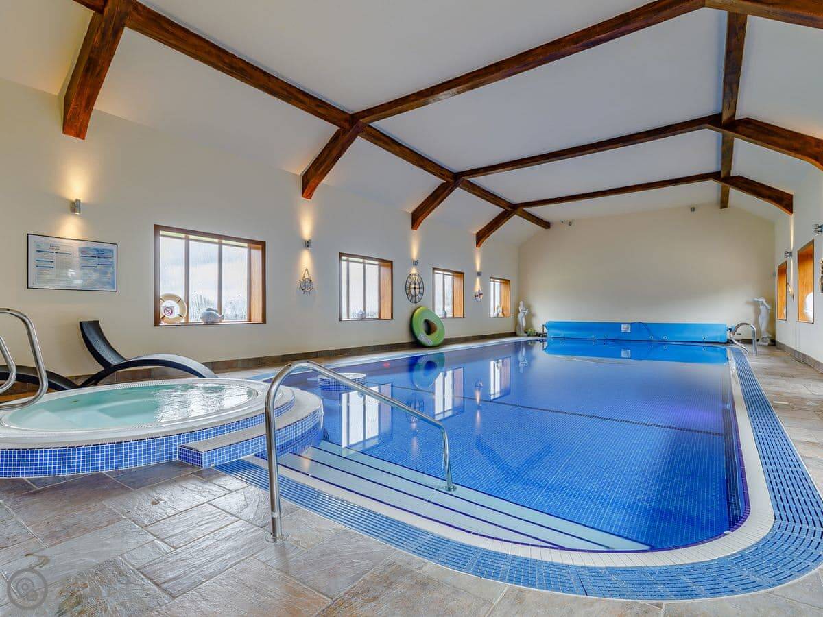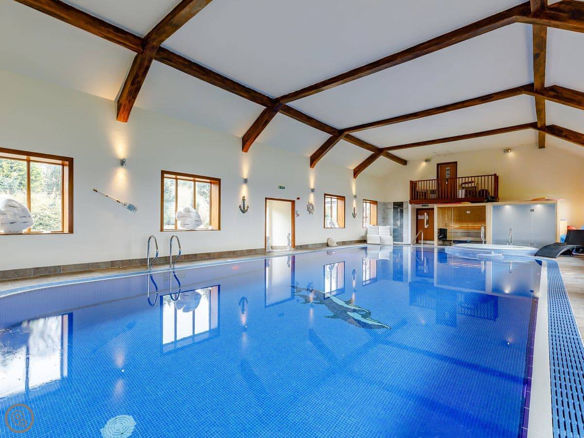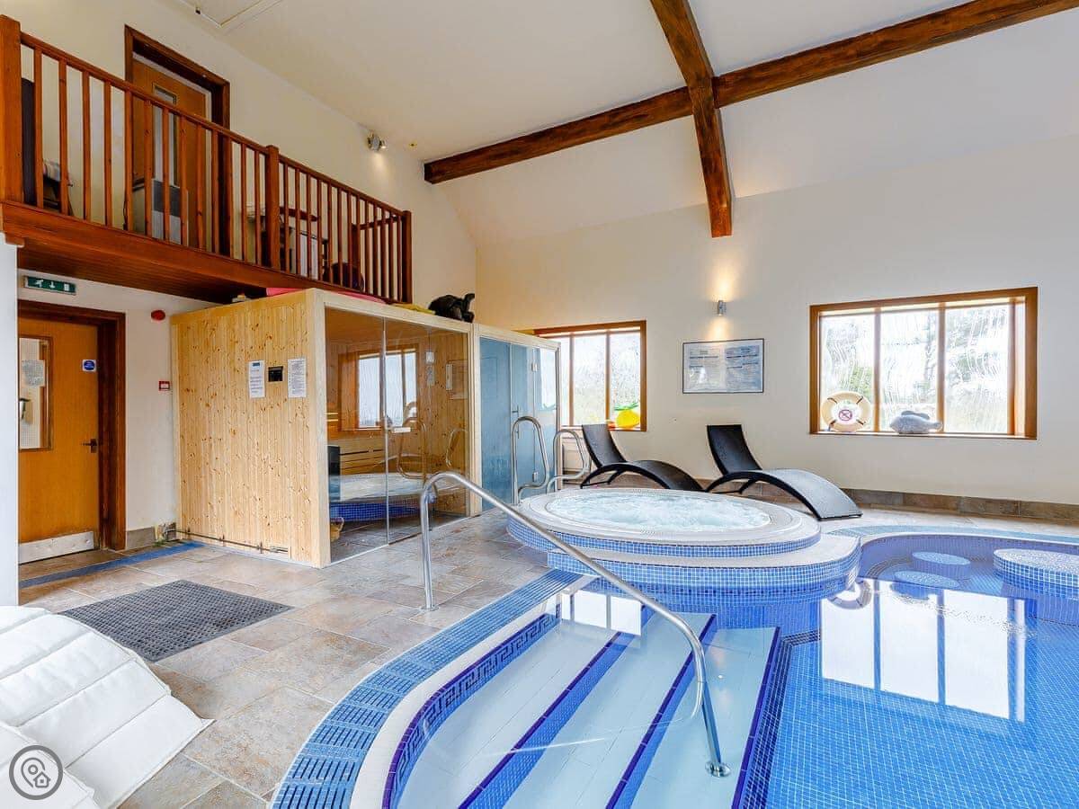In terms of what's here: there's parking, WiFi, TV, bedding and towels are included. The property is wheelchair accessible to the ground floor only. The swimming pool and hot tub are shared with other guests on the estate, but you book a private slot.